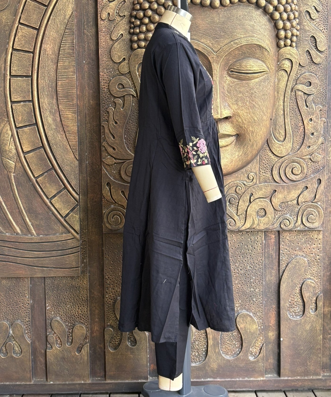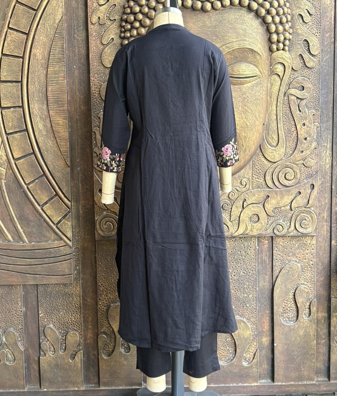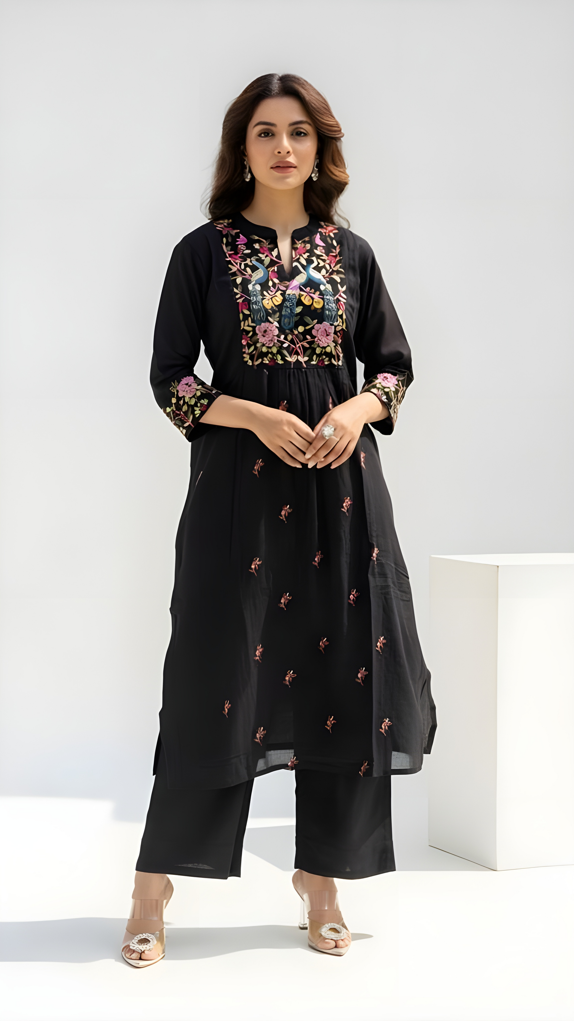 Unleash your inner elegance with this timeless black bloom coord set, featuring exquisite floral and peacock embroidery that paints a picture of sophisticated charm.