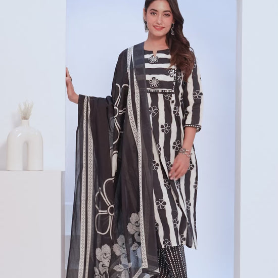 Step into a world of monochrome elegance with this captivating black and white suit set. The striking contrast of bold stripes and delicate floral prints creates a modern and timeless aesthetic. This three-piece ensemble is a celebration of classic style, perfect for the woman who appreciates sophistication.
