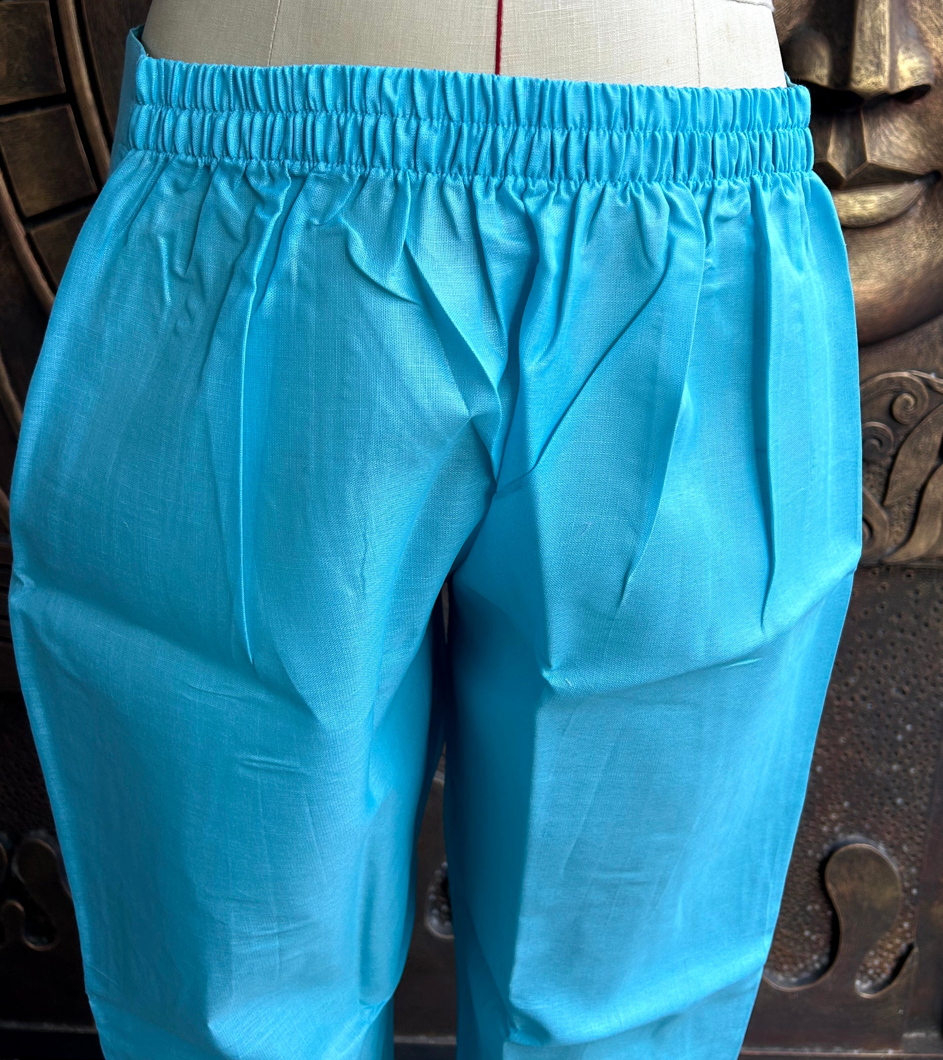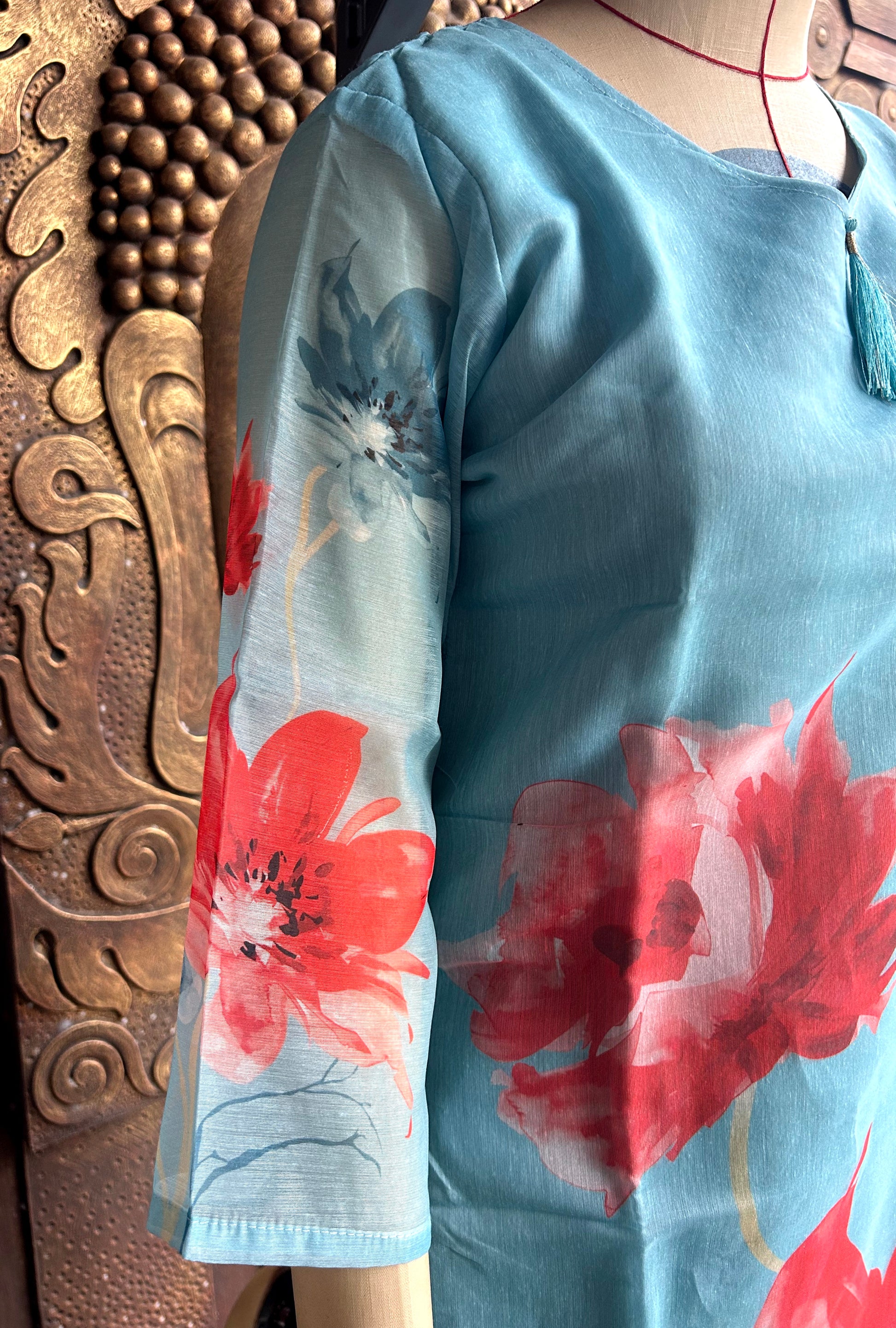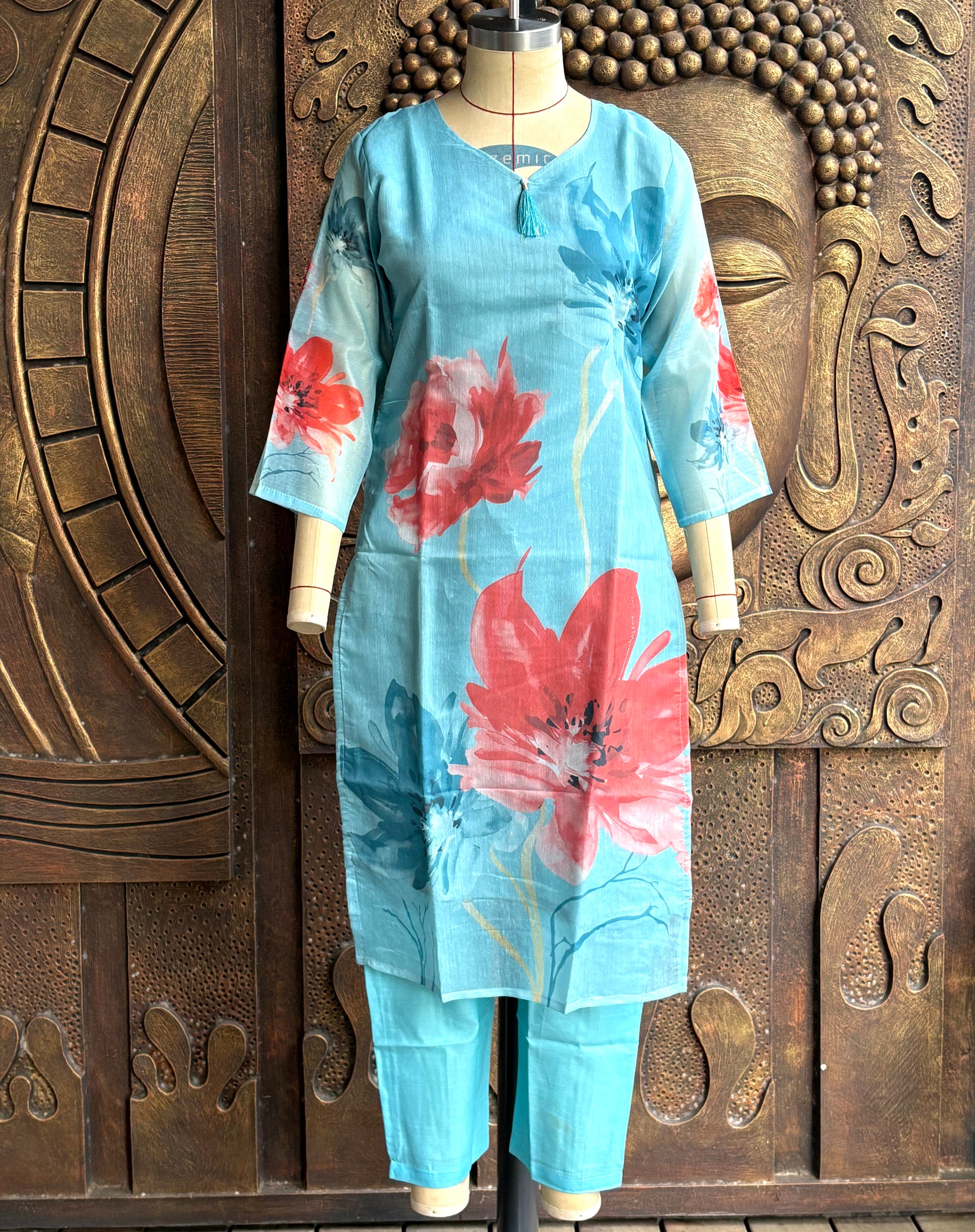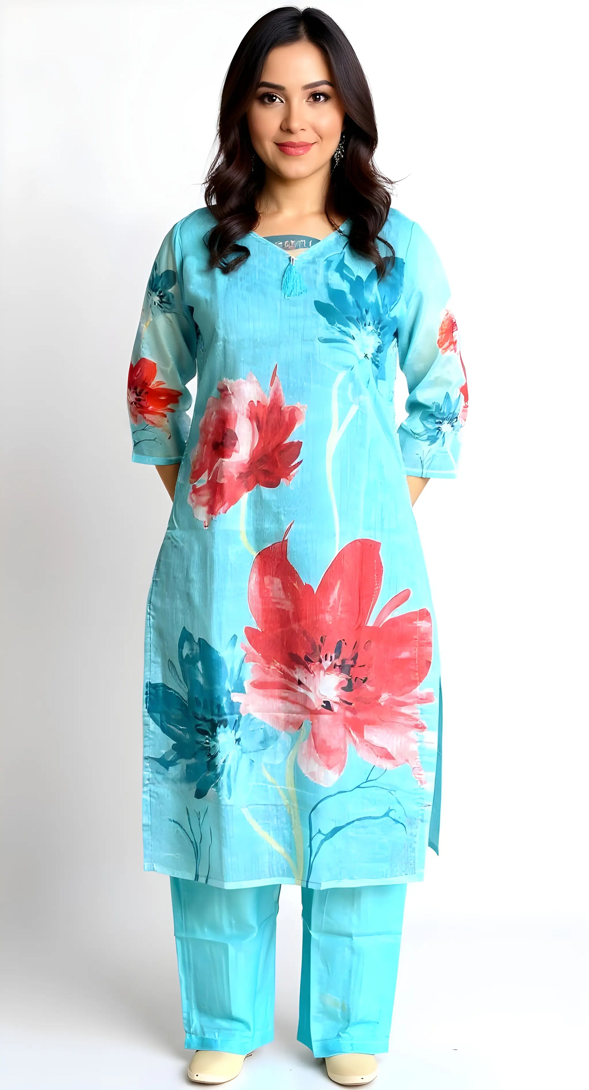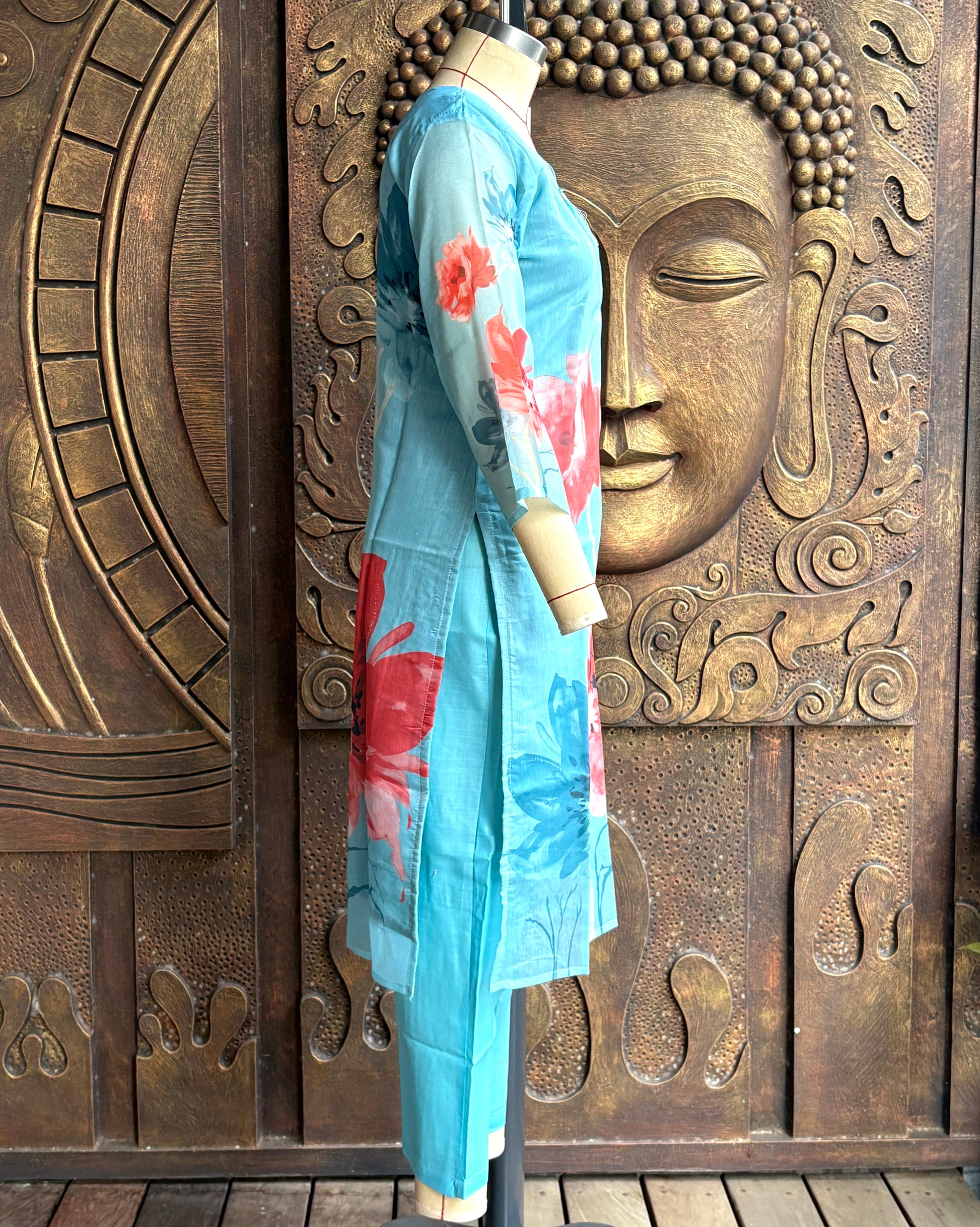 Feel the refreshing breeze in this serene sky-blue floral suit set. The captivating digital floral prints in bold red and blue hues add a modern, artistic touch to the ensemble. Crafted for comfort and effortless style, this cotton kurta set is your perfect companion for a laid-back and elegant look.