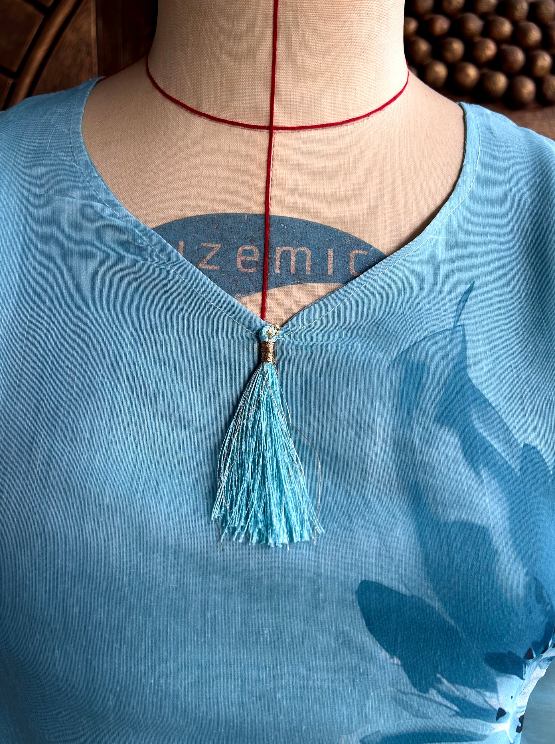 - Prints/Details: The outfit features large-scale digital floral prints. The round neckline has a subtle tassel detail.
