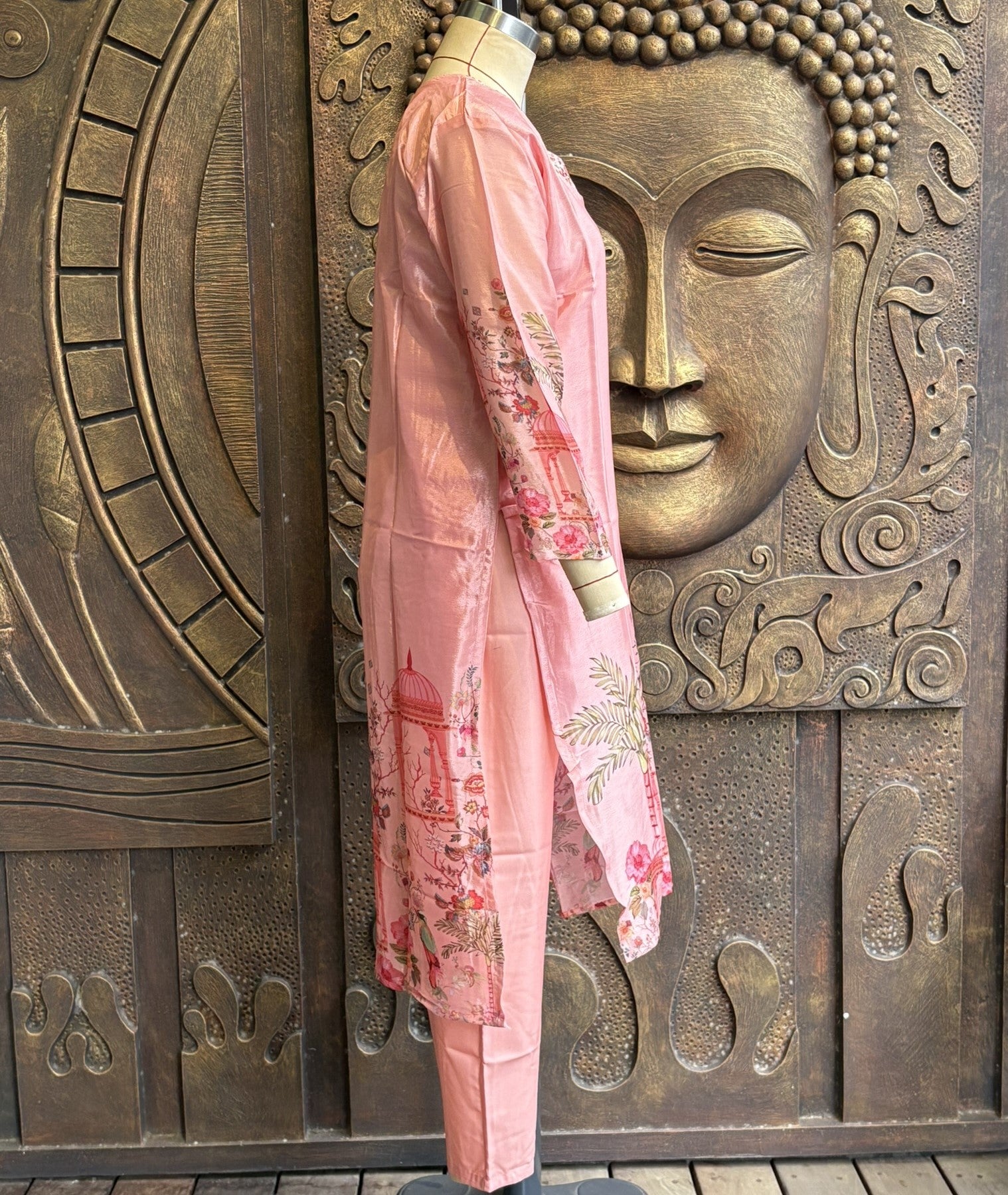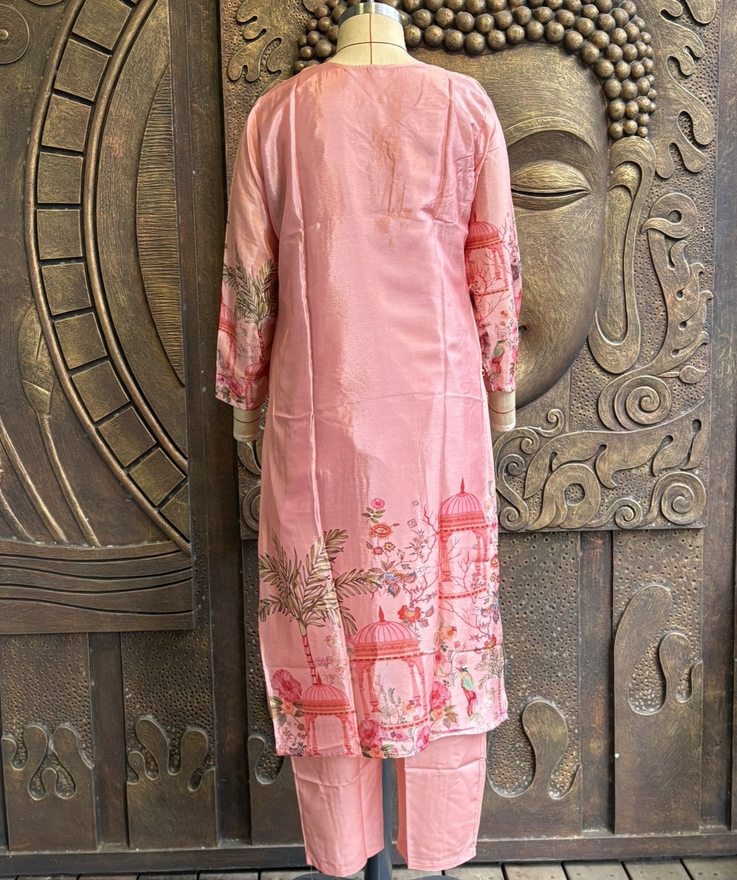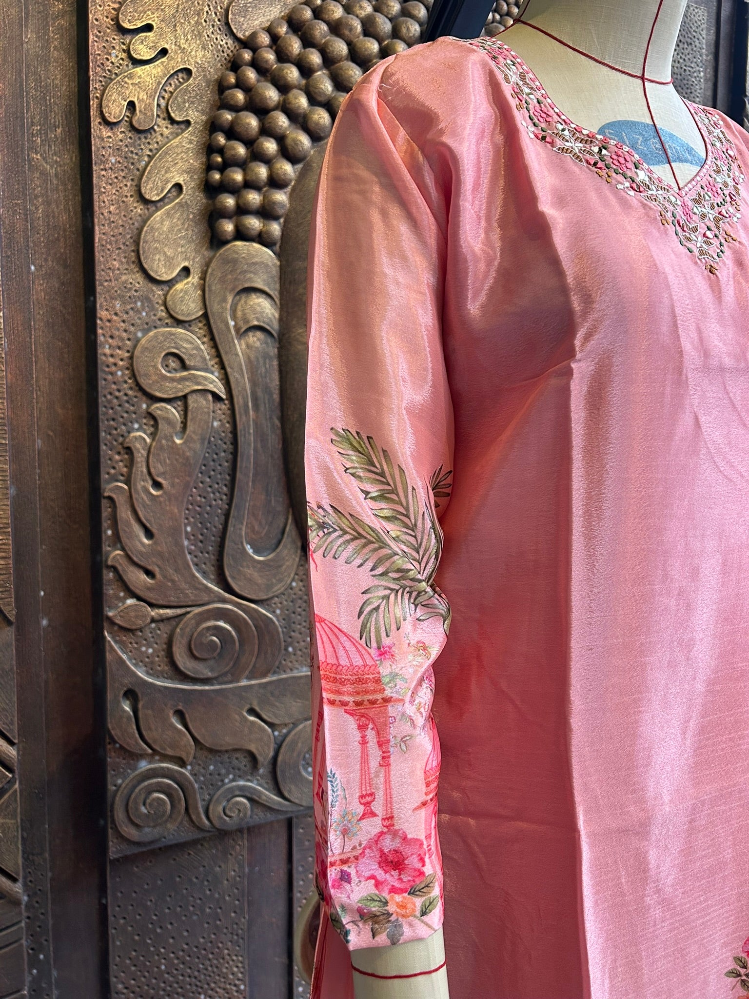 Drift into a dream in this enchanting salmon pink three-piece suit set. The delicate floral and tree prints on the sleeves and dupatta add a touch of nature-inspired elegance. Complete with a beautifully embroidered neckline, this outfit promises effortless grace and comfort for any special occasion.