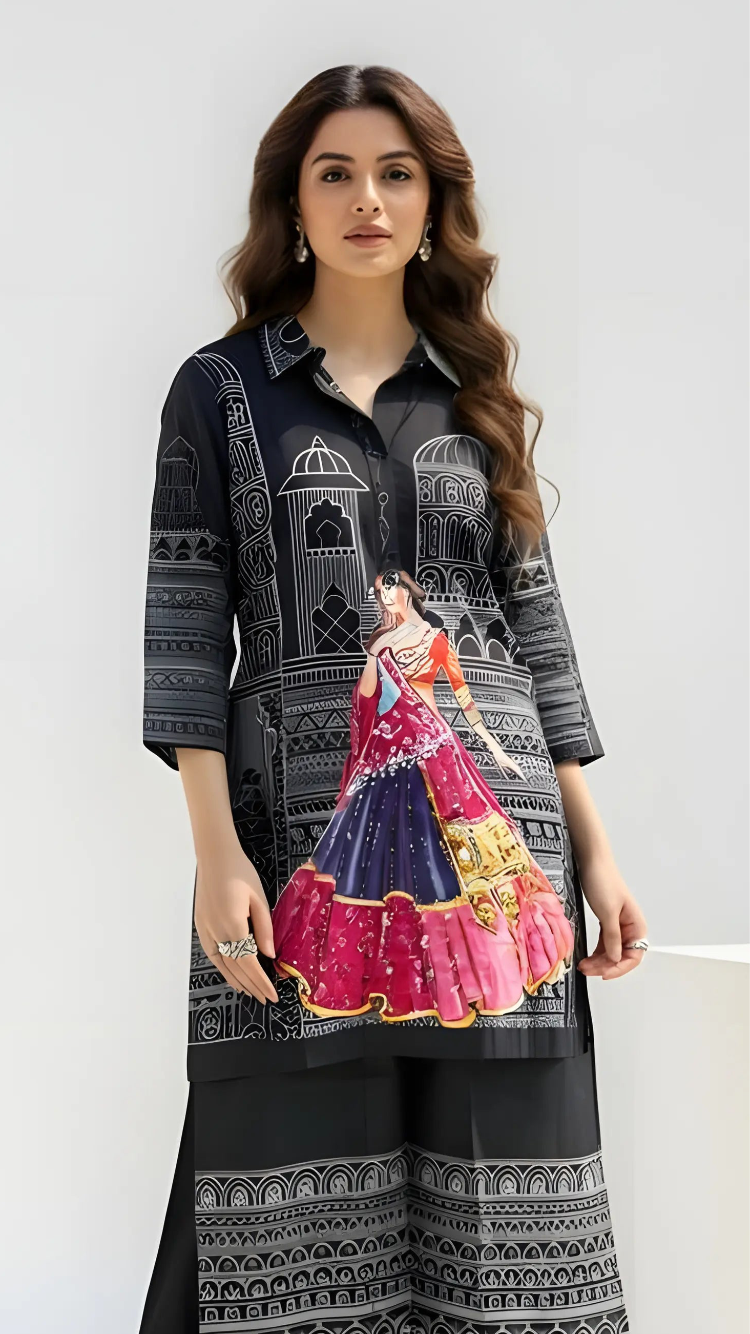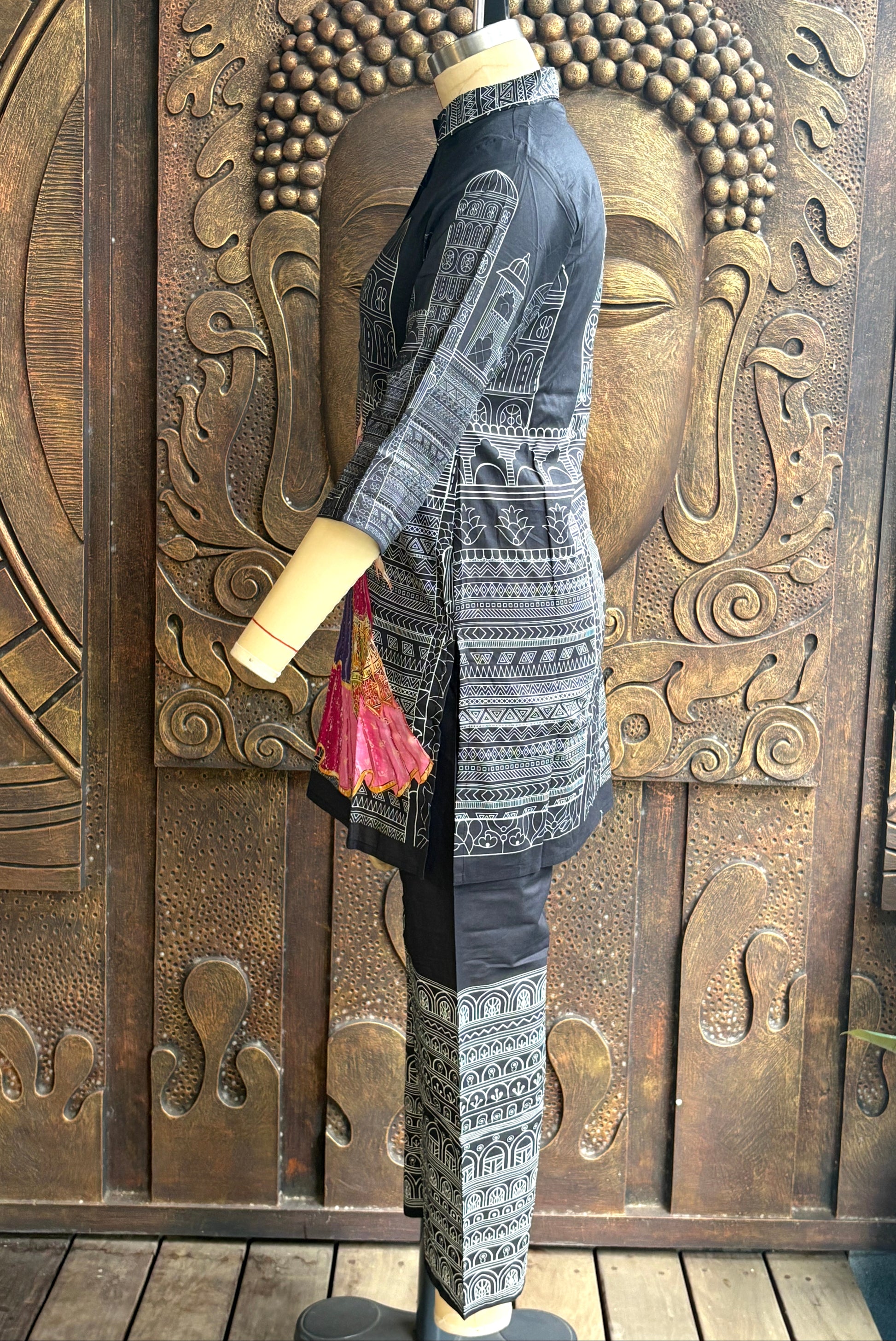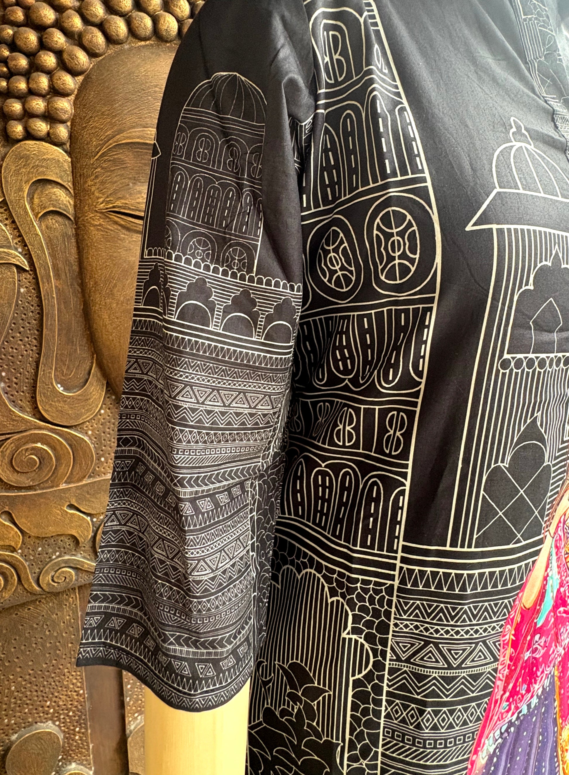 Celebrate heritage in this Black Cotton Coal Heritage Coord set featuring intricate architectural prints and a vibrant Rajasthani dancer motif, blending tradition with modern elegance.