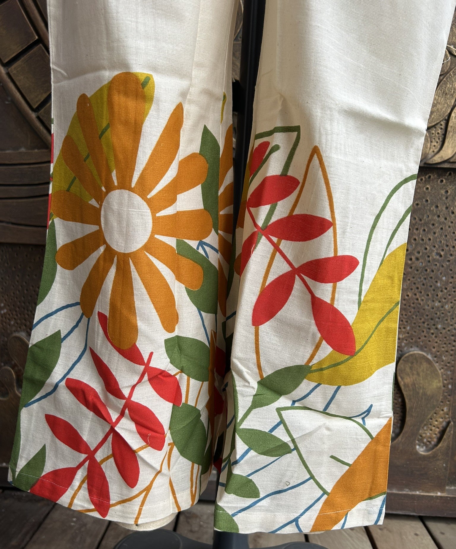 - Prints/Details: The coord set features a bold, large-scale floral and leaf print in shades of orange, green, and red. The kurta has a small patch pocket with a simple embroidered floral detail. The kurta has a classic band collar with a button placket, and the sleeves and bell-bottom pants are adorned with the same large-scale print.