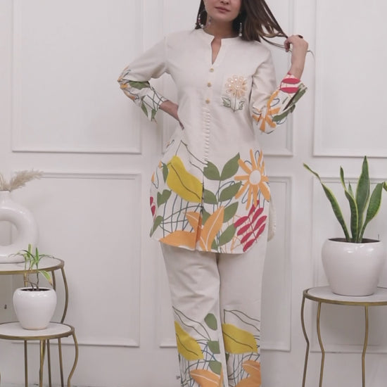 Embrace the joy of nature with this vibrant white coord set, featuring bold, artistic floral and leaf prints for a fresh and modern statement style.