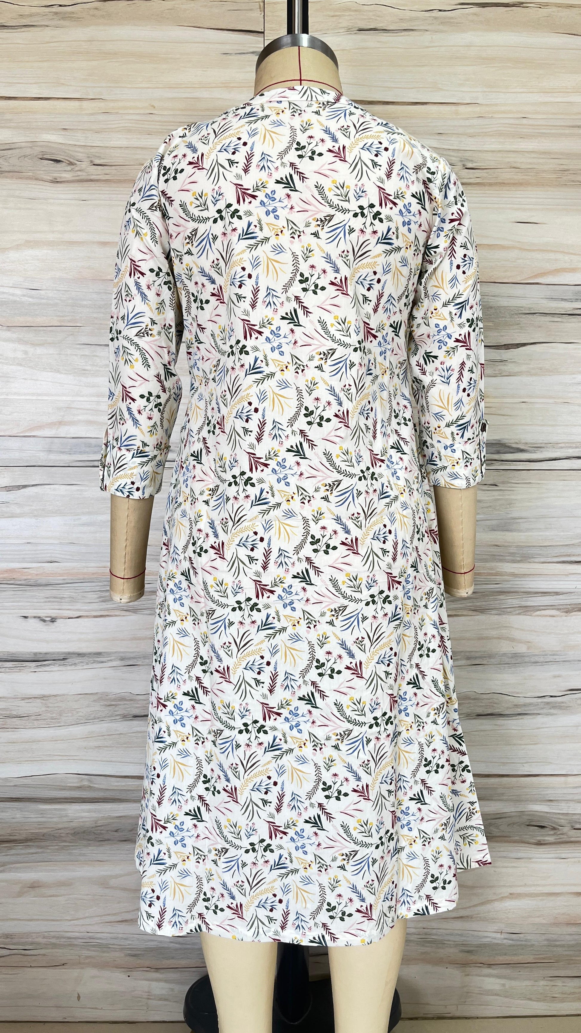- Prints/Details: The dress features a detailed, all-over botanical print with leaves and berries in various colors like green, blue, maroon, and mustard yellow. It has a full-length, button-down placket with small brown buttons.