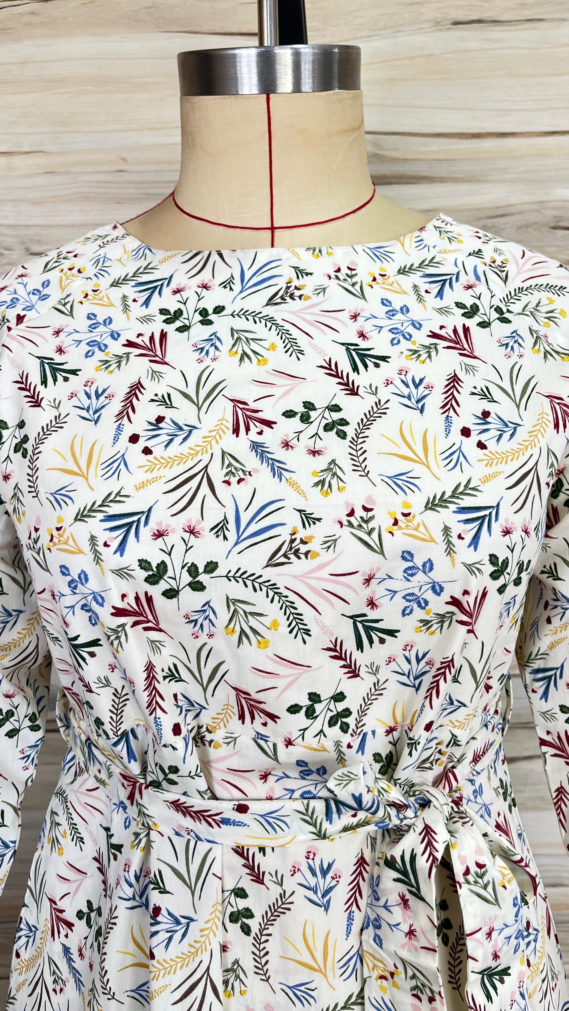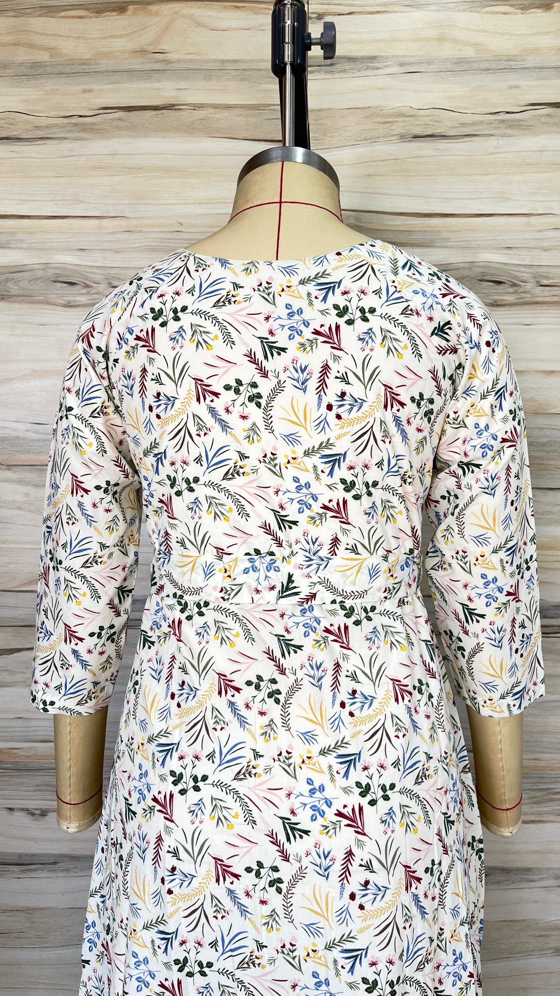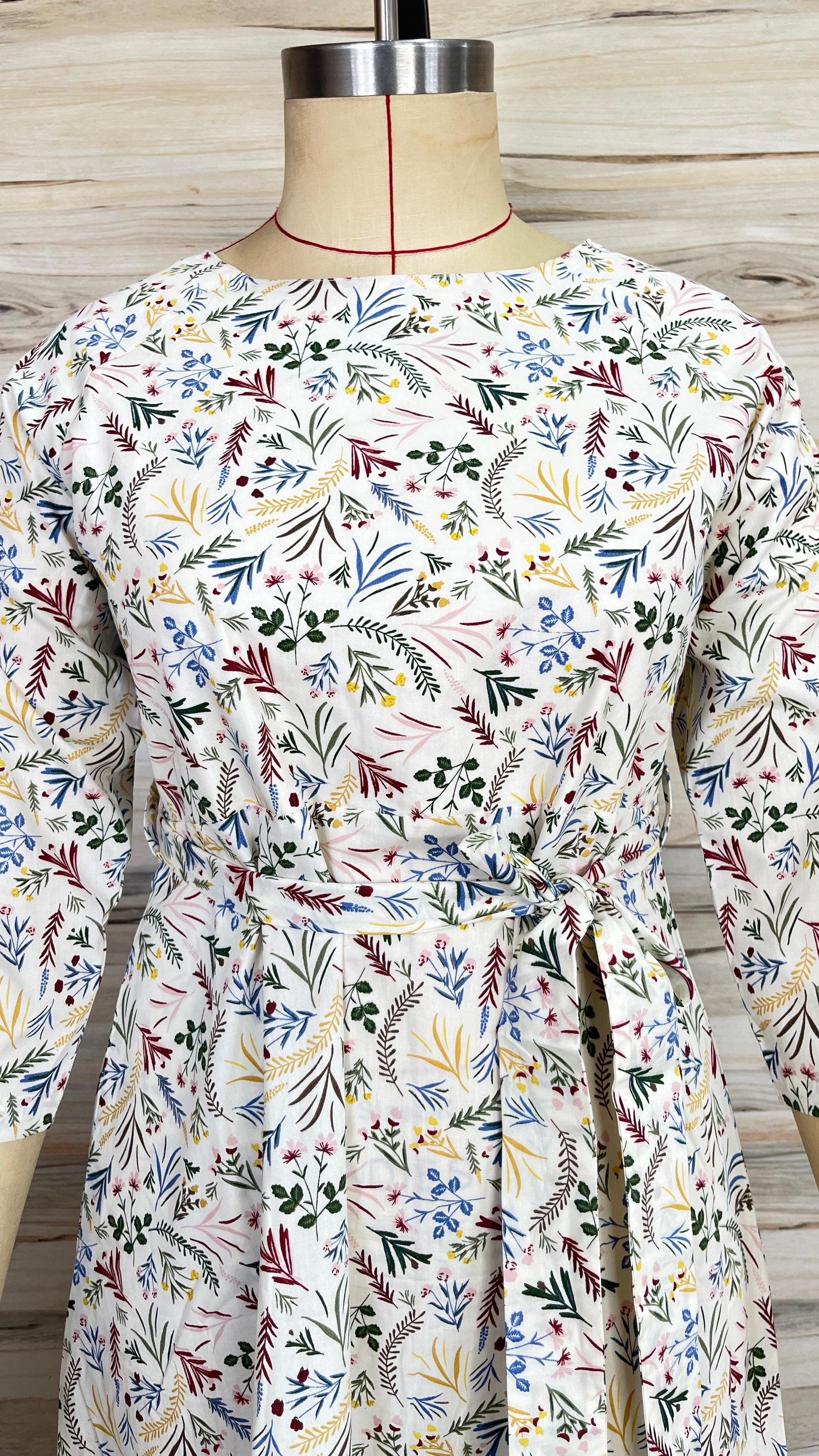 - Prints/Details: A delicate all-over botanical print featuring a variety of leaves and small floral motifs in shades of green, blue, yellow, and maroon.
