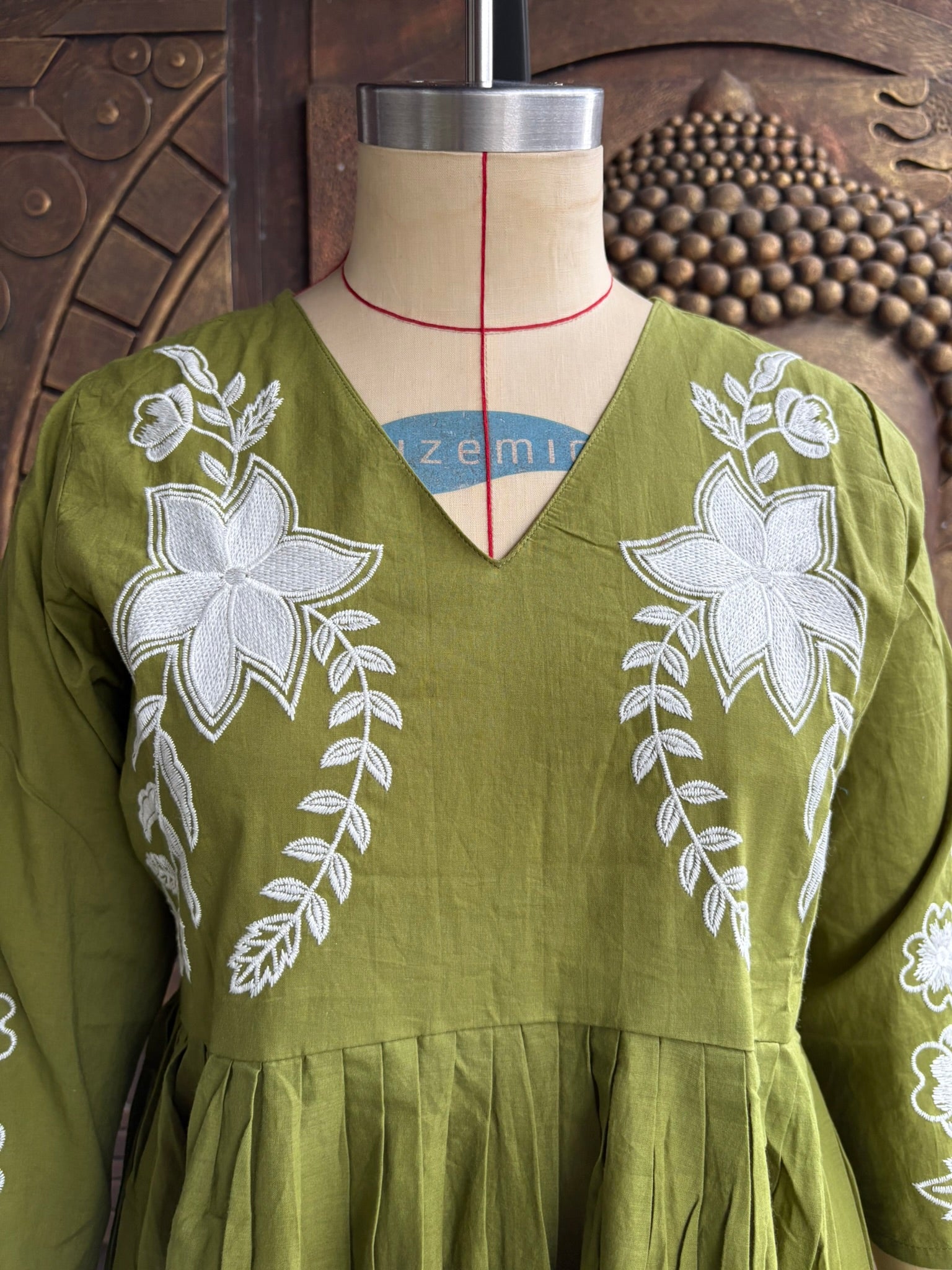 Embrace the tranquility of nature with this serene olive green maxi dress. The delicate white floral embroidery dances across the fabric, whispering tales of blooming gardens. This flowing dress embodies effortless grace and a touch of bohemian charm, perfect for sun-drenched days.