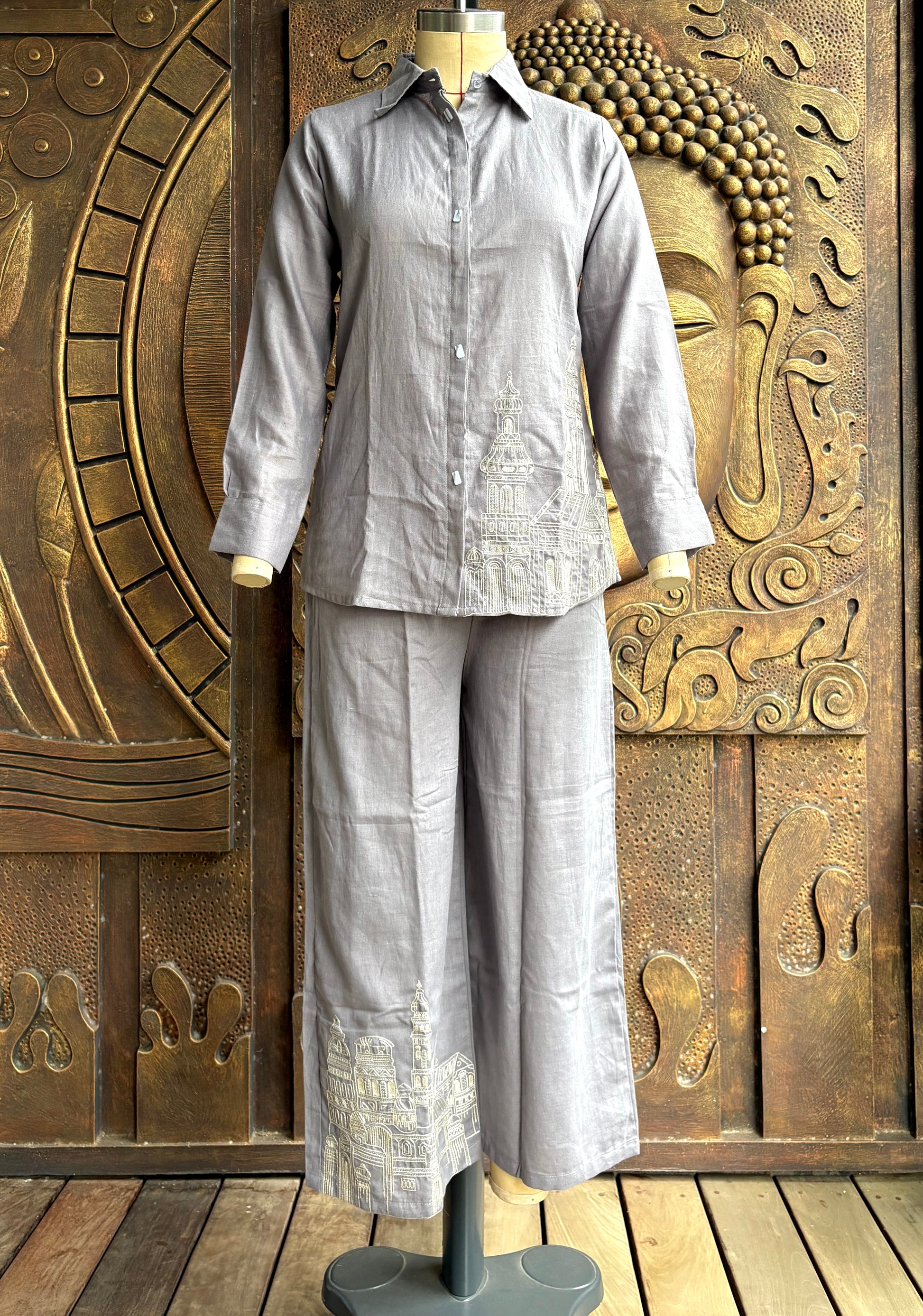 - Prints/Details: The set features delicate architectural embroidery on the front of the shirt and the bottom of the wide-leg pants. The detailed stitching creates a sophisticated, refined pattern.