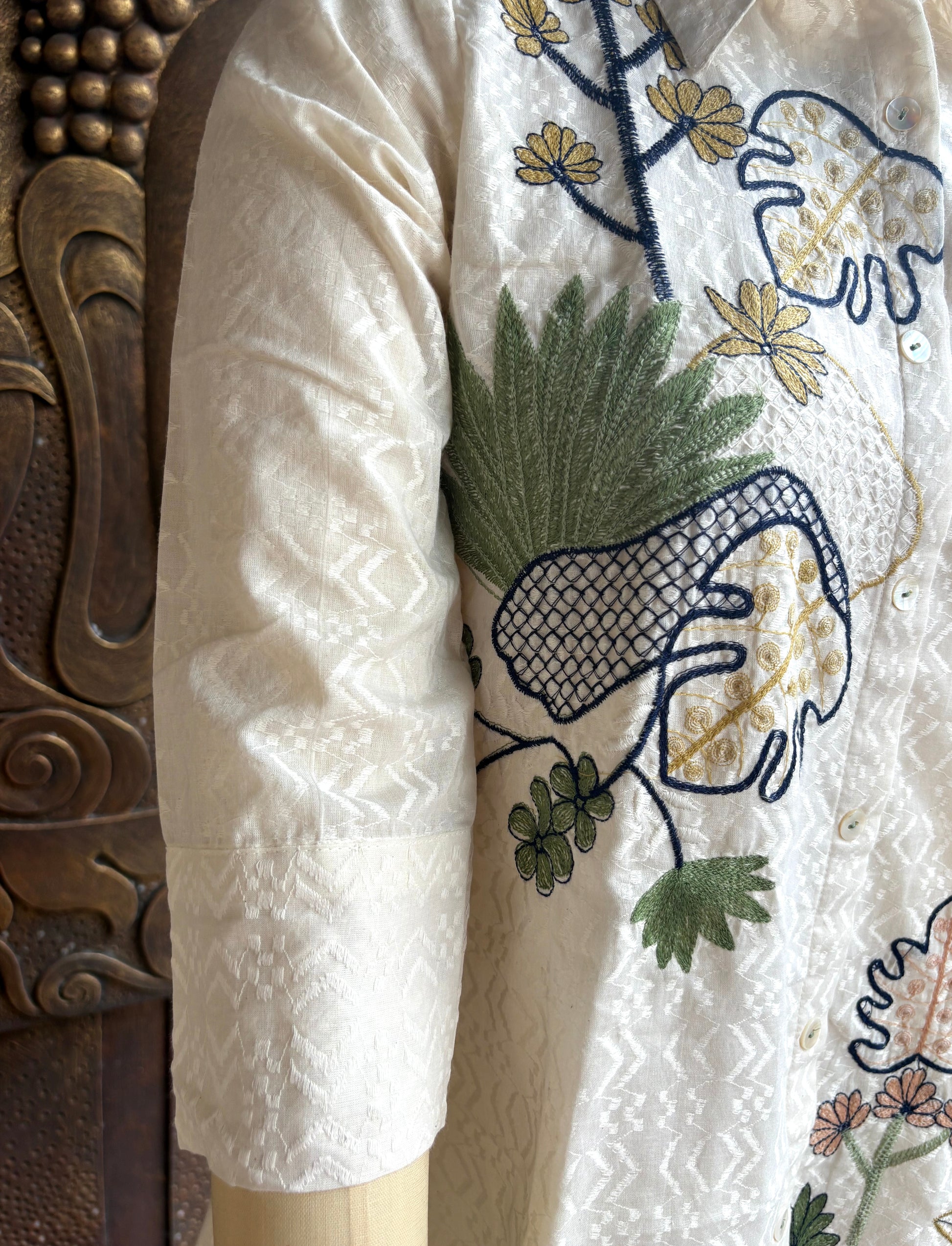 Botanical embroidery, off-white coord set, floral embroidered outfit, women's apparel, casual chic, comfortable fashion, artistic co-ord set, nature-inspired design, breathable fabric, embroidered top and pants.