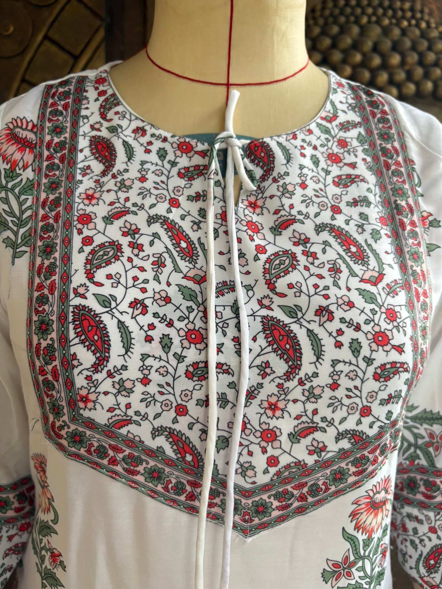 - Color: The primary color of this outfit is a clean white, with intricate prints in shades of red, green, and gray.