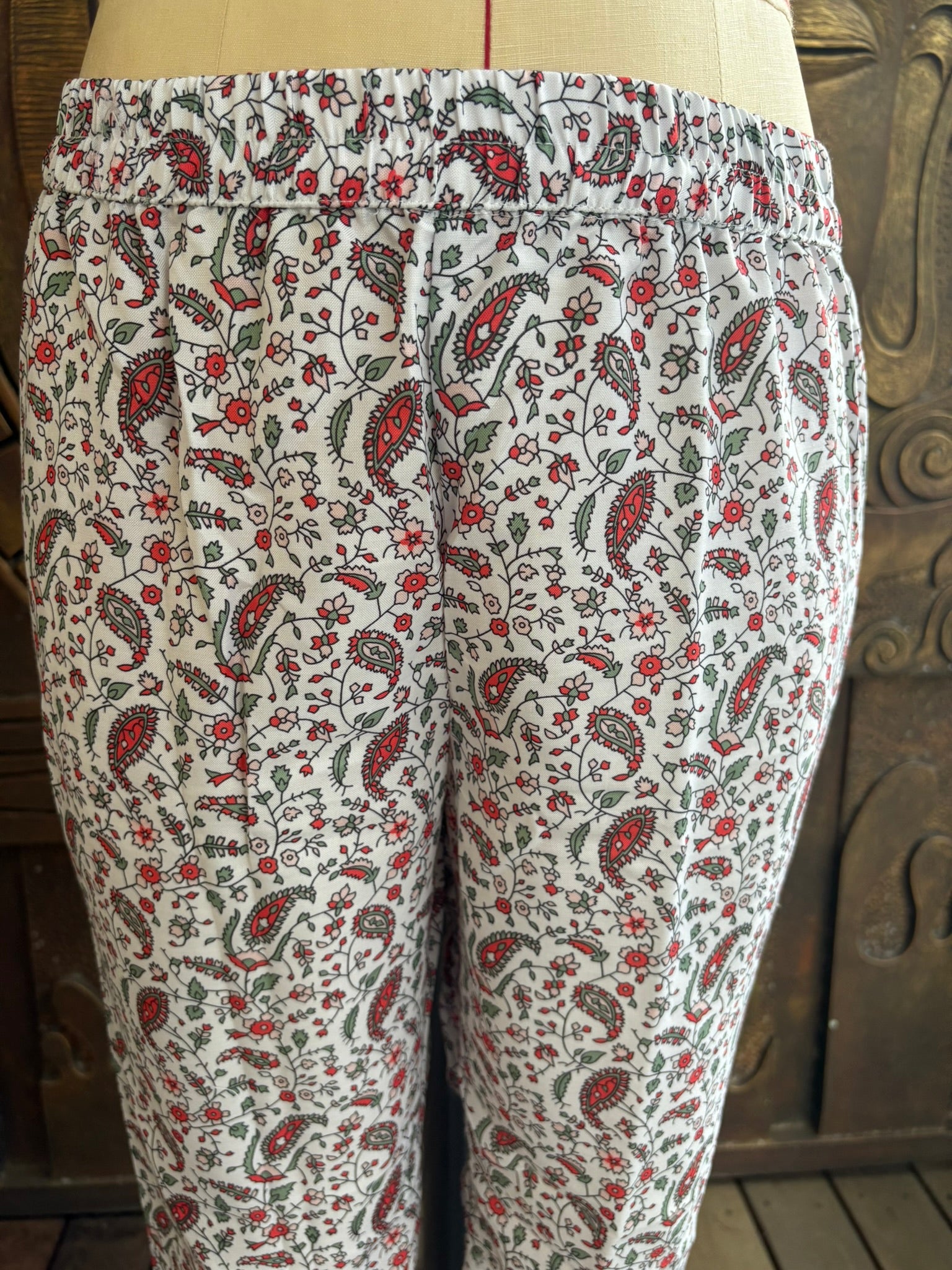 - Prints/Details: This three-piece set showcases an all-over hand-block print. The kurta features a vertical pattern of large floral motifs, and the neckline is highlighted with a detailed border. The dupatta has a bold paisley-like print on its main body with a contrasting patterned border. The trousers match the kurta with a similar floral print.