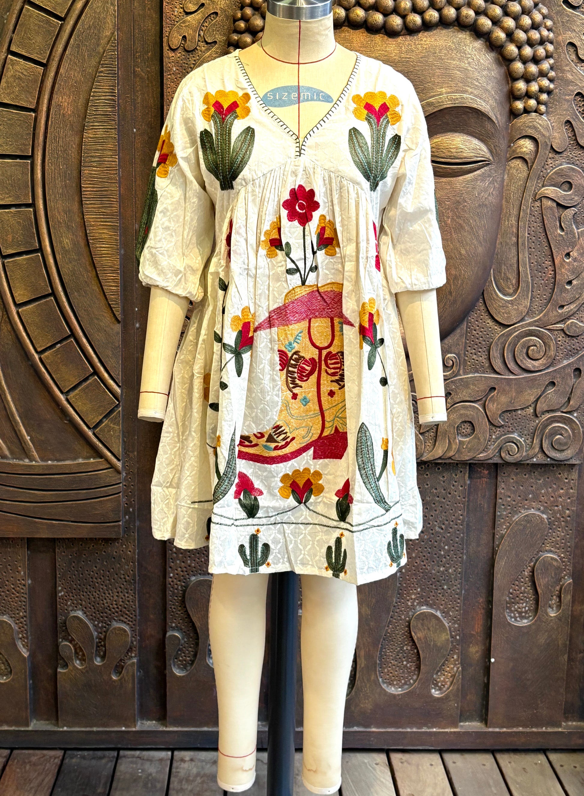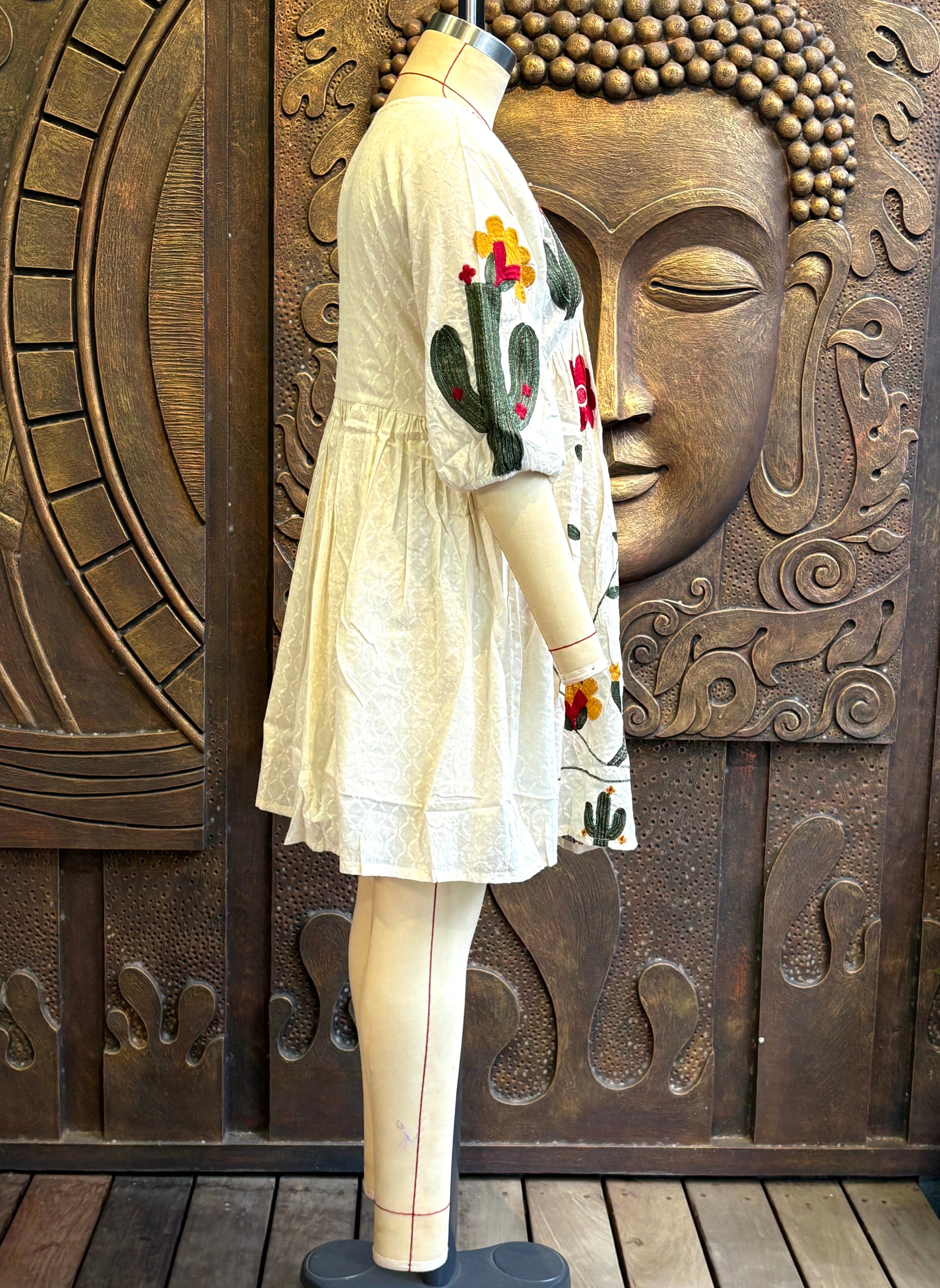 Step into a world of artistic charm with this beautiful embroidered mini dress. The playful floral and cactus motifs are intricately stitched on a comfortable off-white cotton fabric, bringing a handcrafted touch to your look. This whimsical dress is perfect for carefree days and adding a unique, bohemian spirit to your style.