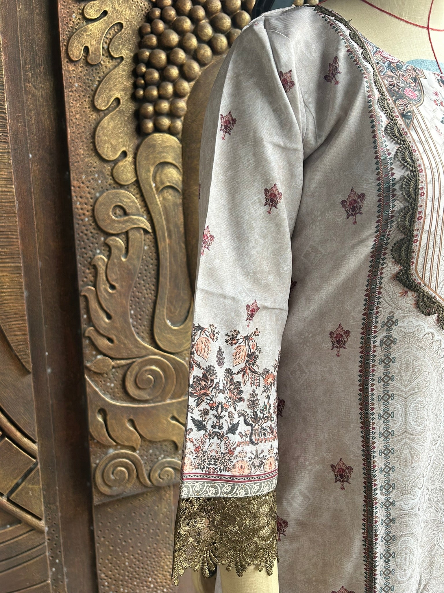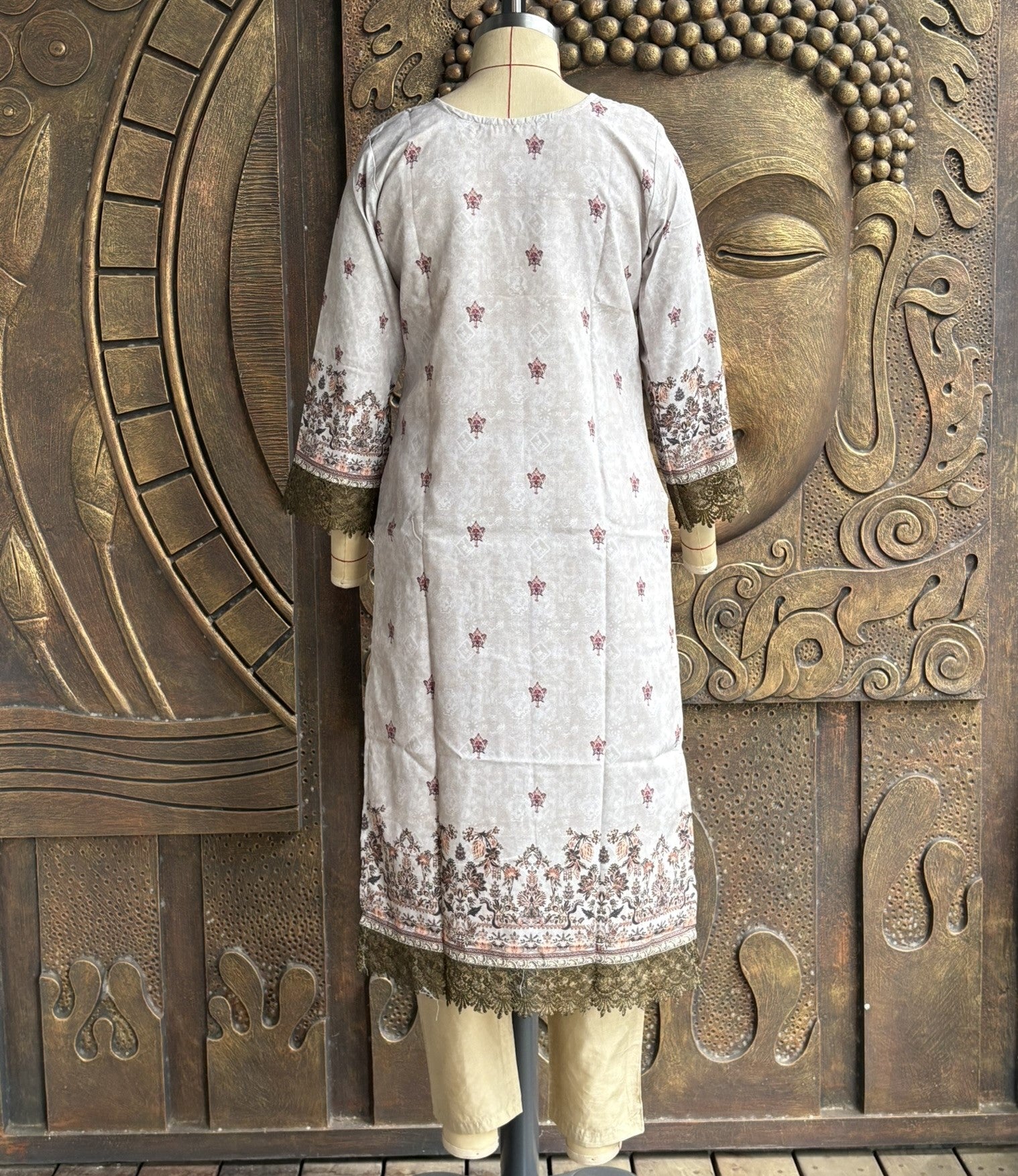 - Prints/Details: The kurta features an intricate paisley and floral print in muted tones of brown and pink. The neckline has a detailed embroidered trim that extends into a V-shape. The dupatta has a large paisley print and a lace border.
