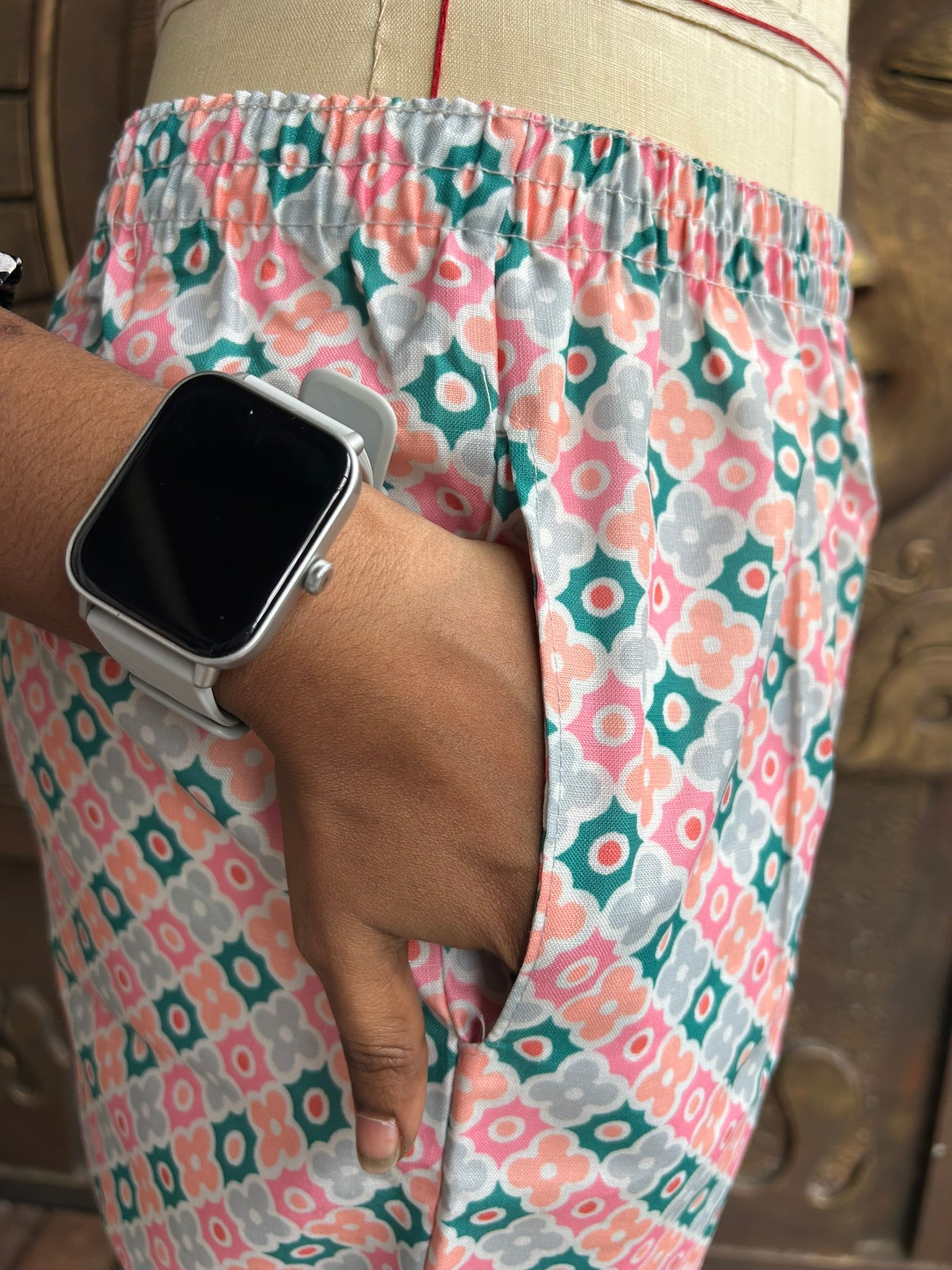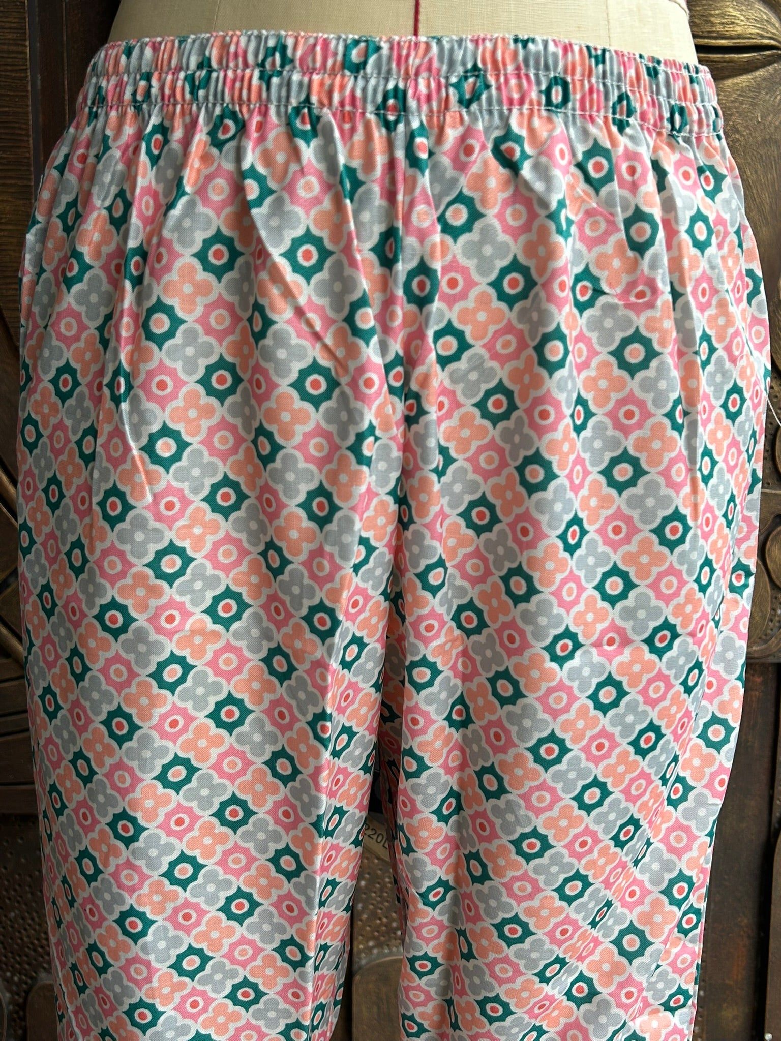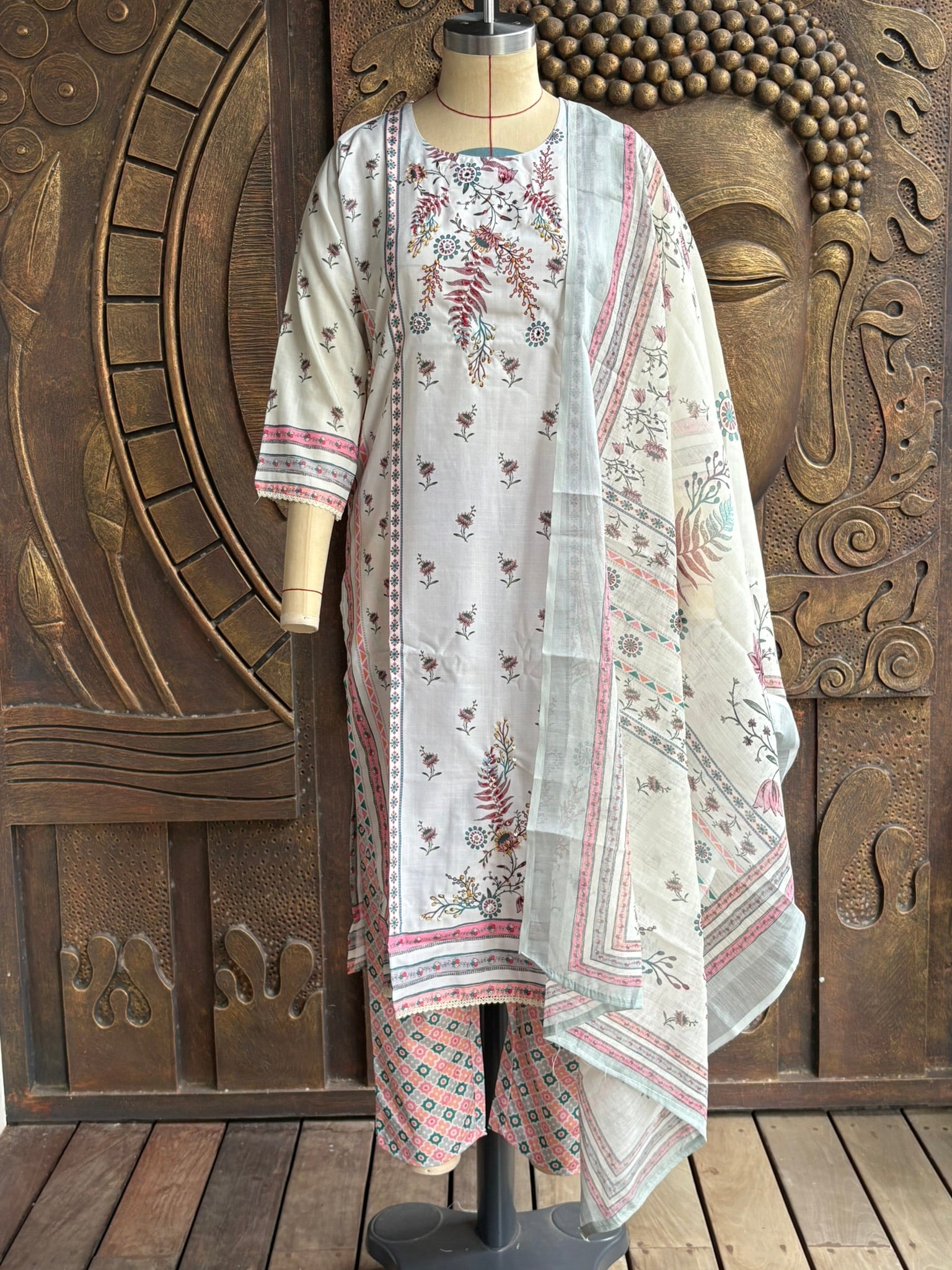 - Prints/Details: The kurta features a central large floral and botanical print, complemented by tiny floral motifs and a detailed geometric border. The pants showcase a coordinating abstract pattern, and the dupatta has a mix of floral and striped prints with a vibrant border.