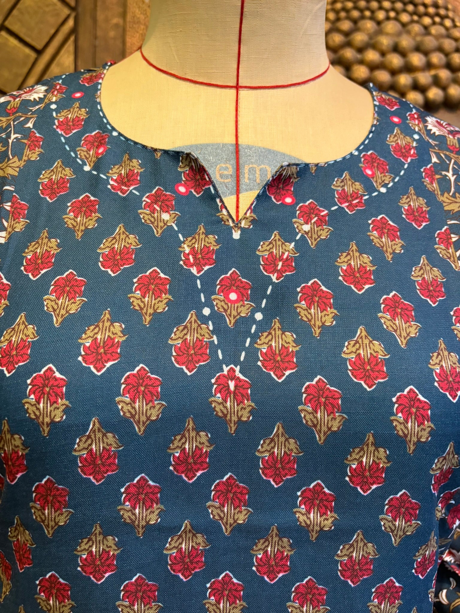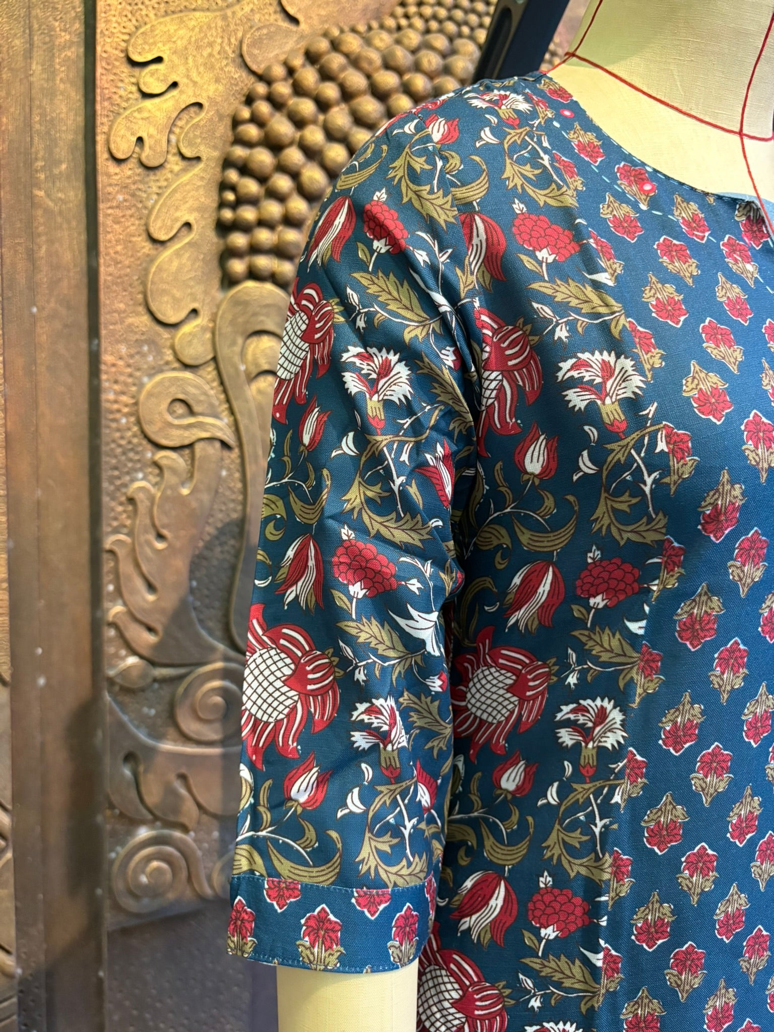 - Color: The main color of this outfit is a deep, muted teal or slate blue, with intricate prints in red, white, and subtle hints of pink and green.