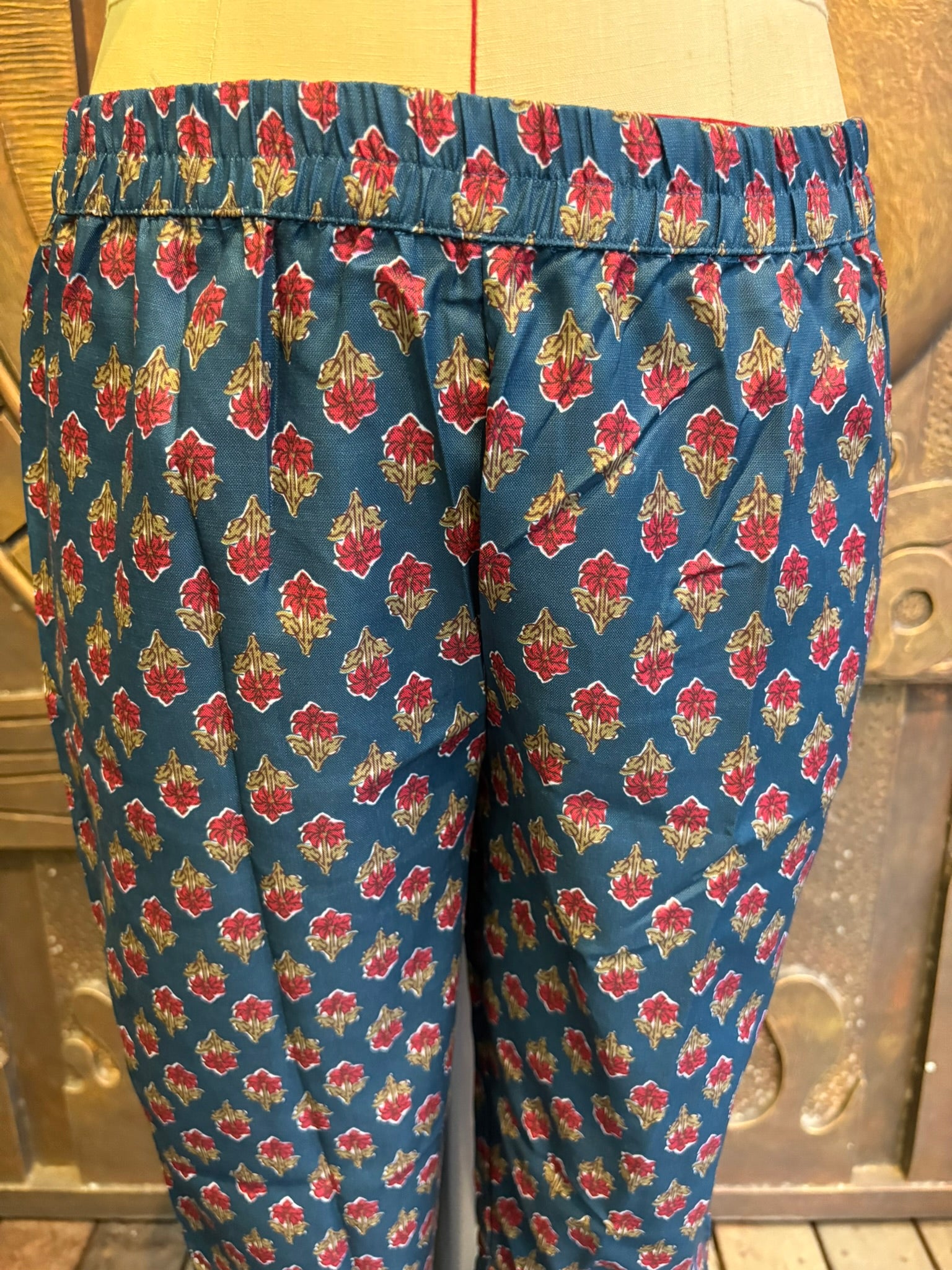 Experience the depth and beauty of this Midnight Wave Suit Set, a stunning blend of traditional prints and a modern silhouette. Crafted from comfortable cotton, the rich teal and red hand-block prints create an enchanting, artistic look. This elegant three-piece suit is a perfect choice for adding a touch of sophisticated bohemian flair to your wardrobe.
