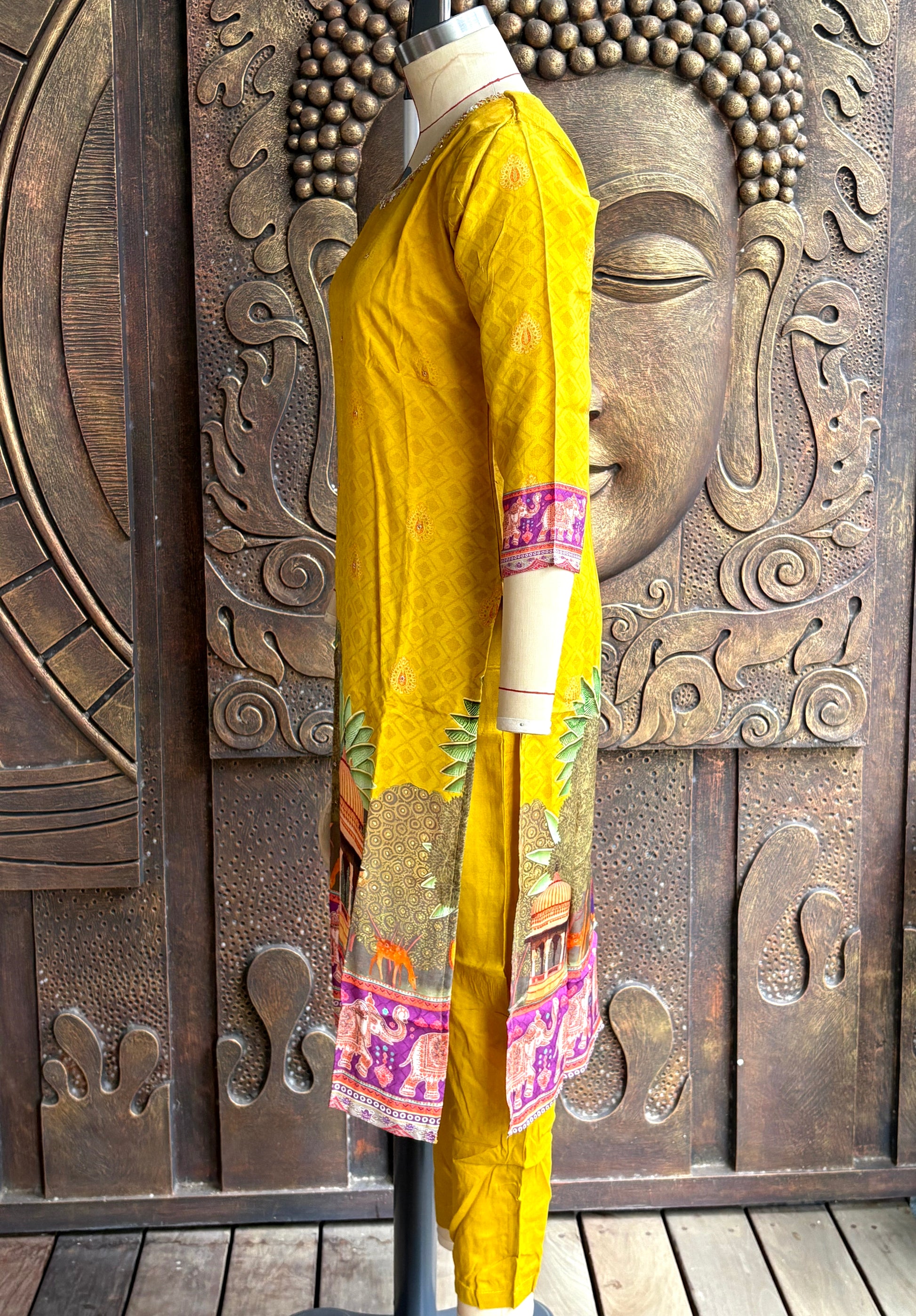 Sun-kissed and vibrant, this turmeric yellow suit set is a celebration of joyous traditions. The stunning folk-inspired prints tell a story of cultural richness and artistic flair. Drape yourself in this masterpiece and radiate an aura of cheerful elegance.