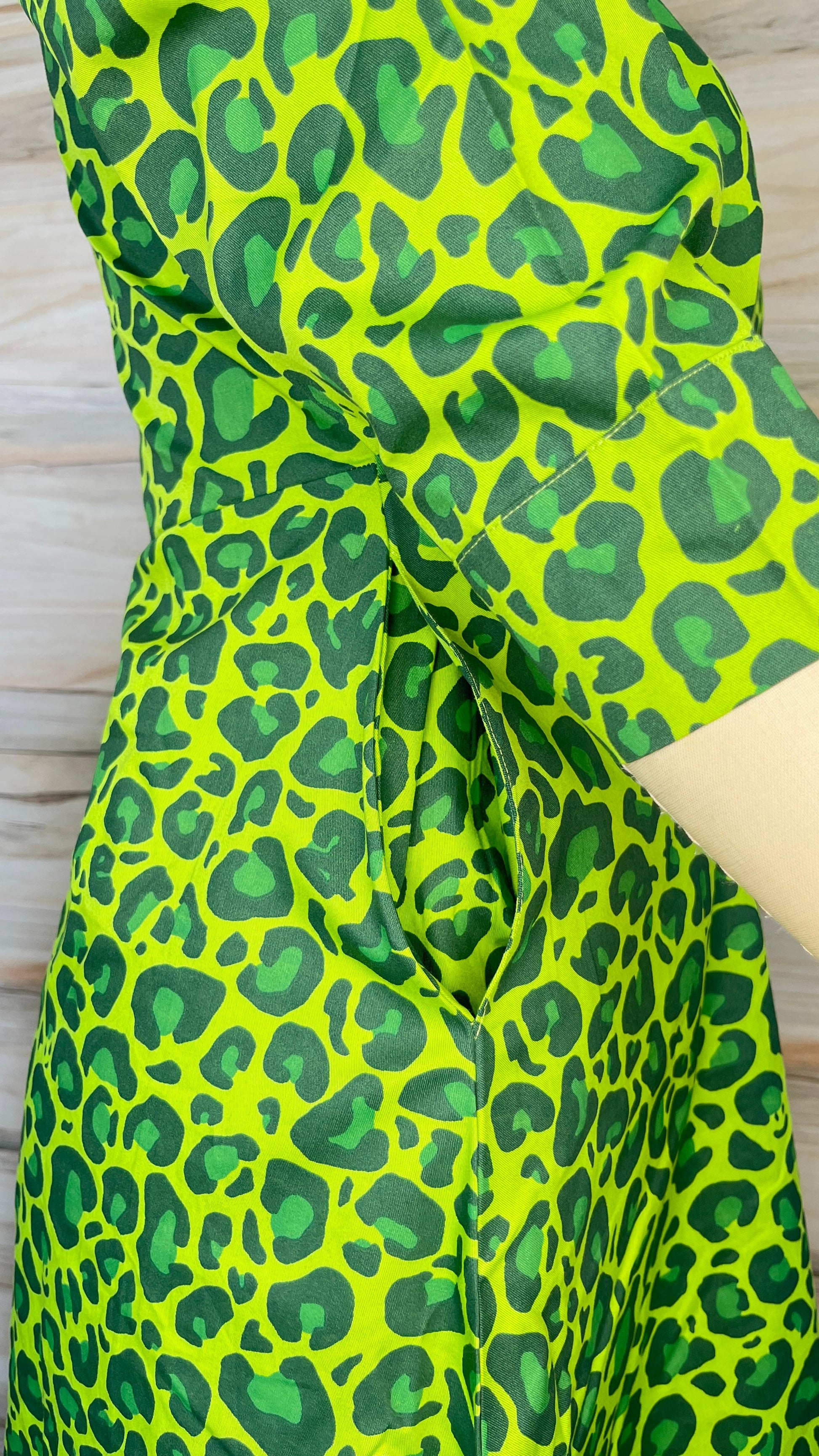 - Prints/Details: The dress features a bold, abstract leopard print in contrasting shades of green. It has a V-neckline and three-quarter length sleeves with a slight puff.