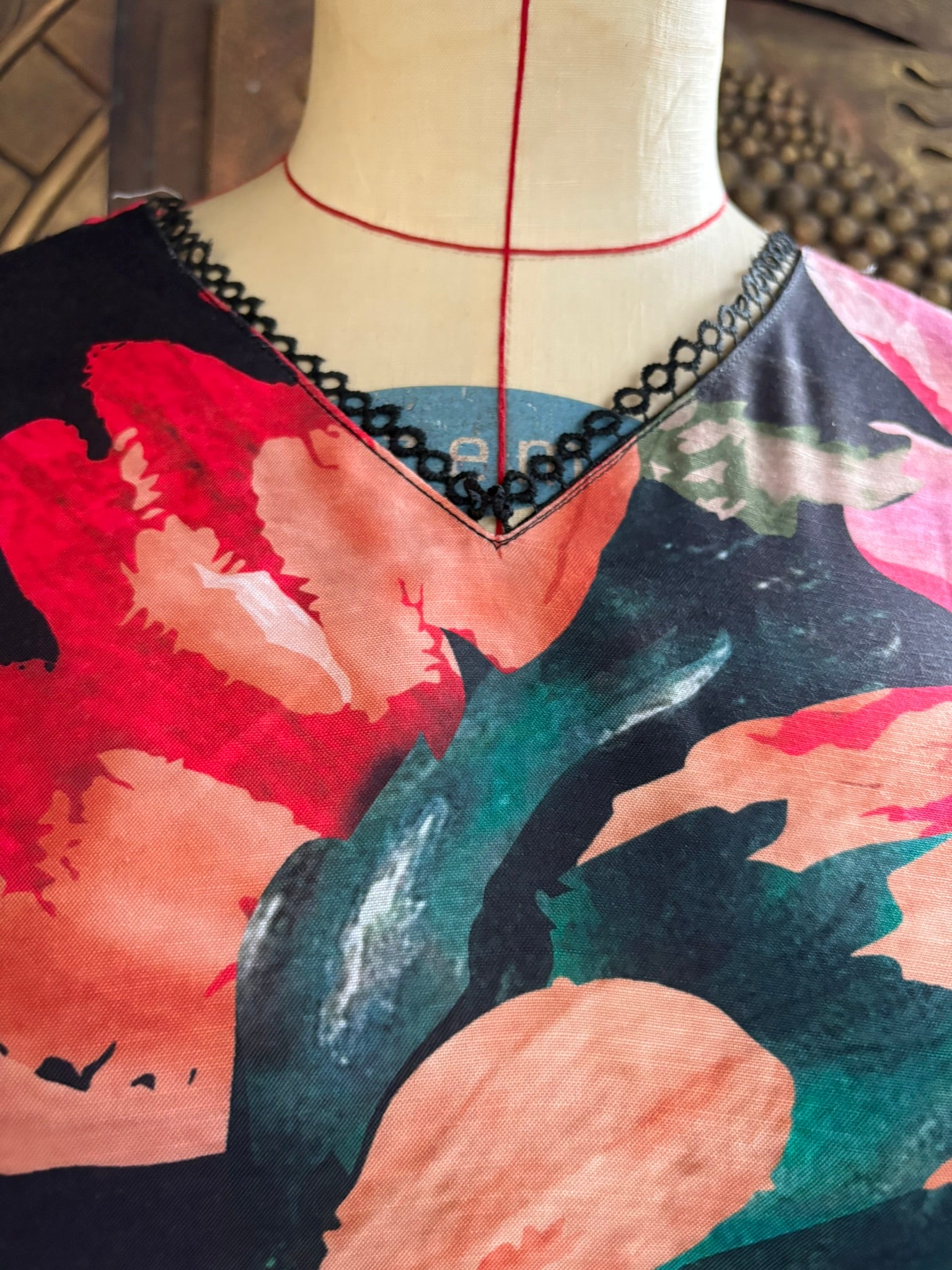 - Color: The primary color of this outfit is black, with large, vibrant floral patterns in shades of red, pink, and teal.