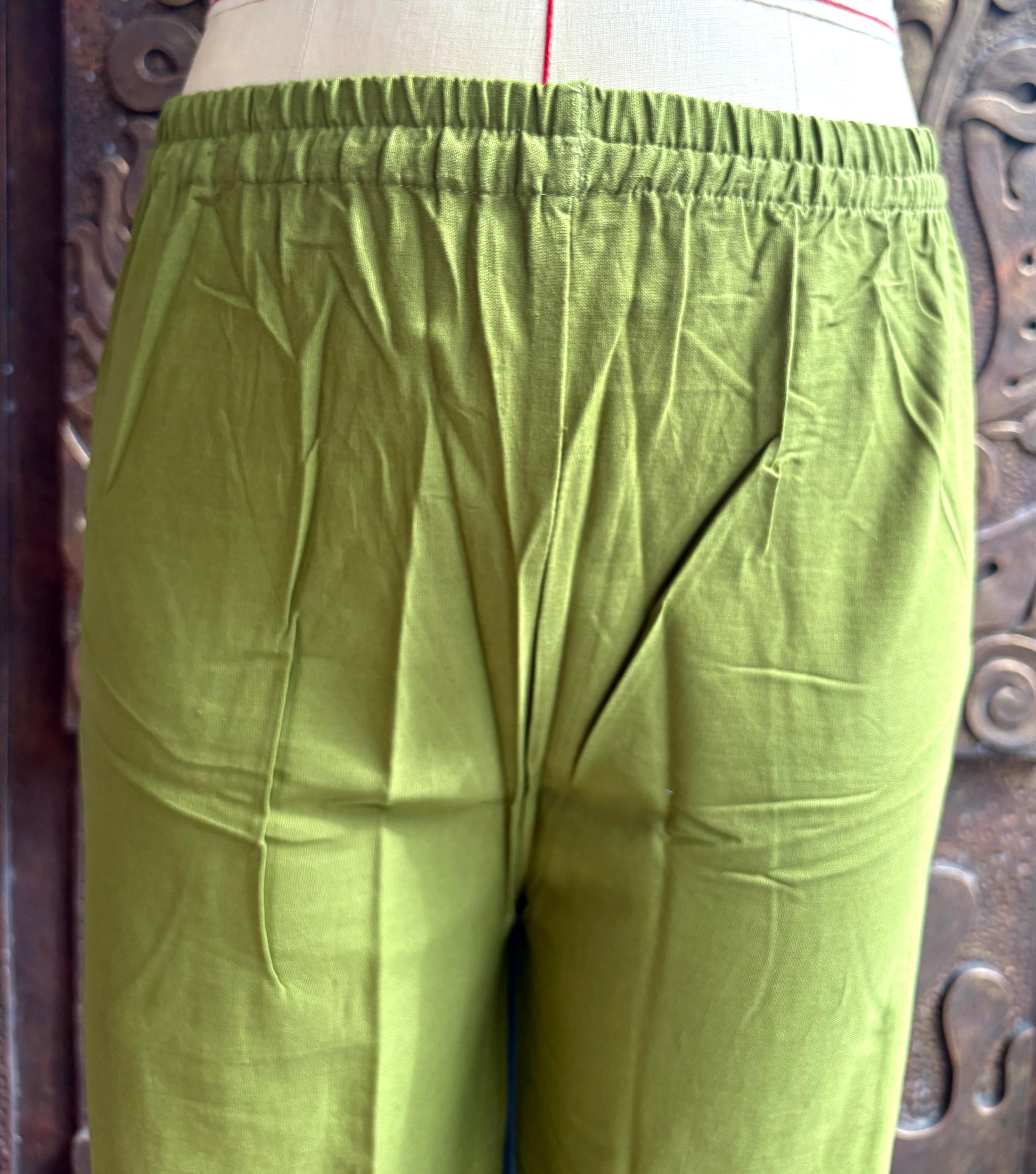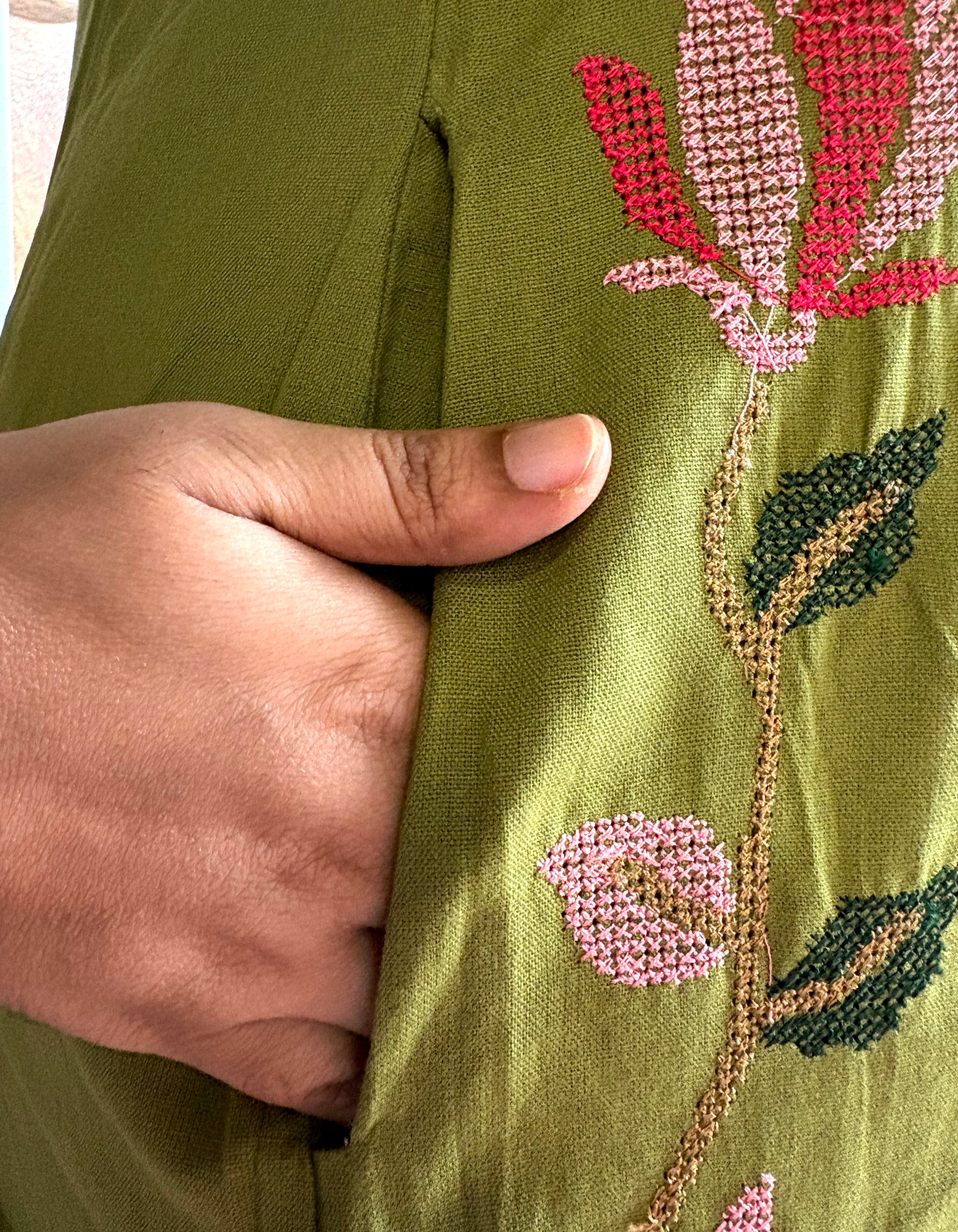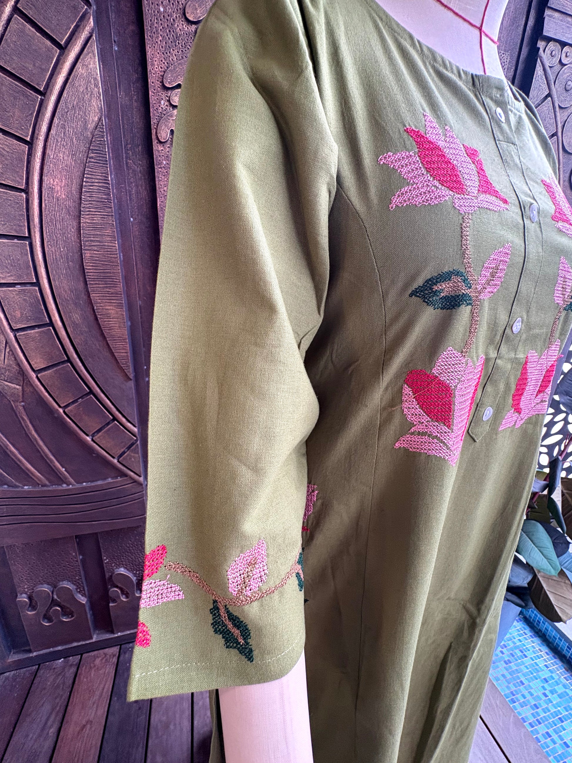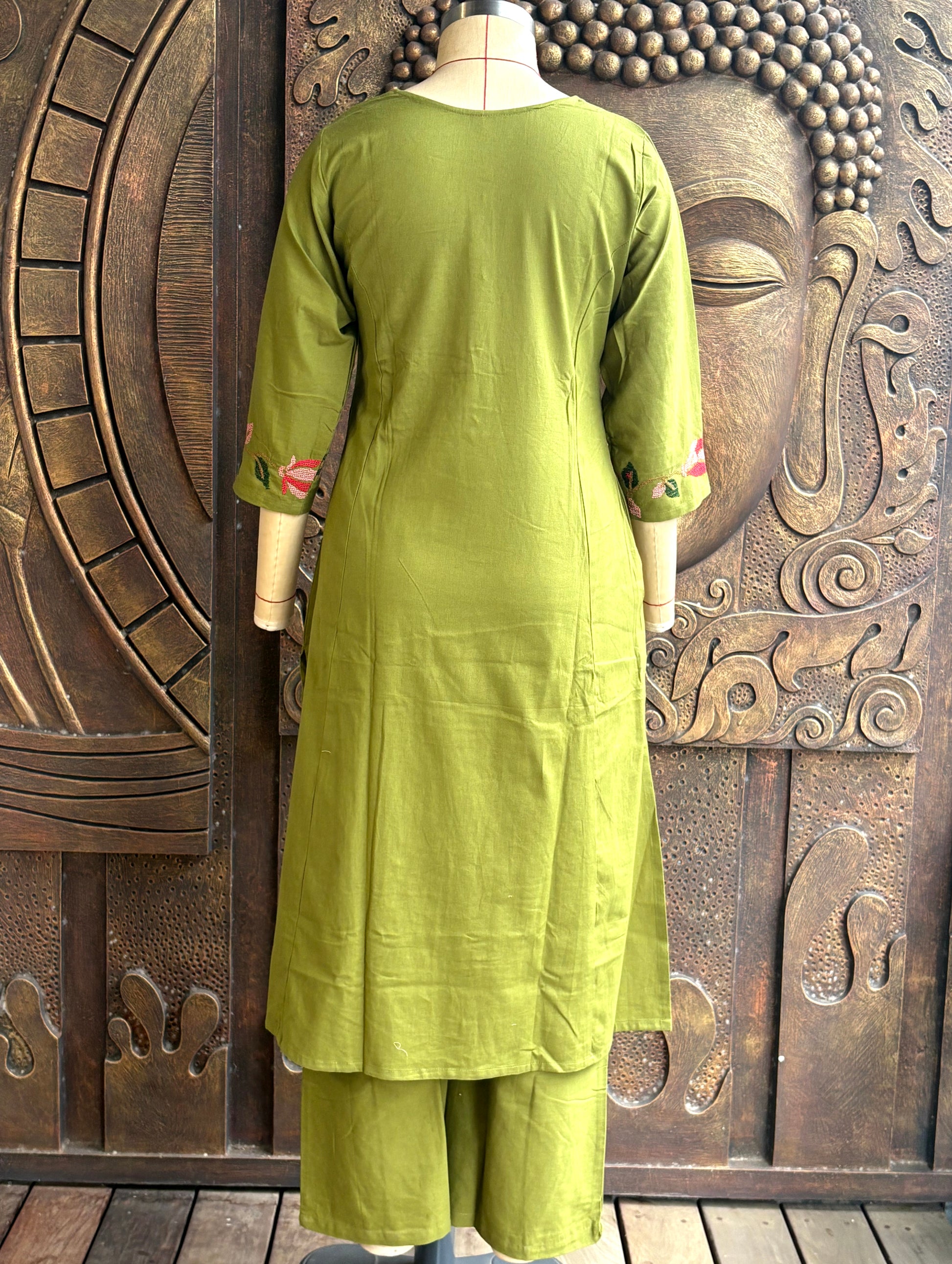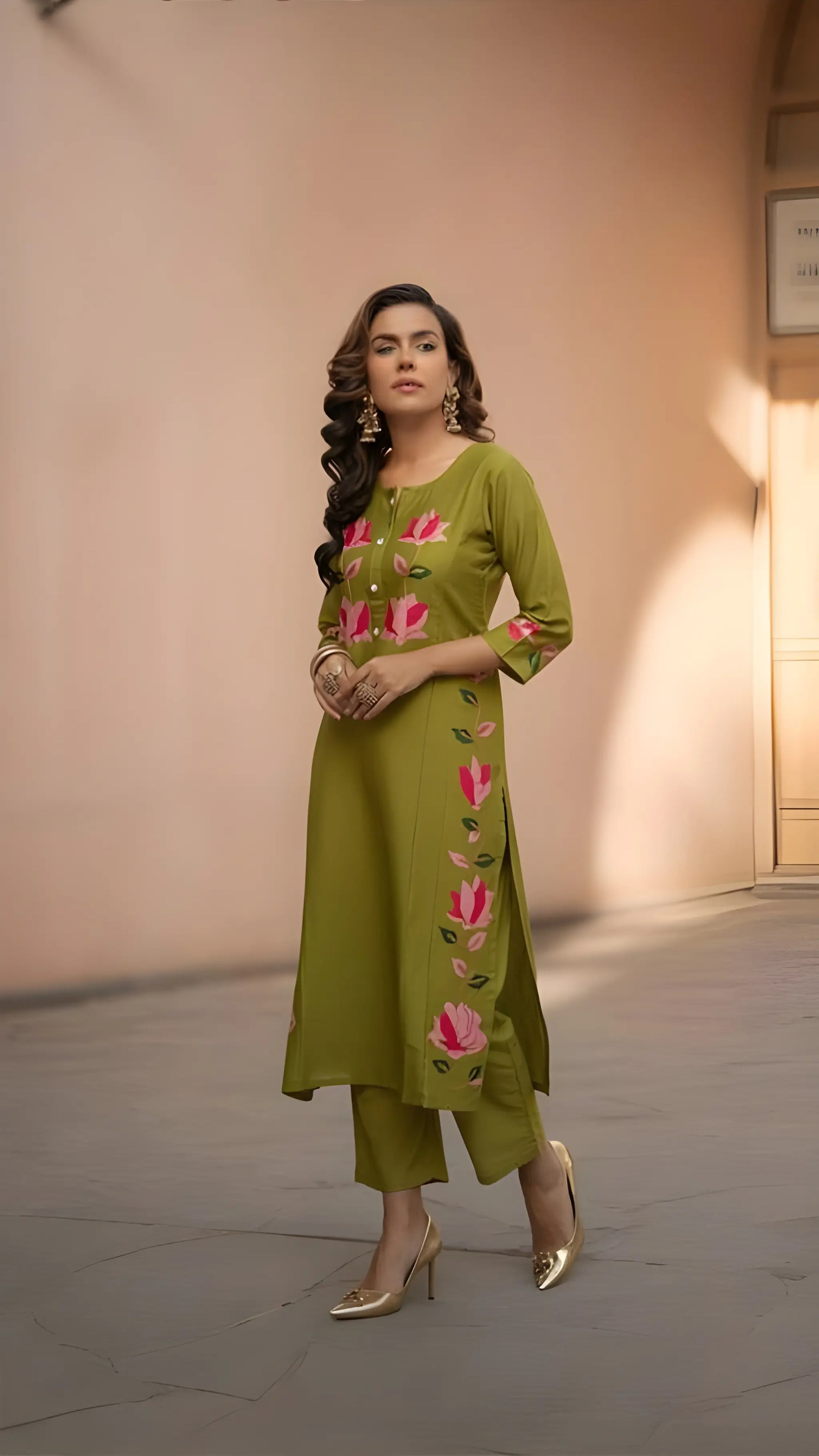 Embrace timeless elegance with our olive green kurta set featuring exquisite lotus flower embroidery, perfect for festive and casual occasions.