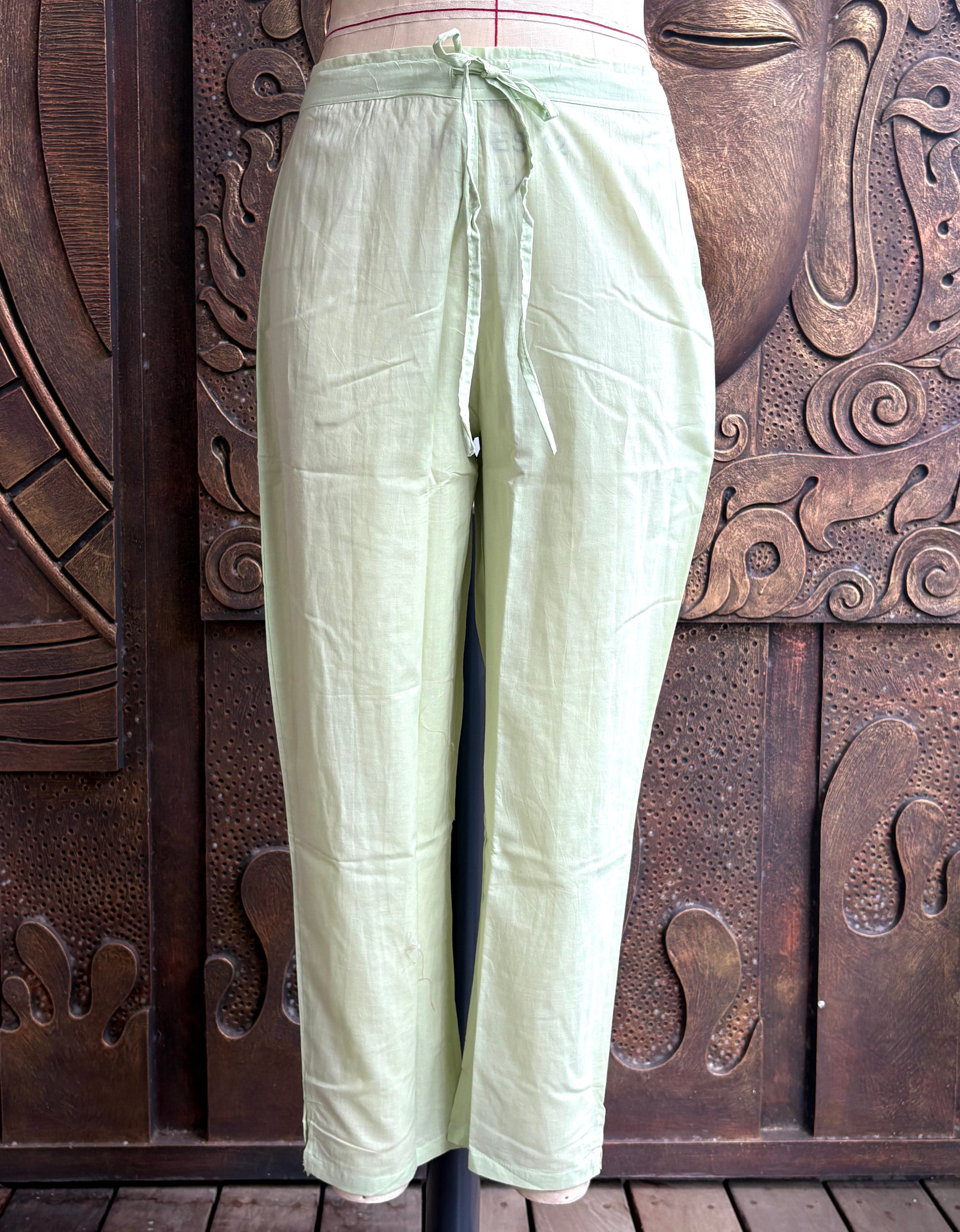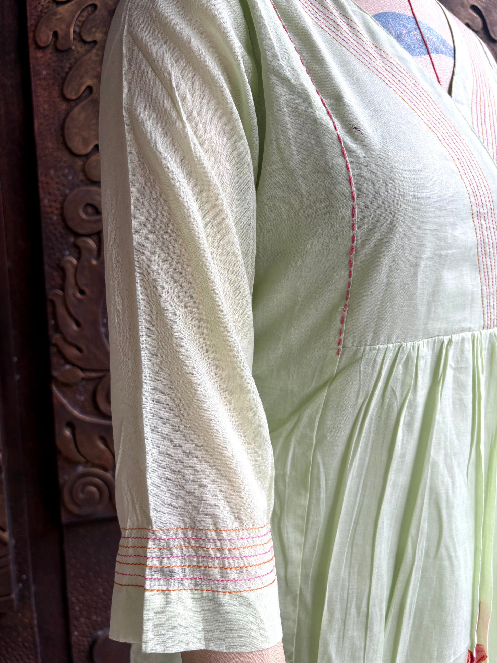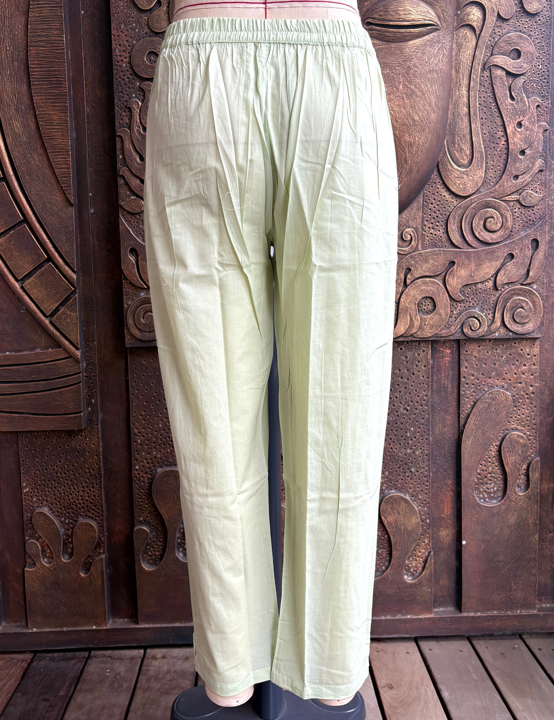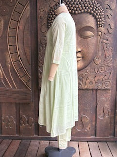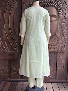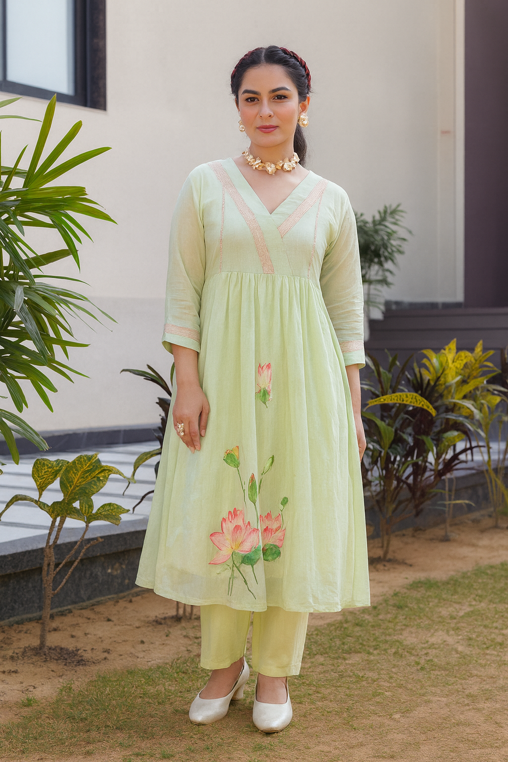 Elegant pastel green cotton kurta set with hand-painted lotus motifs, offering a graceful A-line fit perfect for festive wear and casual elegance.