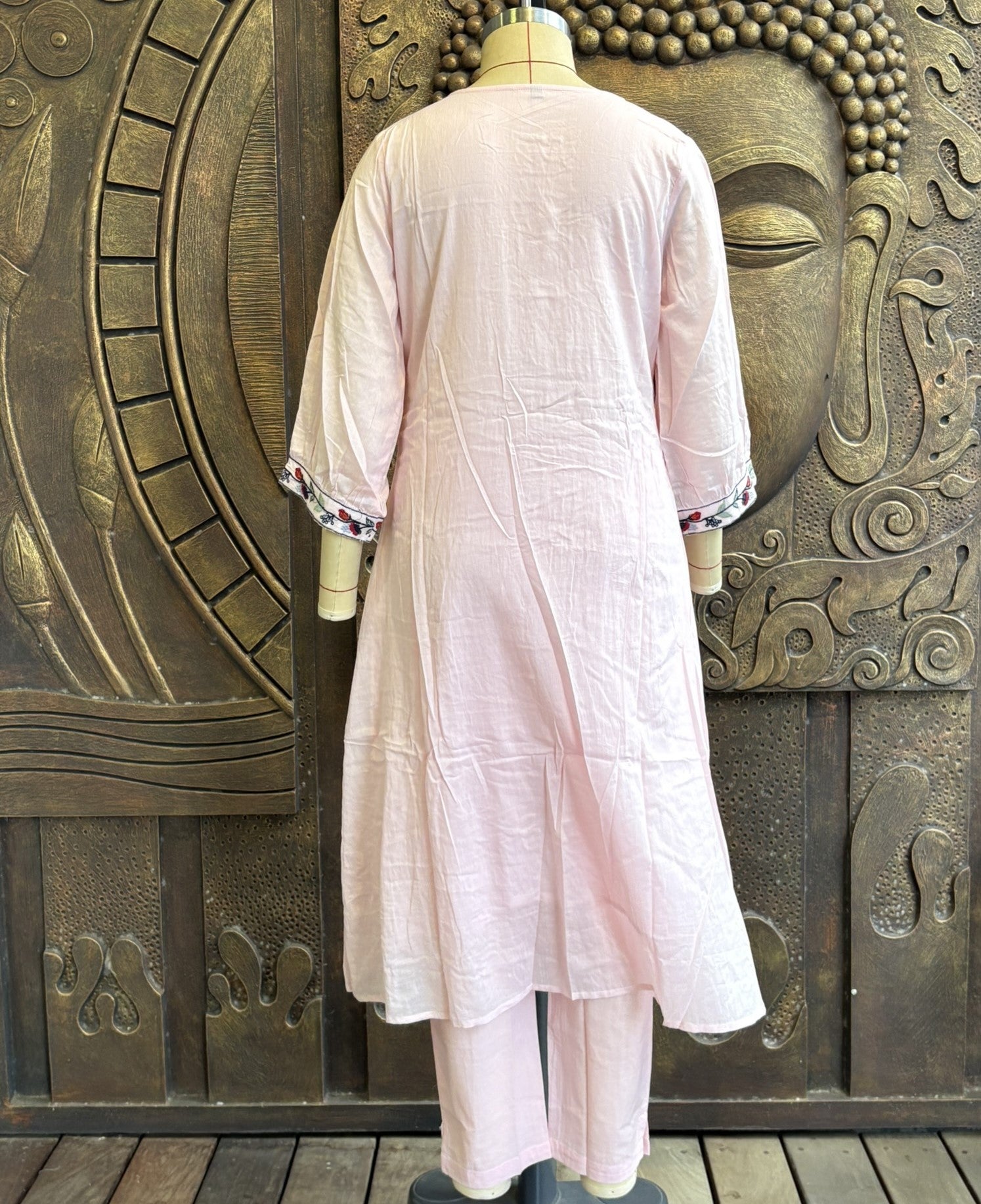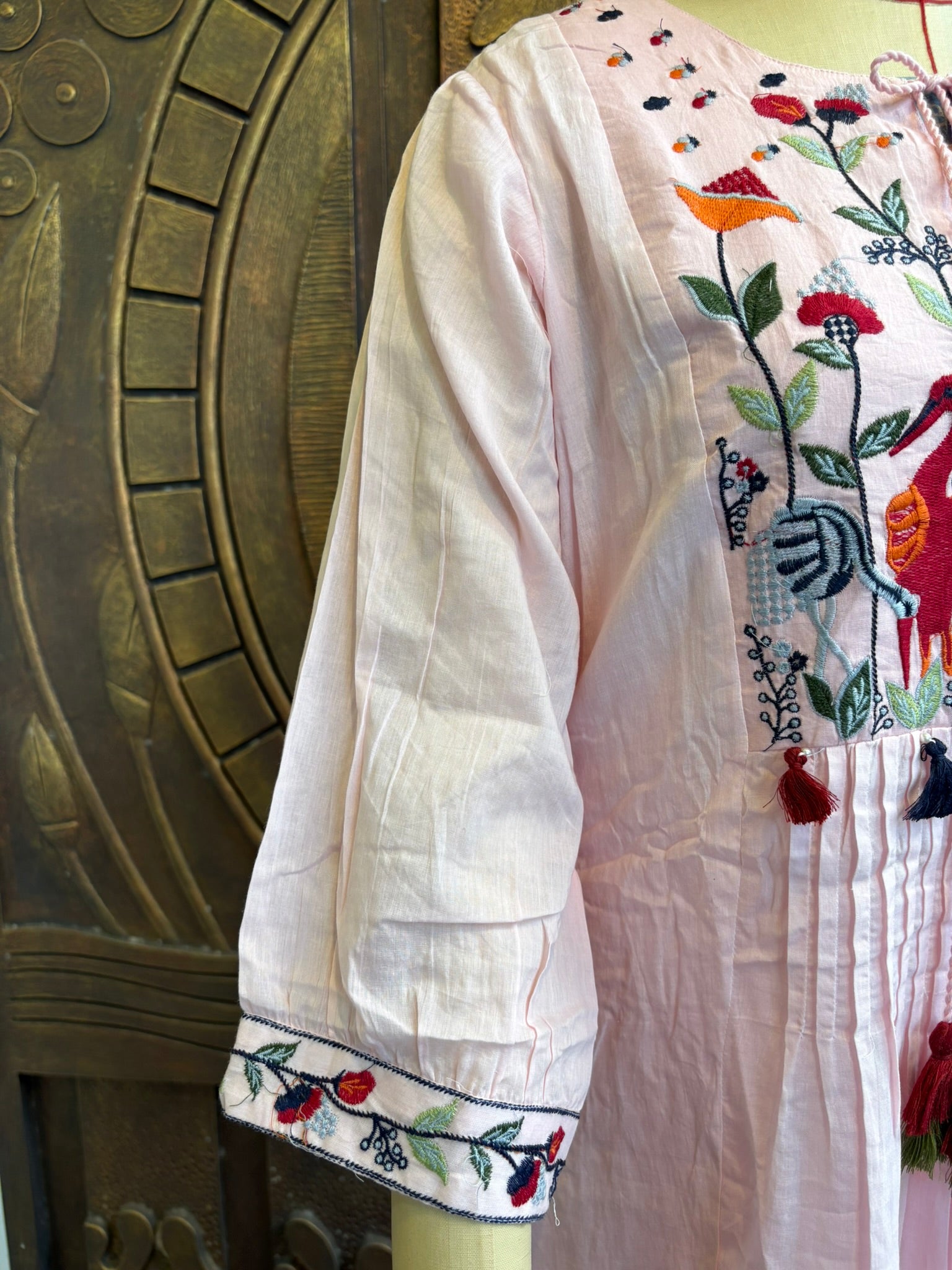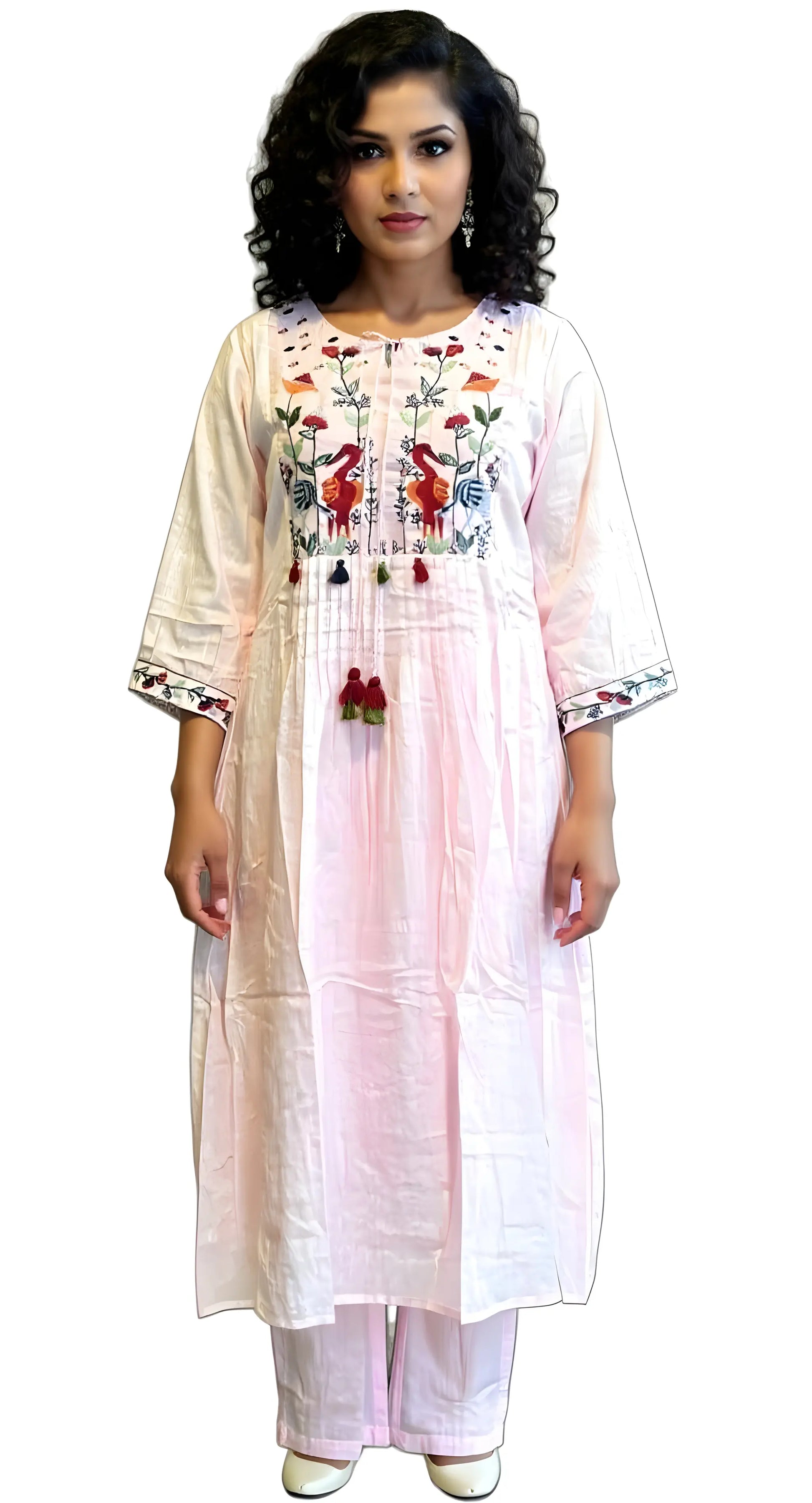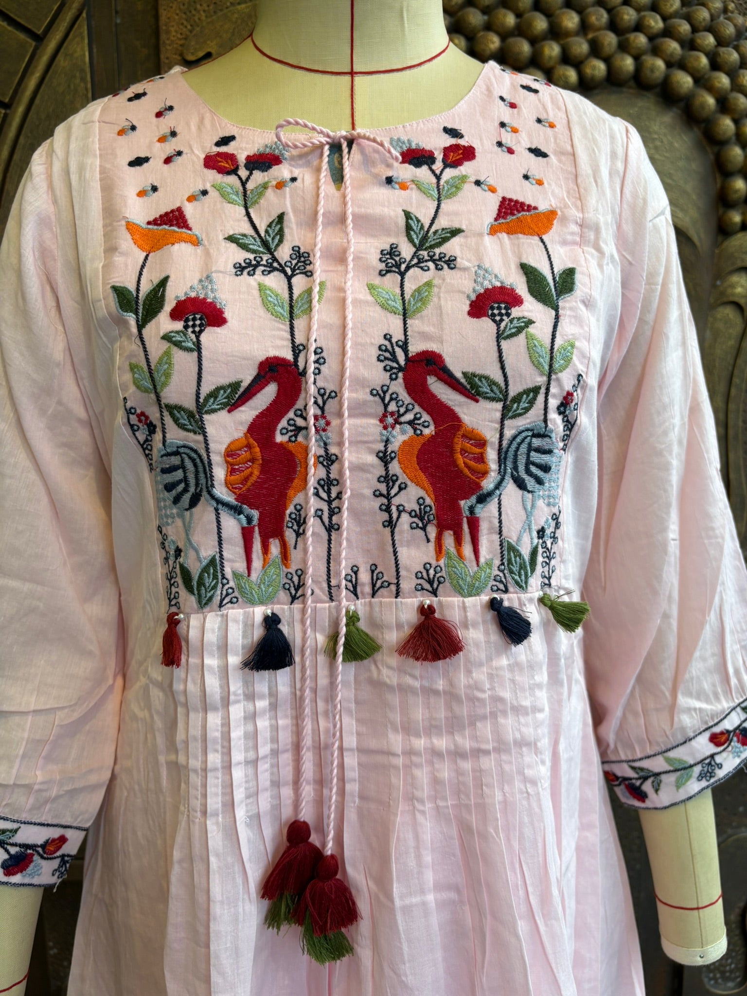 Step into a world of artistic charm with our blush pink kurta set, featuring intricate embroidery and vibrant tassels for a touch of bohemian grace.