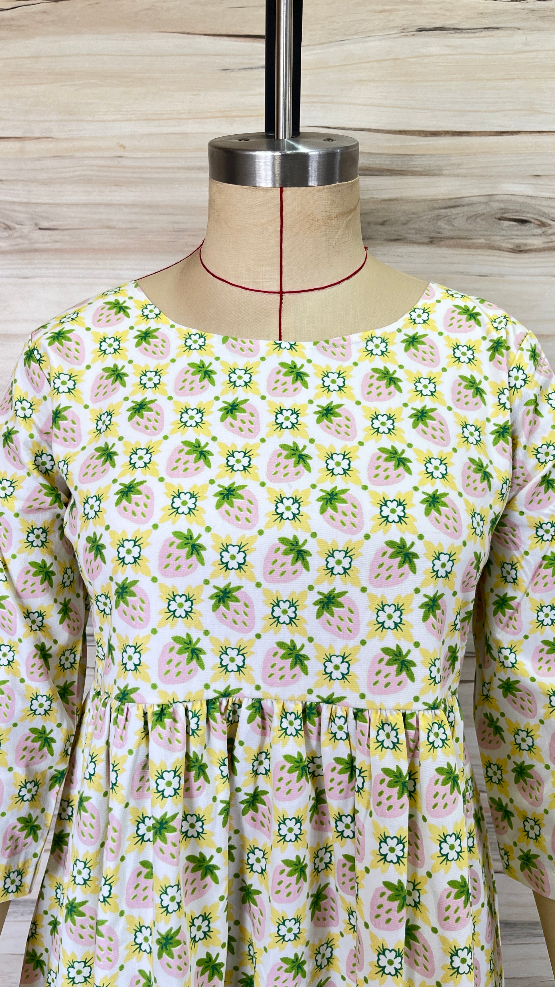 - Prints/Details: The dress is adorned with an all-over Strawberry print in a grid pattern.