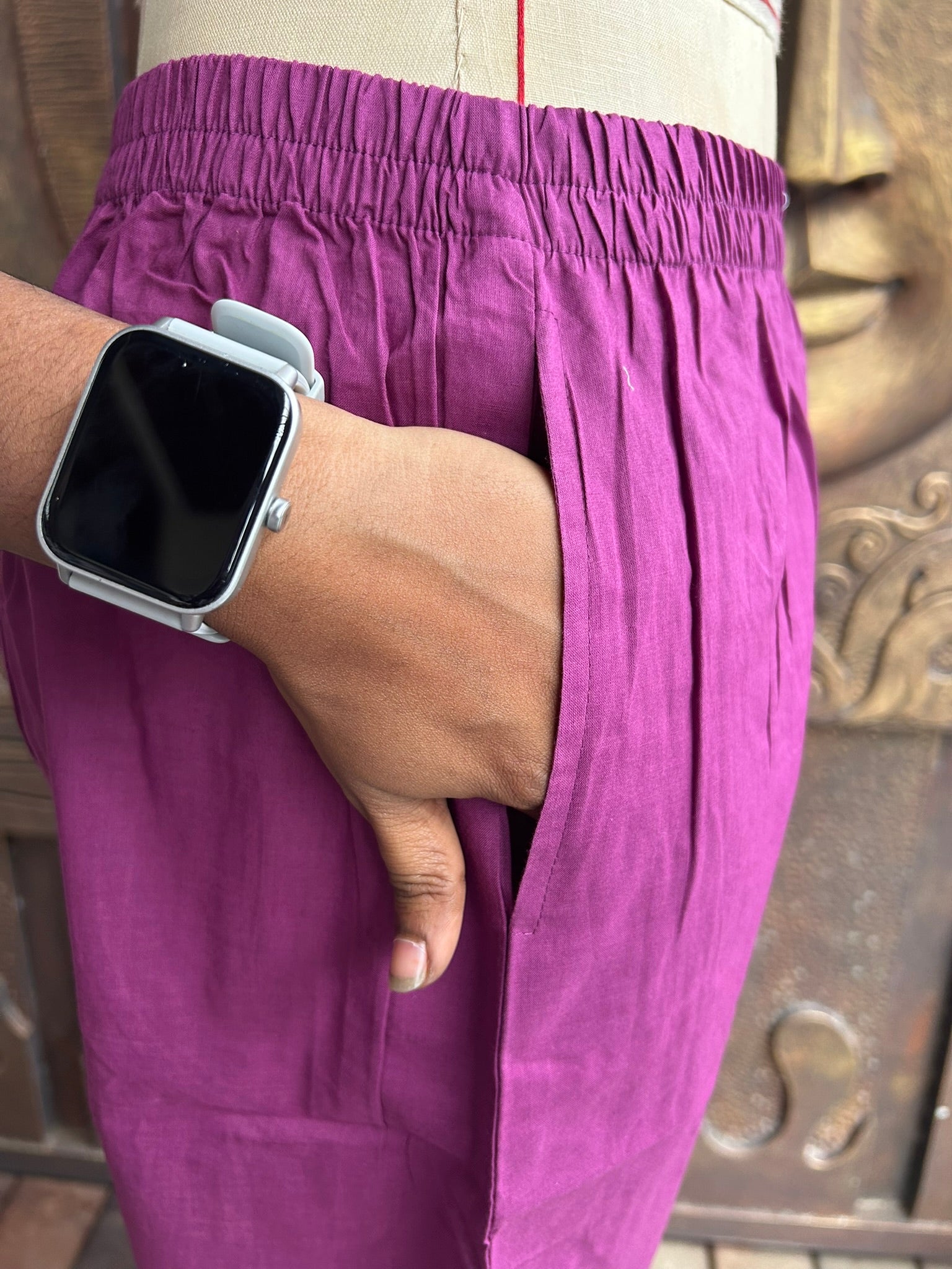 Envelop yourself in the rich allure of this deep magenta suit set. The intricate peacock embroidery, a symbol of grace and beauty, adorns the yoke, making it a truly captivating piece. Paired with a subtly printed dupatta, this ensemble exudes a refined traditional charm, perfect for celebratory moments.