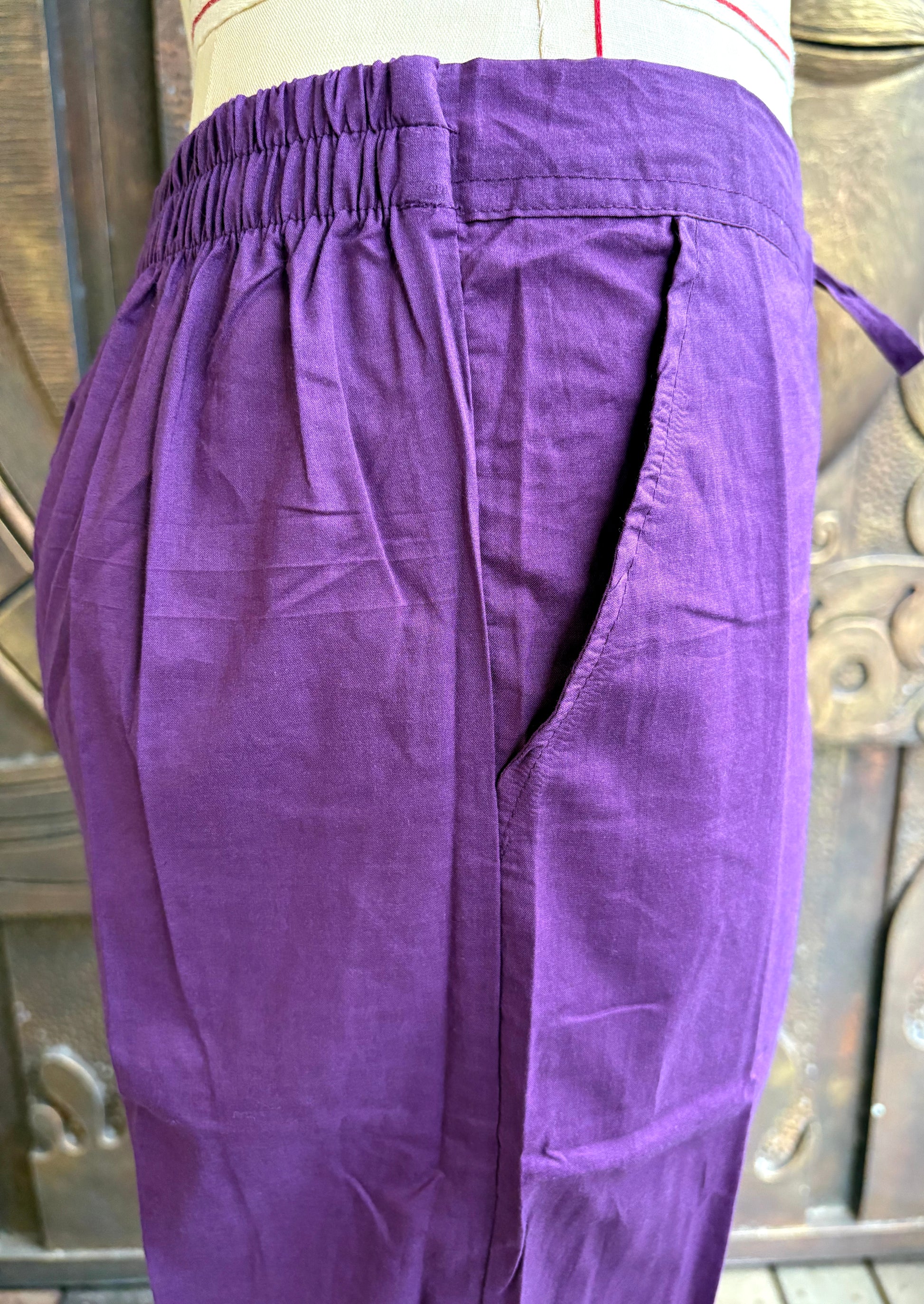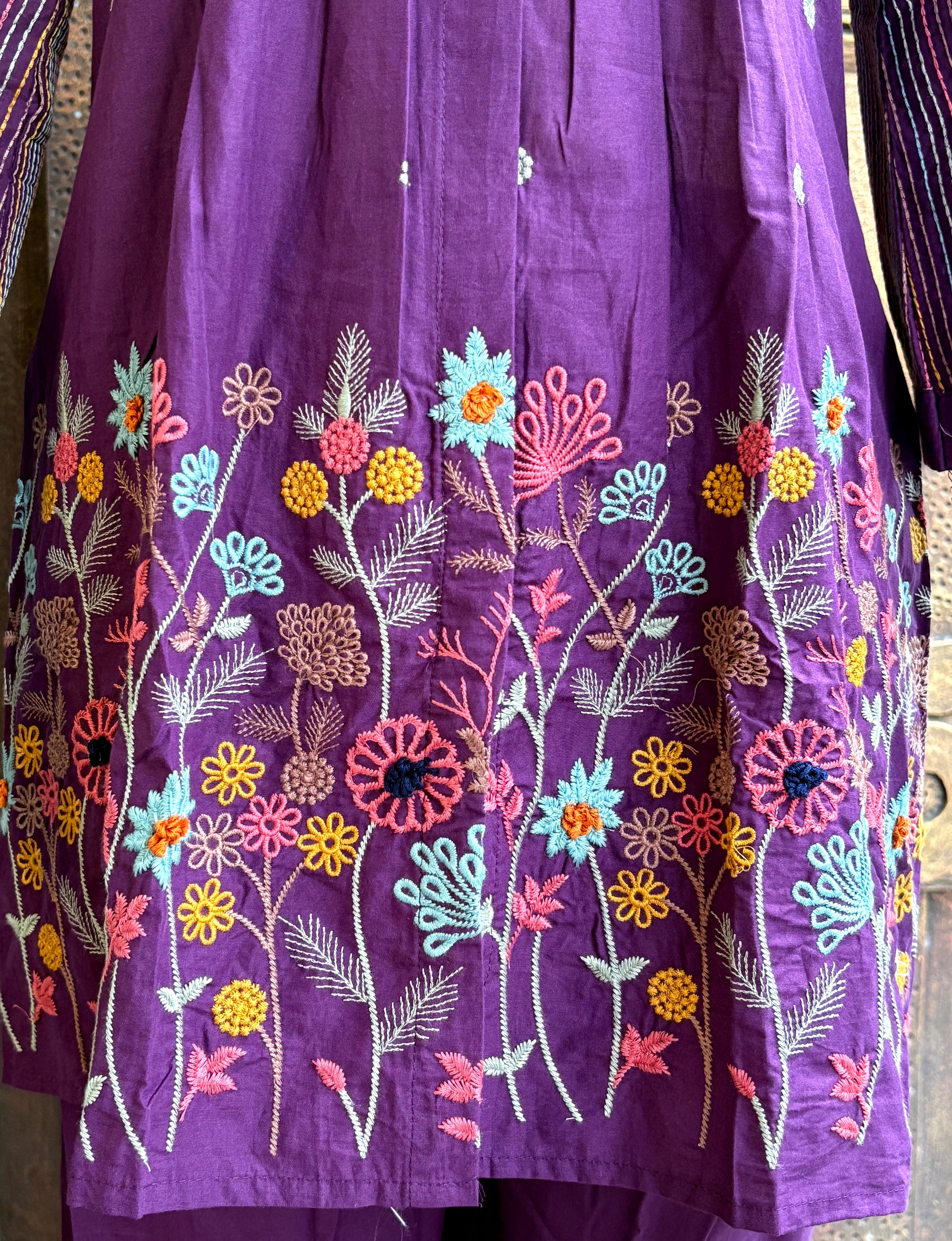 Vibrant purple cotton kurta set with colorful floral embroidery, offering an elegant straight-fit style for festive wear and everyday elegance."