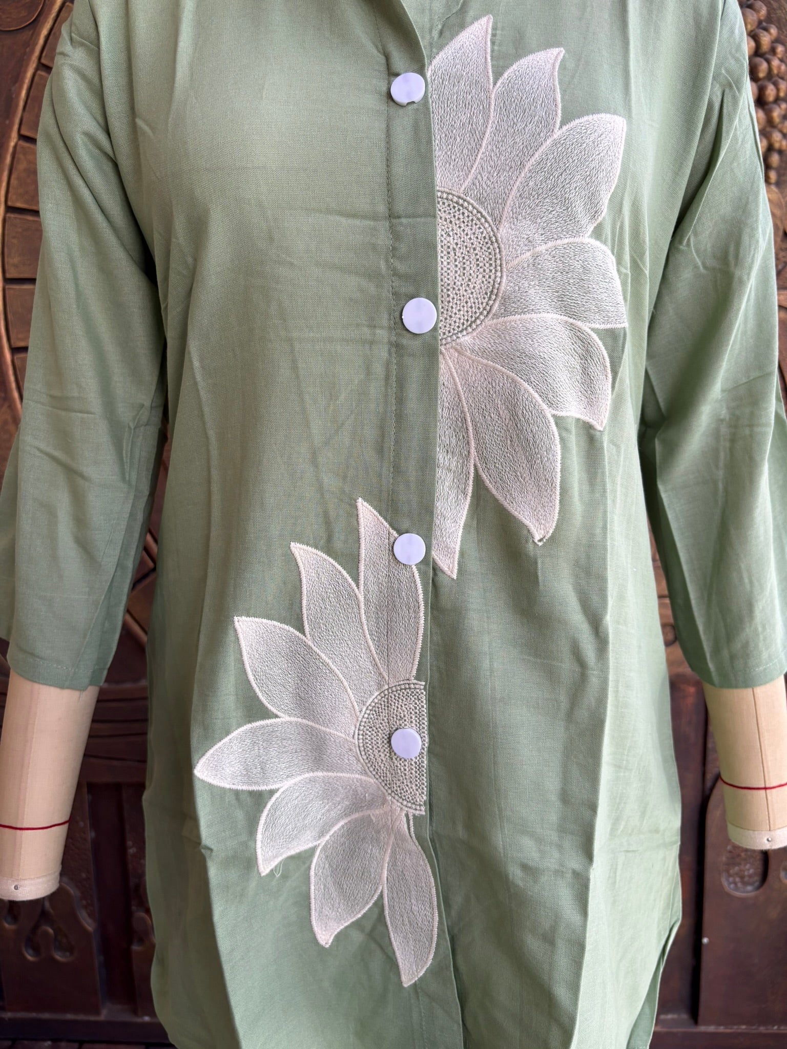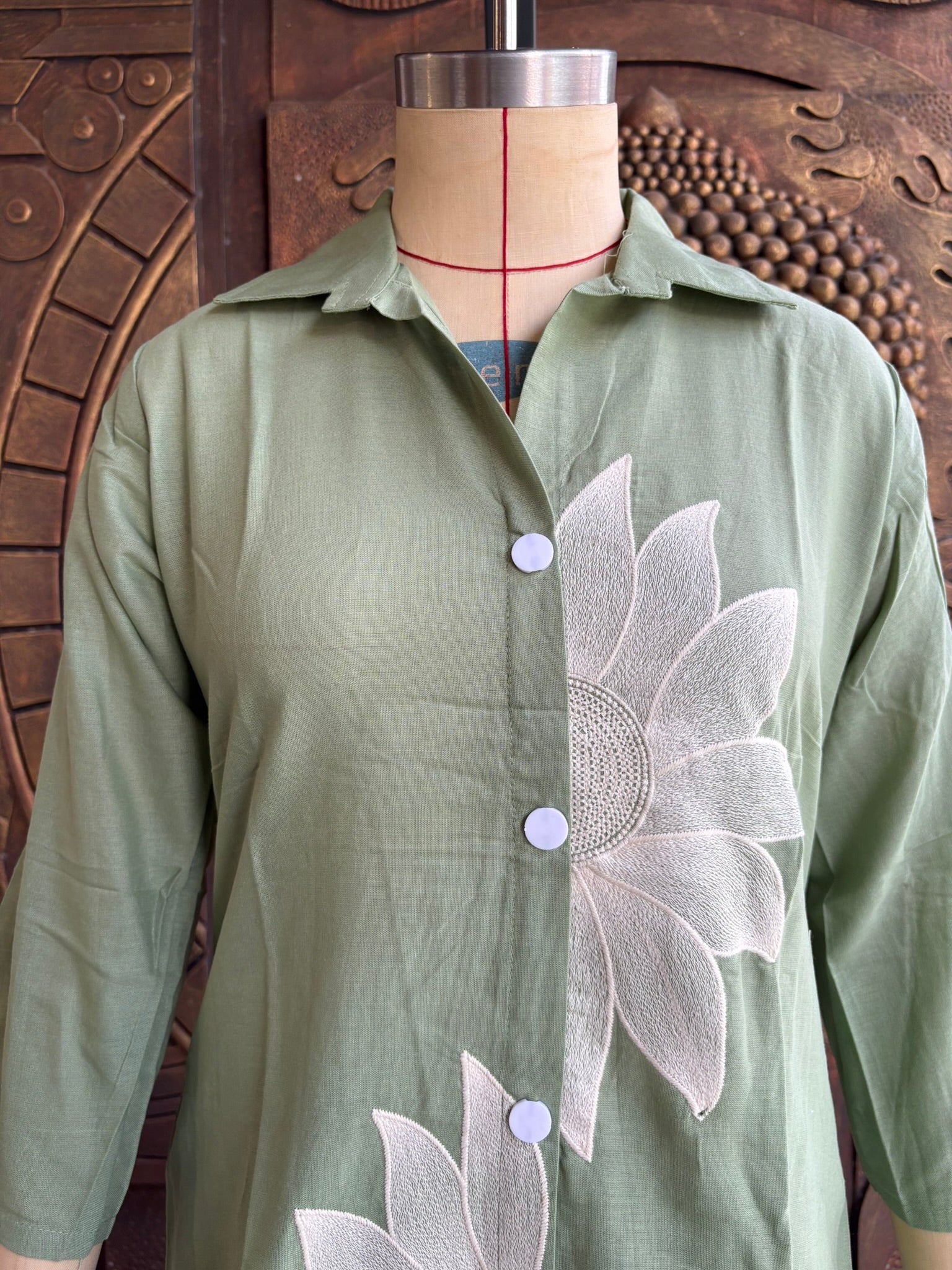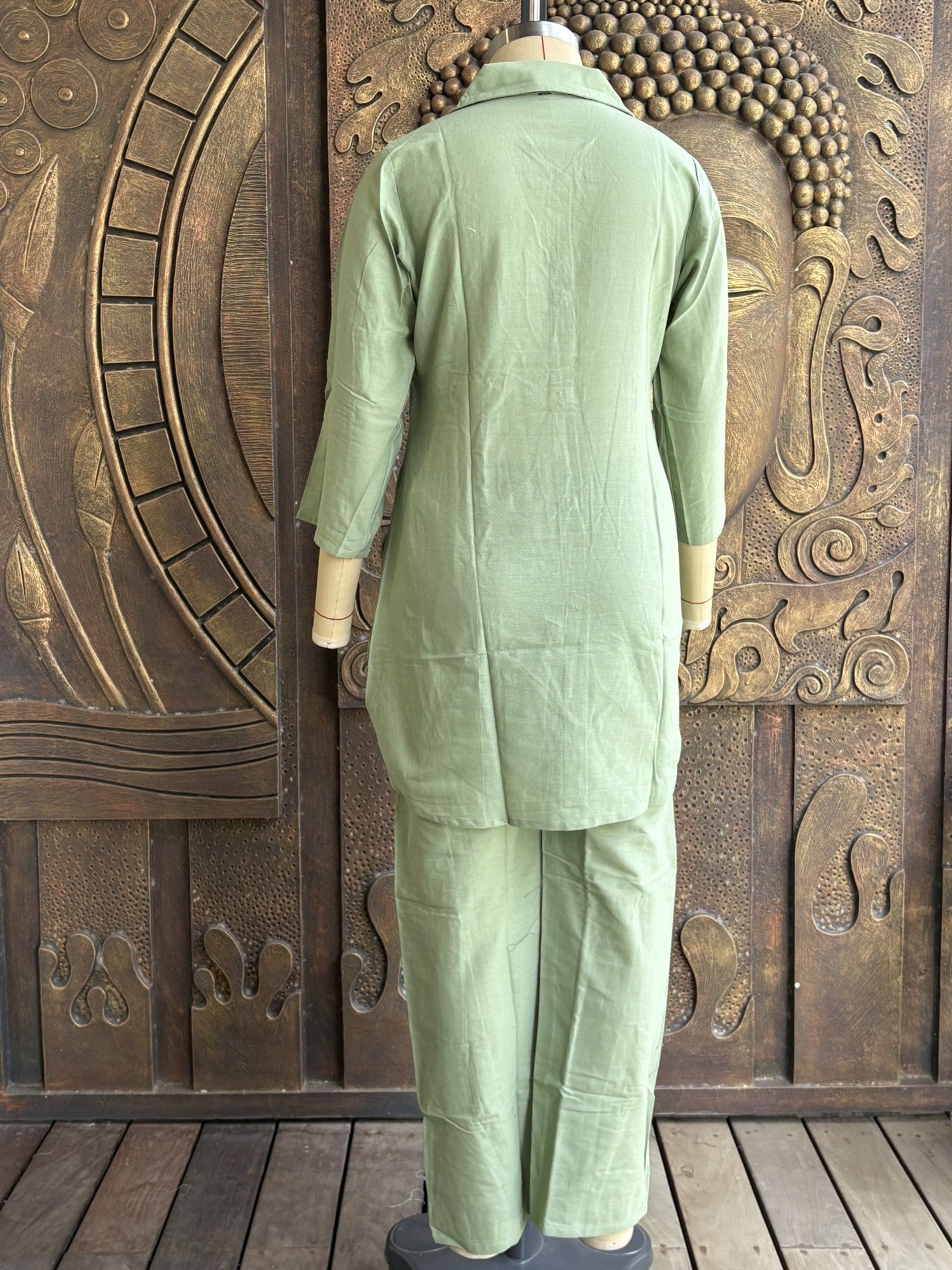 Embrace serene style with this soothing olive green coord set, adorned with delicate white floral embroidery that whispers elegance and comfort.