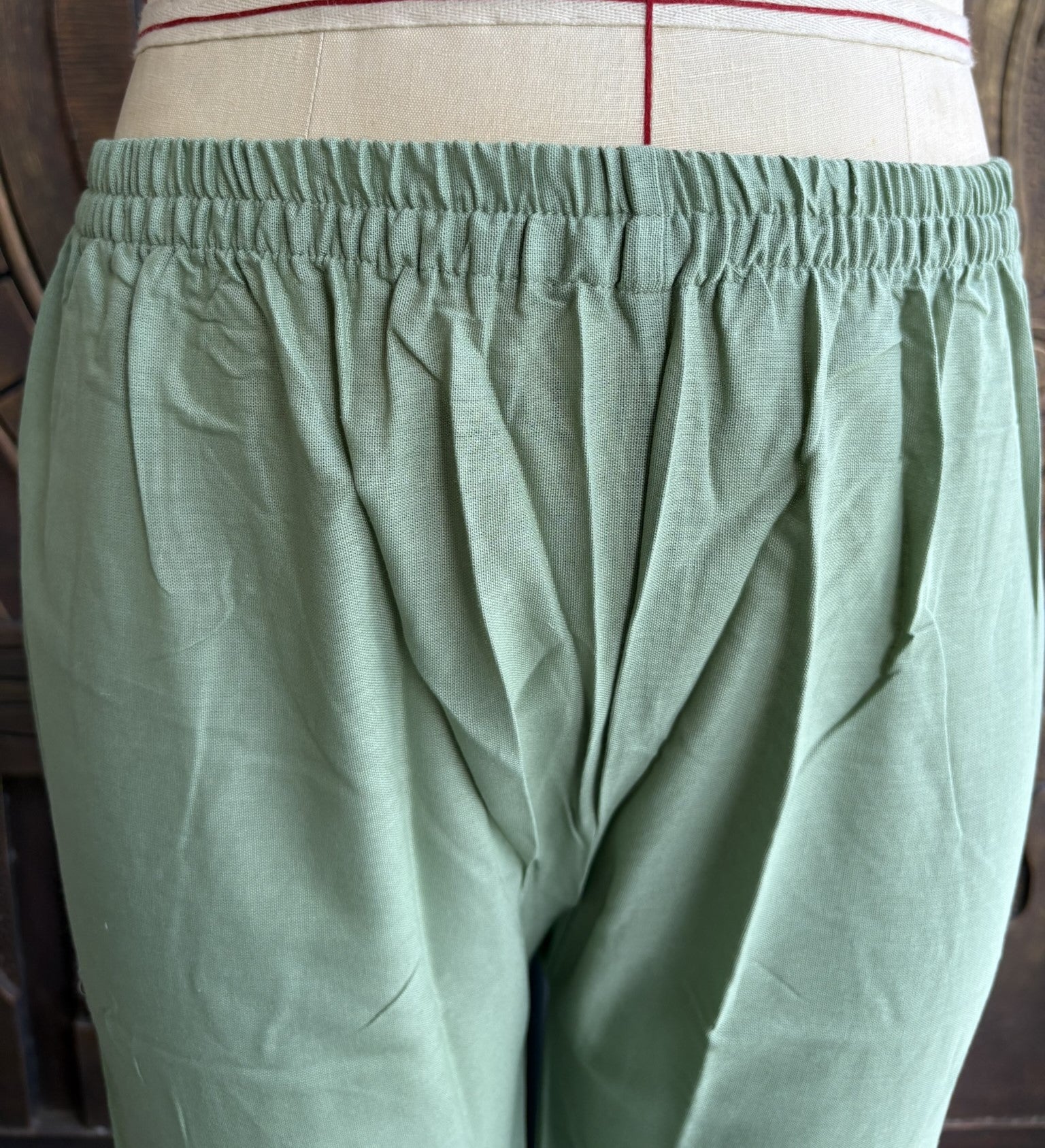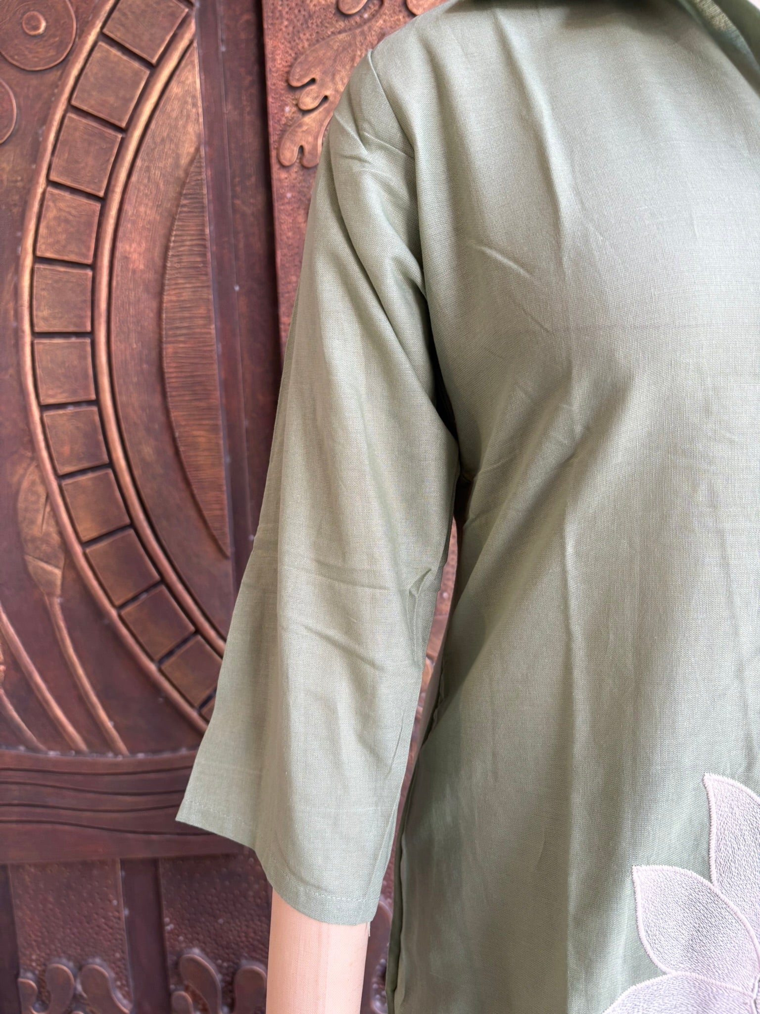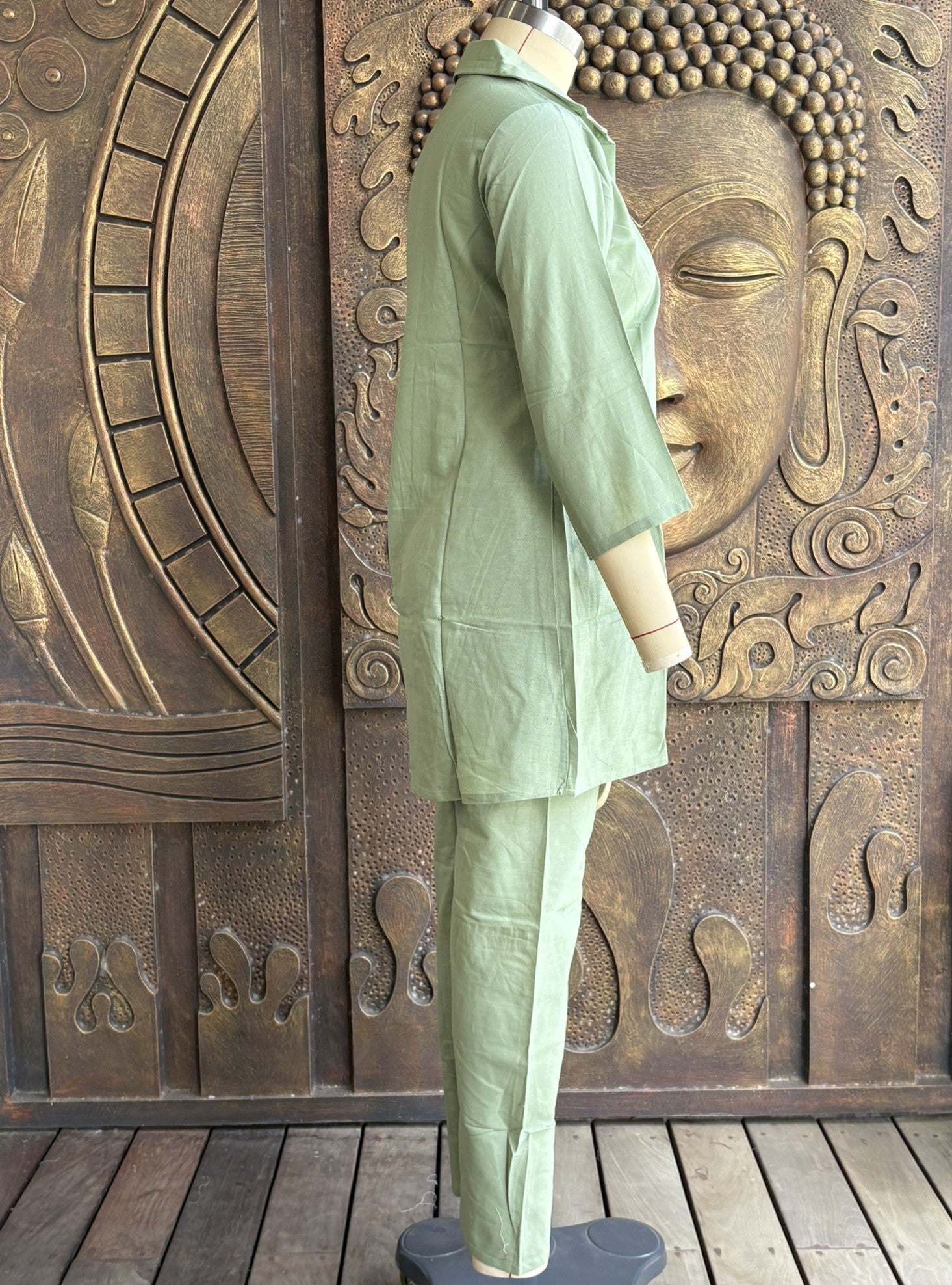 Embrace serene style with this soothing olive green coord set, adorned with delicate white floral embroidery that whispers elegance and comfort.