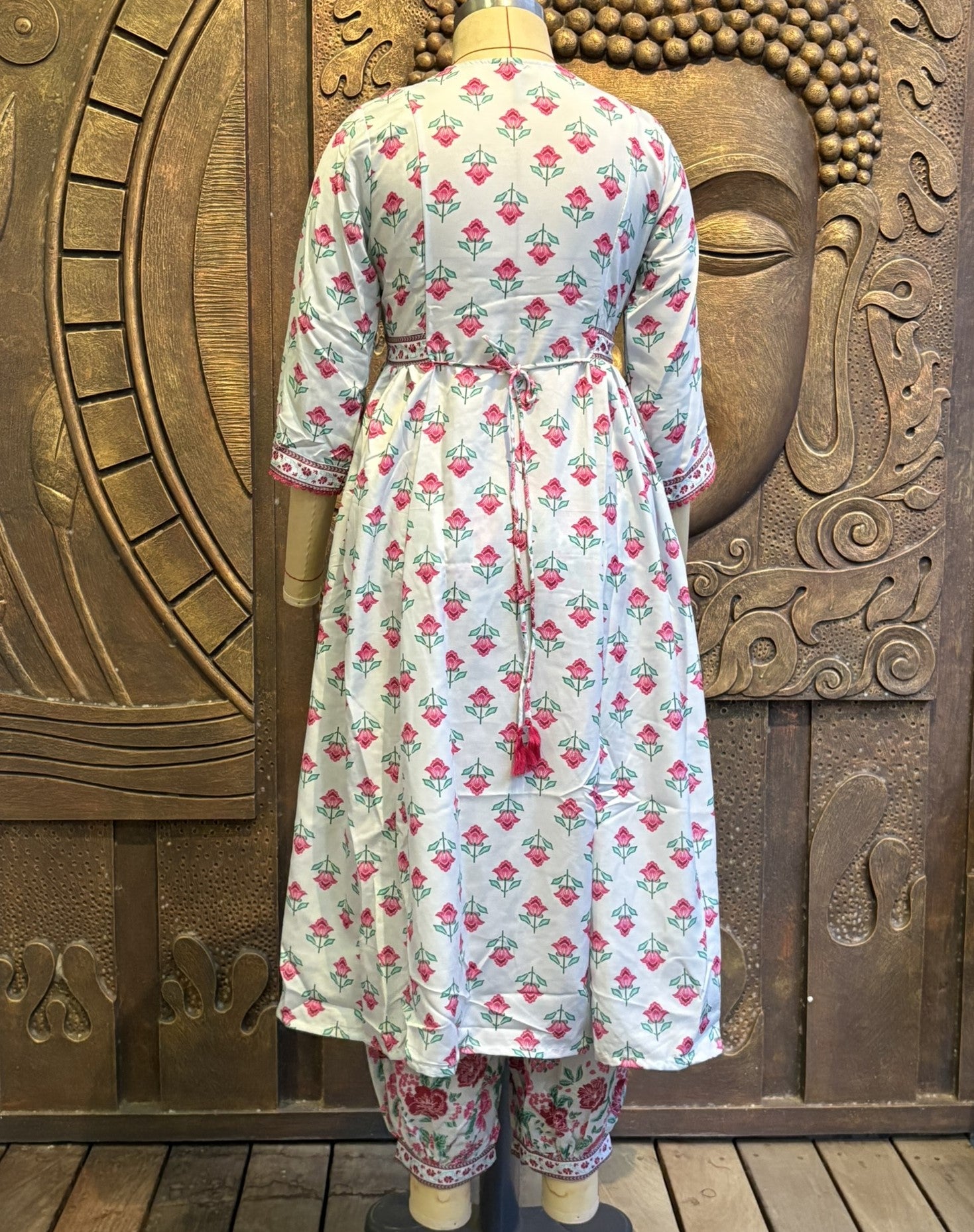 Immerse yourself in the gentle elegance of this white and pink floral suit set, a celebration of timeless charm. The delicate hand-block print on comfortable cotton fabric creates a refreshing and sophisticated look. With its beautiful flared silhouette and contrasting dupatta, this three-piece suit is a versatile and stylish addition to your wardrobe.