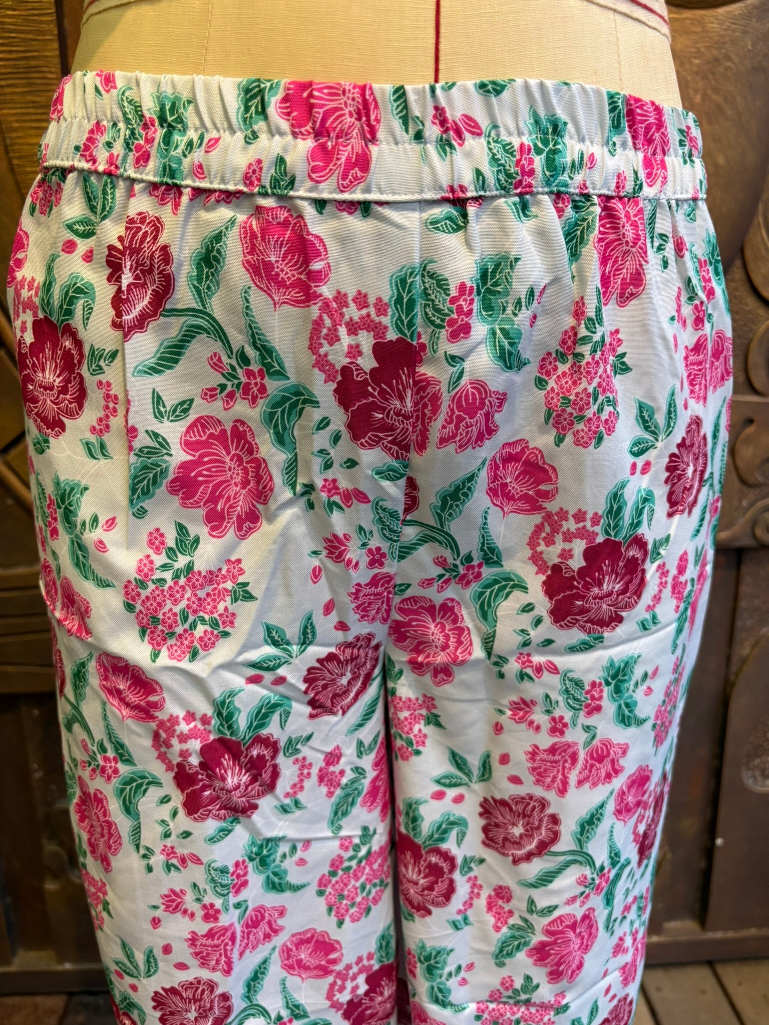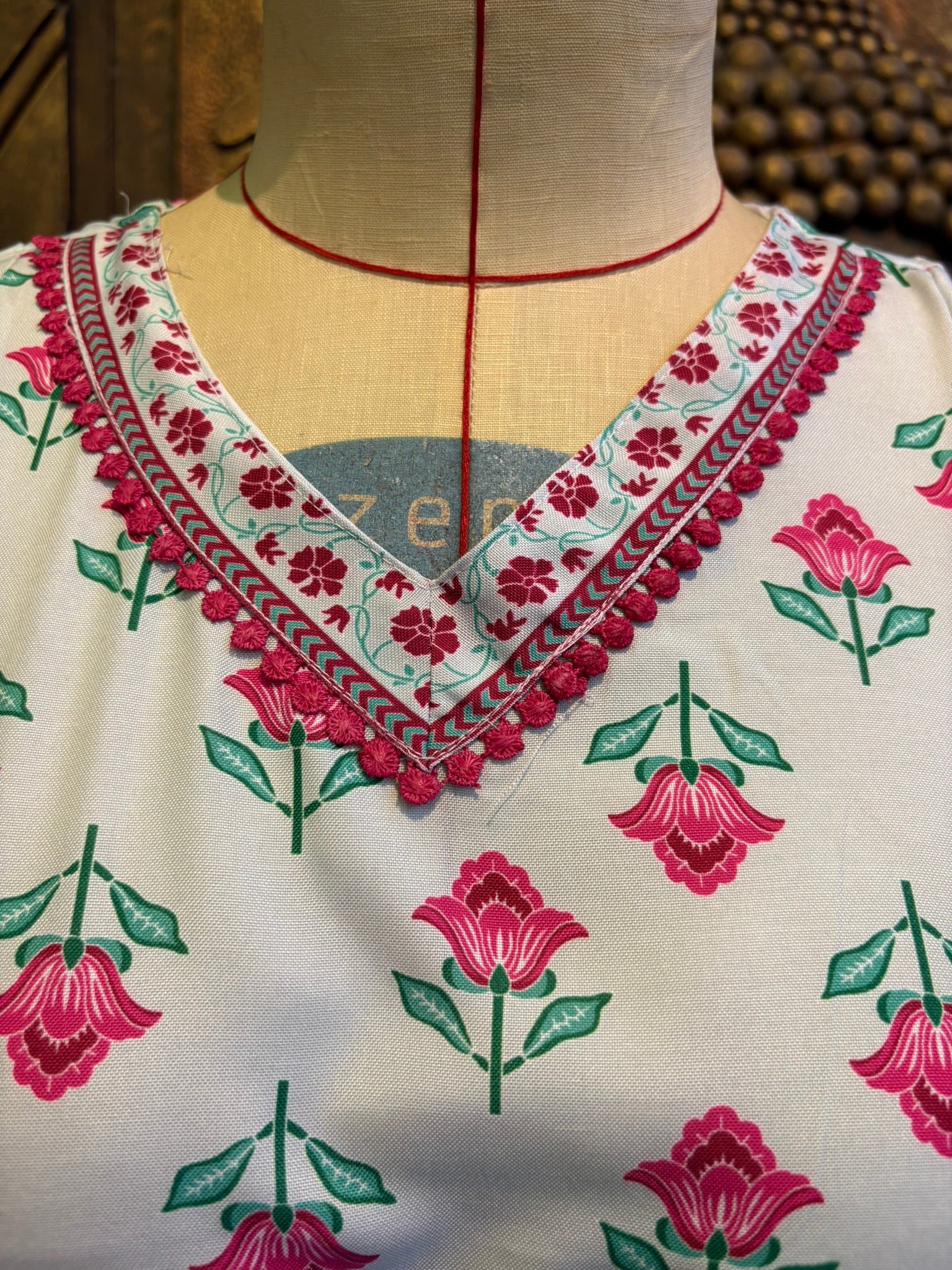 - Color: The primary color of this outfit is white or off-white, with prints in various shades of pink and green, and a contrasting border in a deep teal or turquoise.