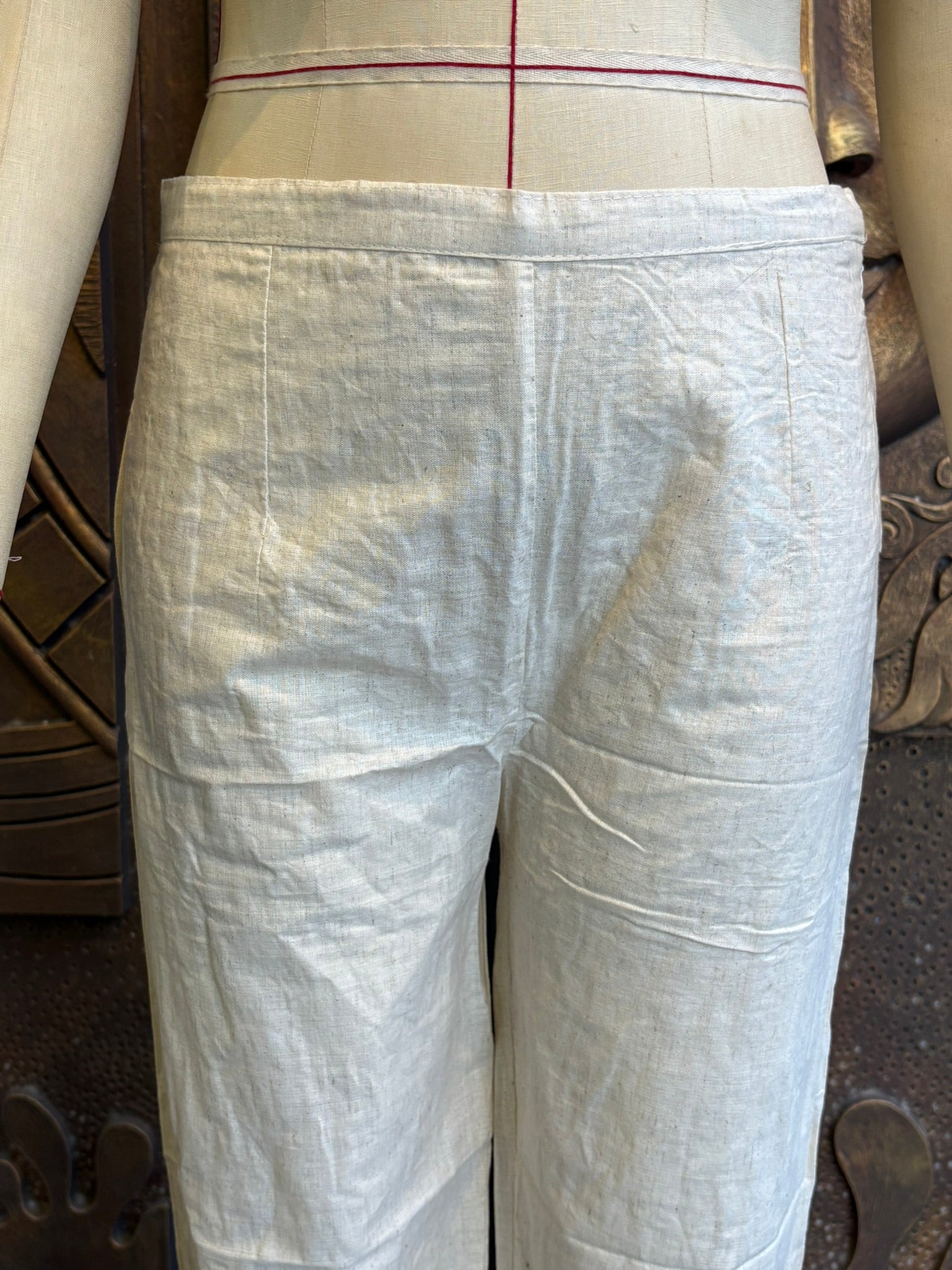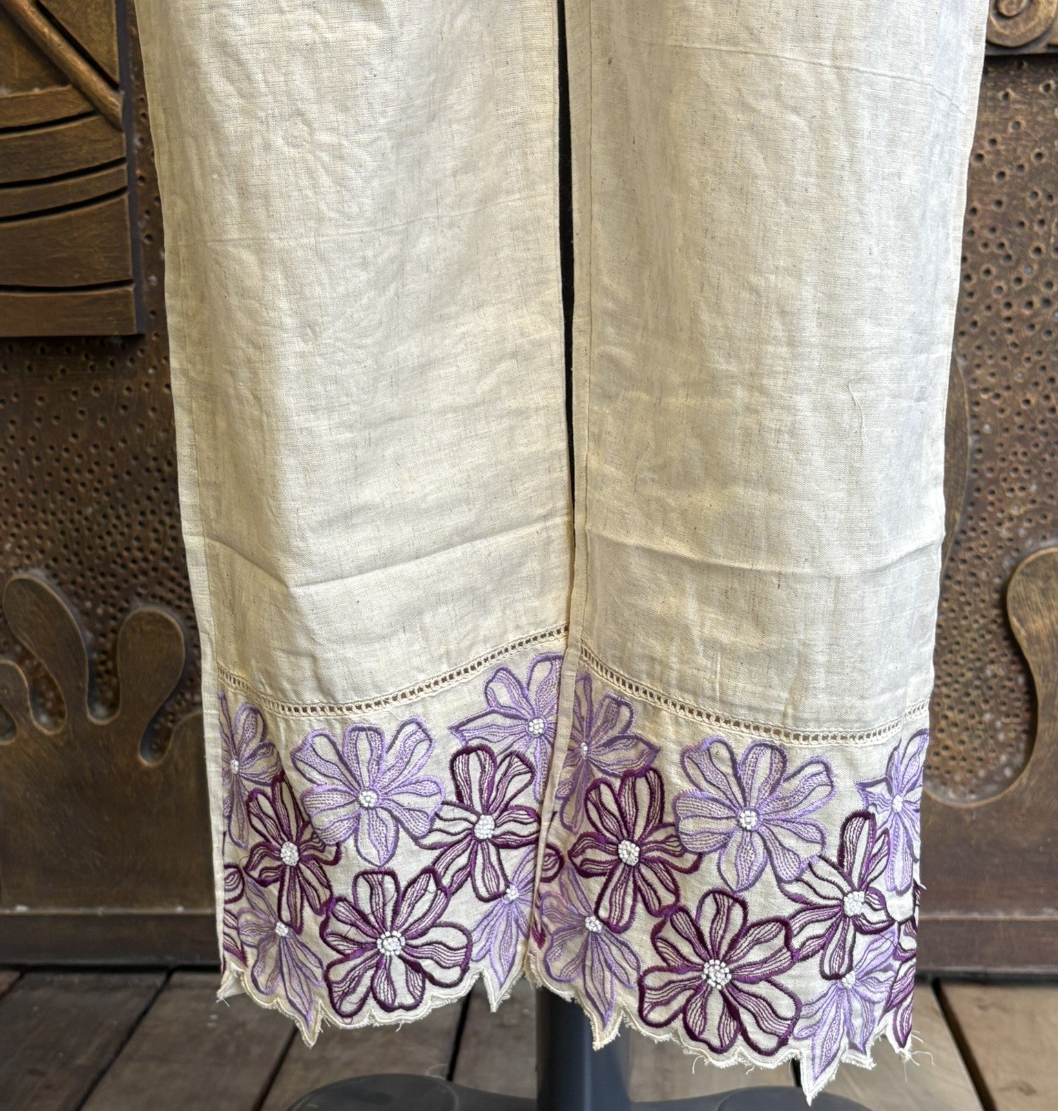 - Prints/Details: The kurta features two large embroidered floral motifs on the front in purple. The pants have a matching embroidered floral cutwork pattern at the hem.