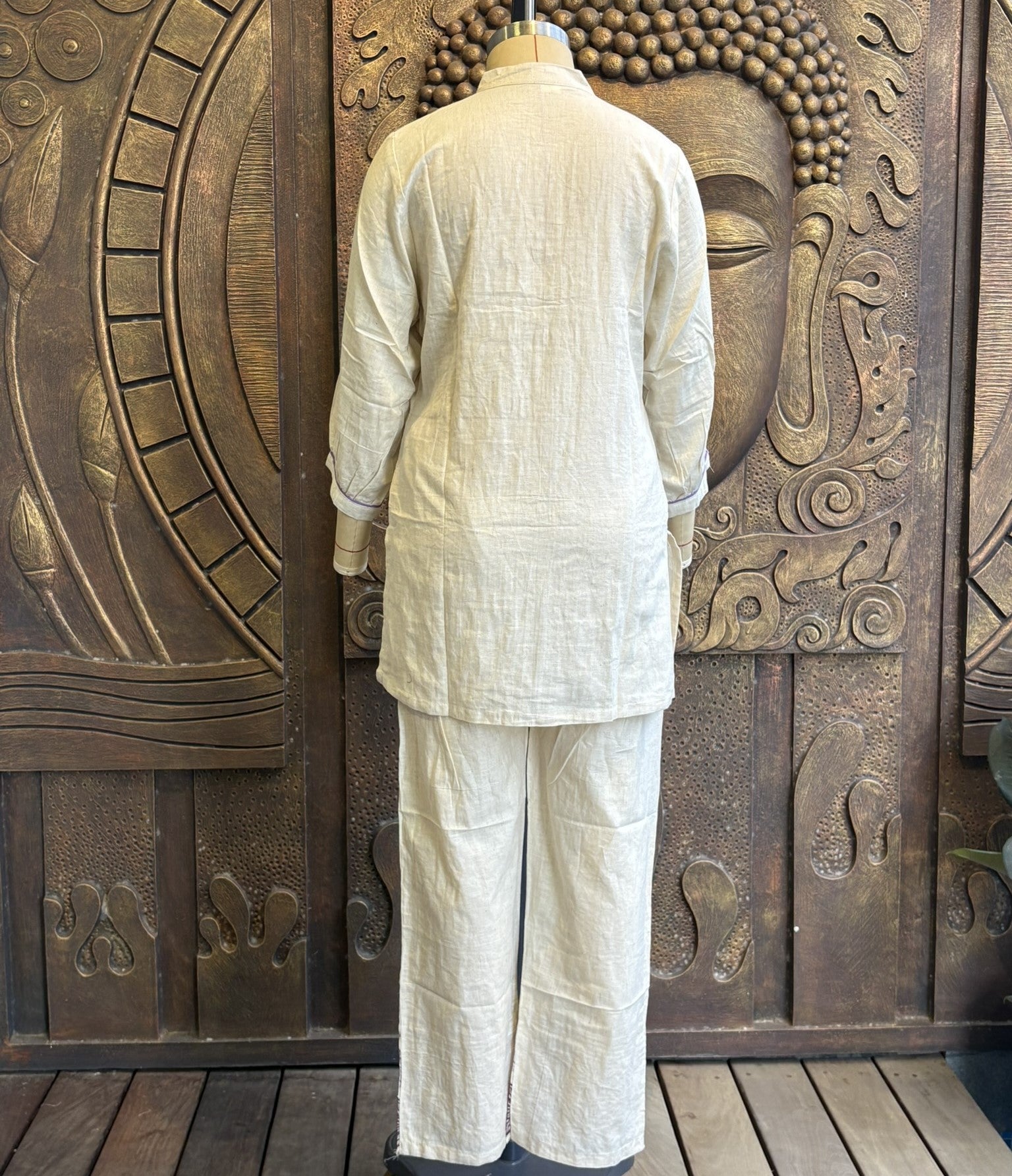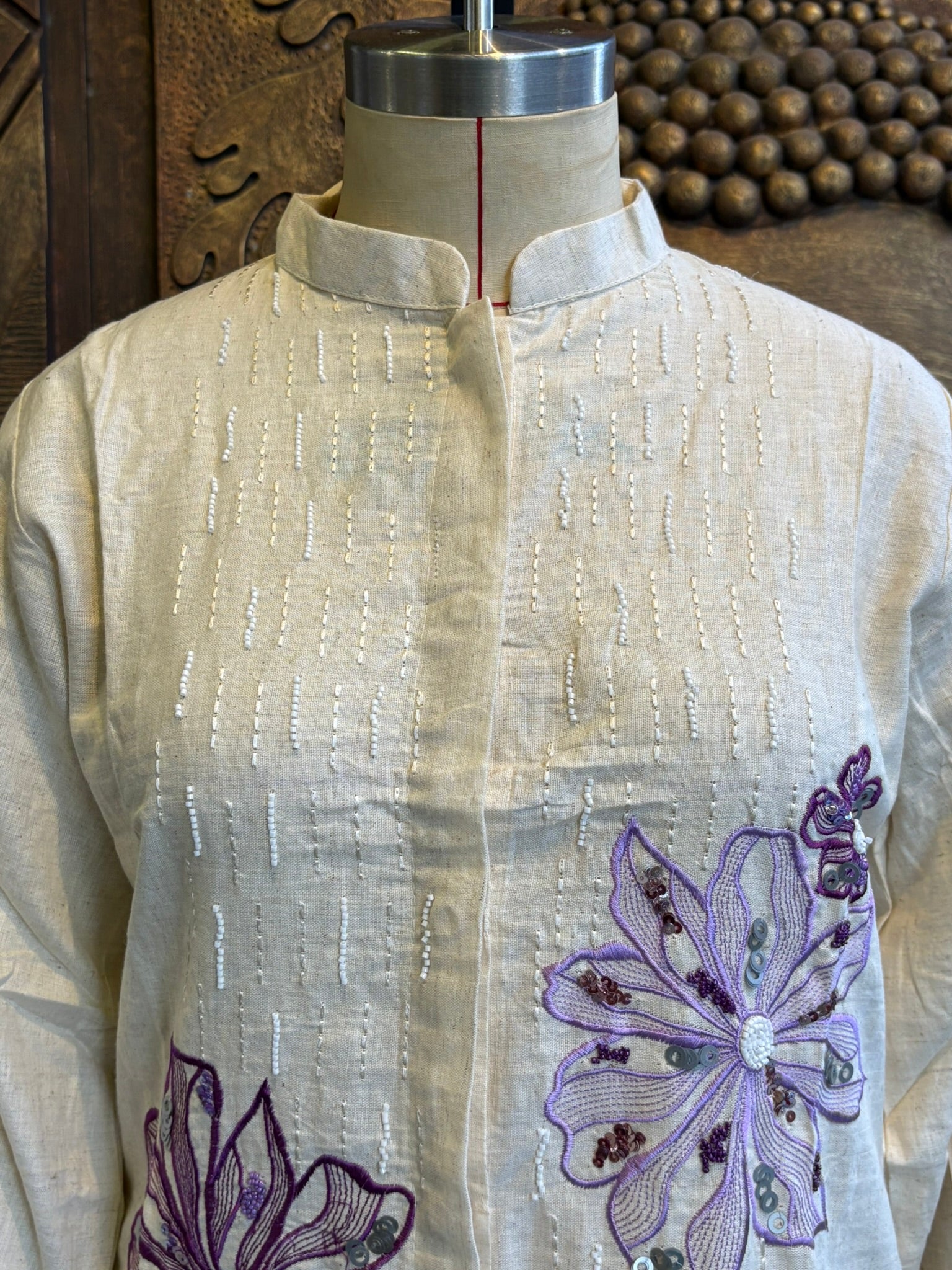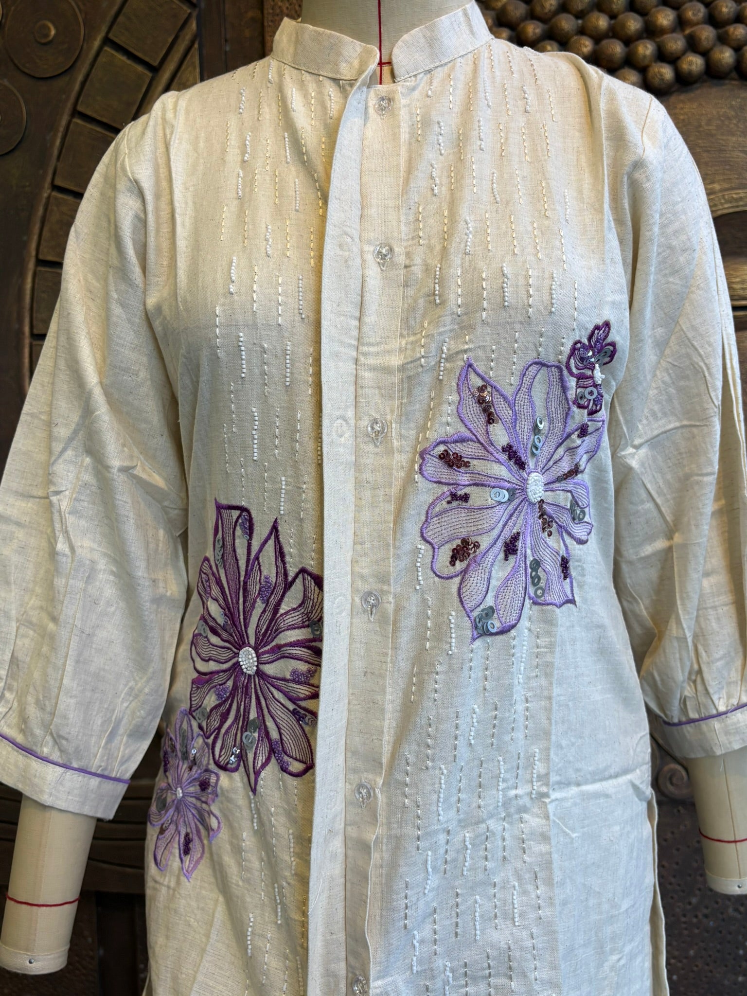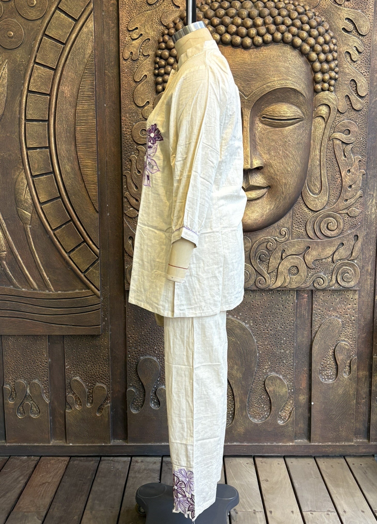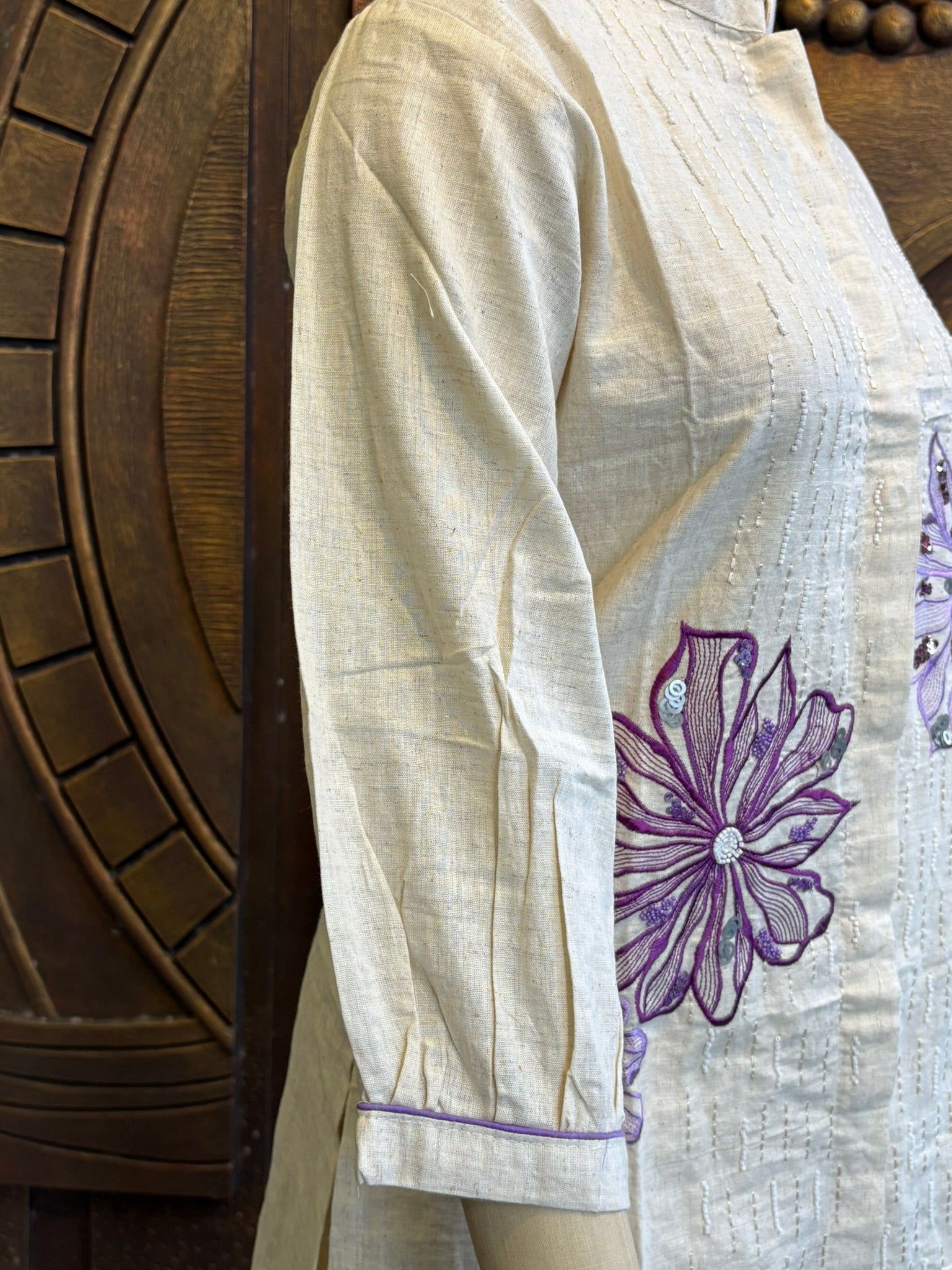 Blossom with effortless grace in this beautiful beige coord set, detailed with delicate purple embroidery that adds a touch of artistic charm.