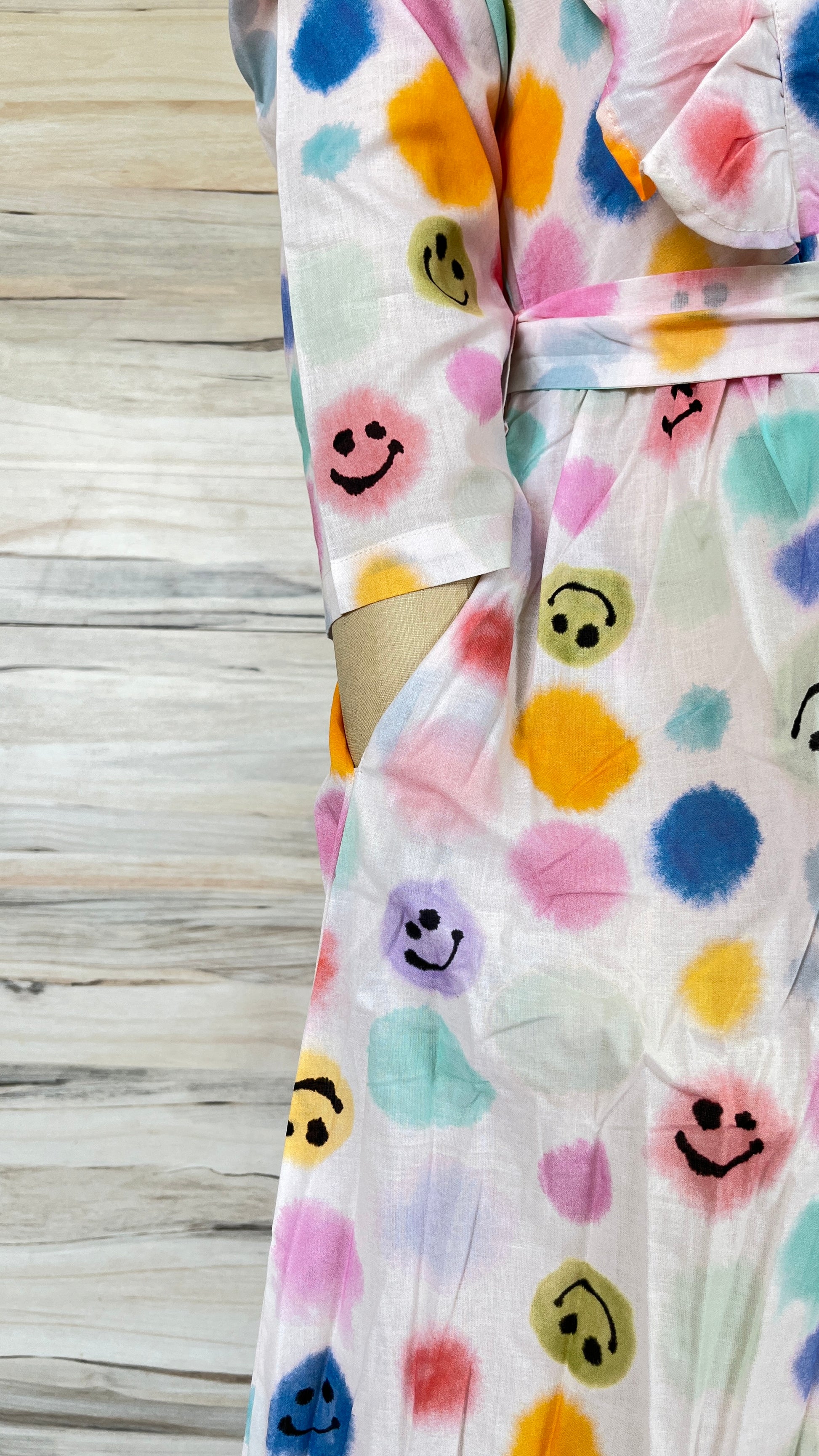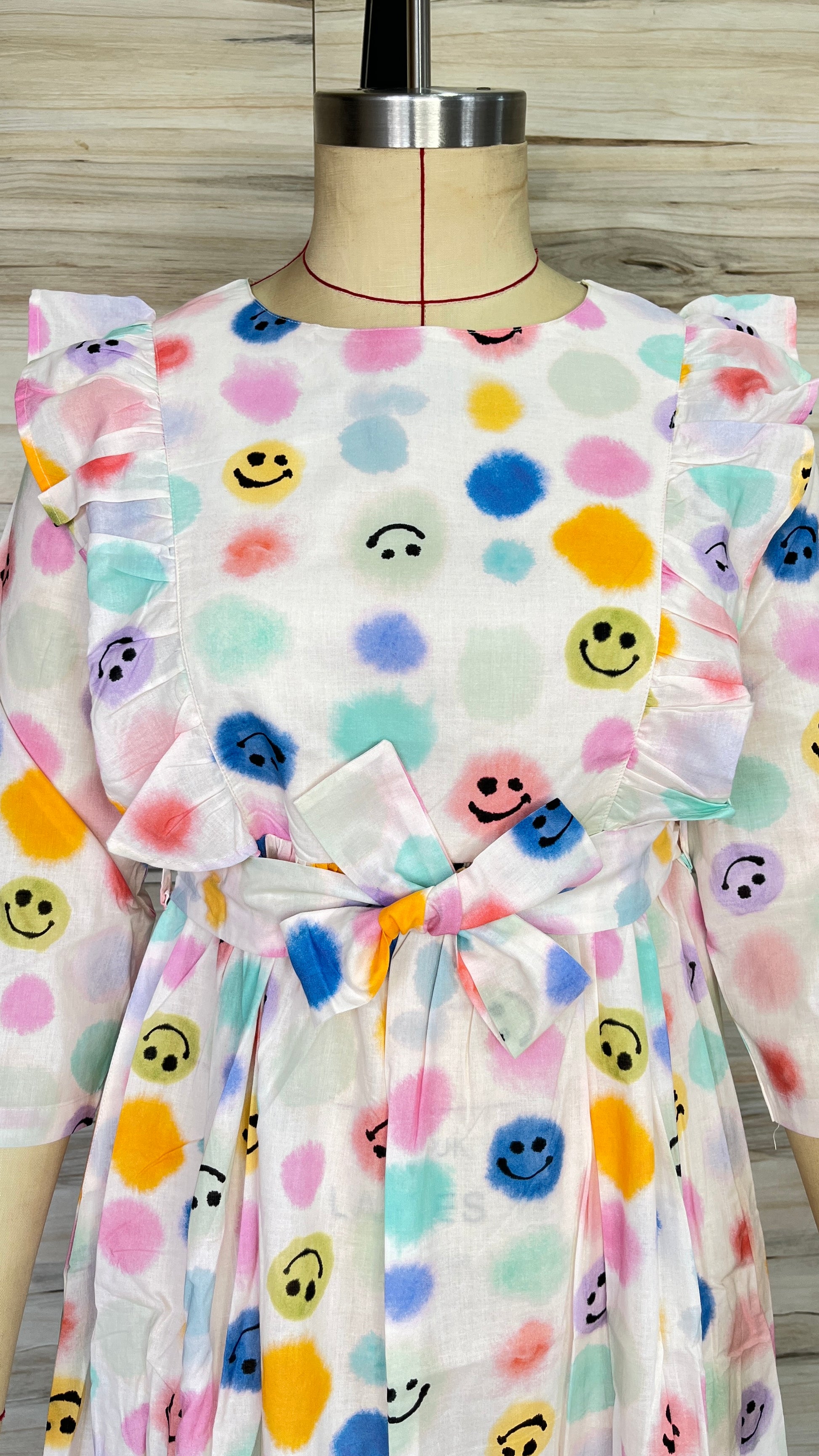 - Prints/Details: An all-over print featuring multi-color polka dots with various smiley face expressions. The dress also has ruffled details on the shoulders and a tiered skirt with a ruffled hem.