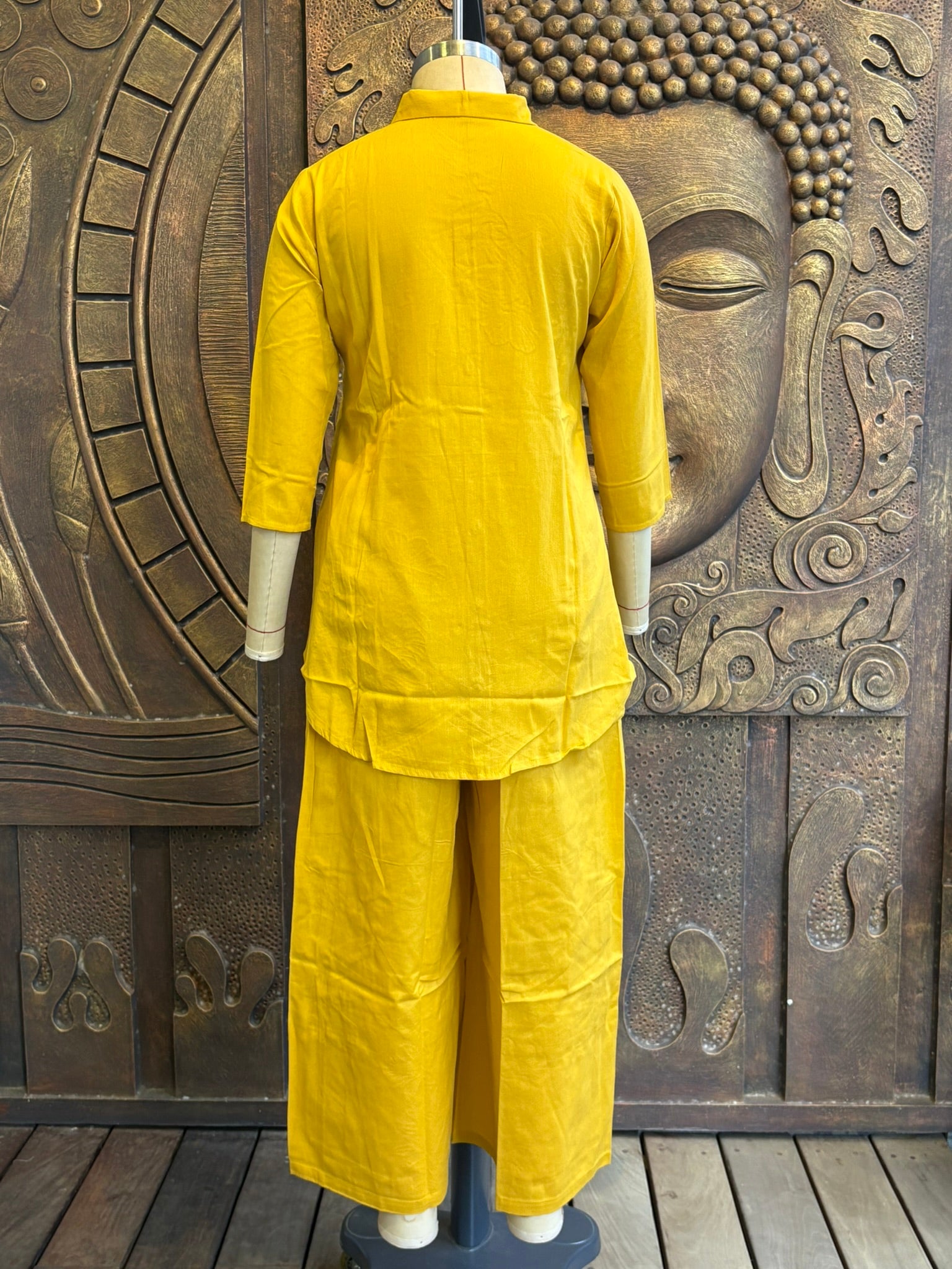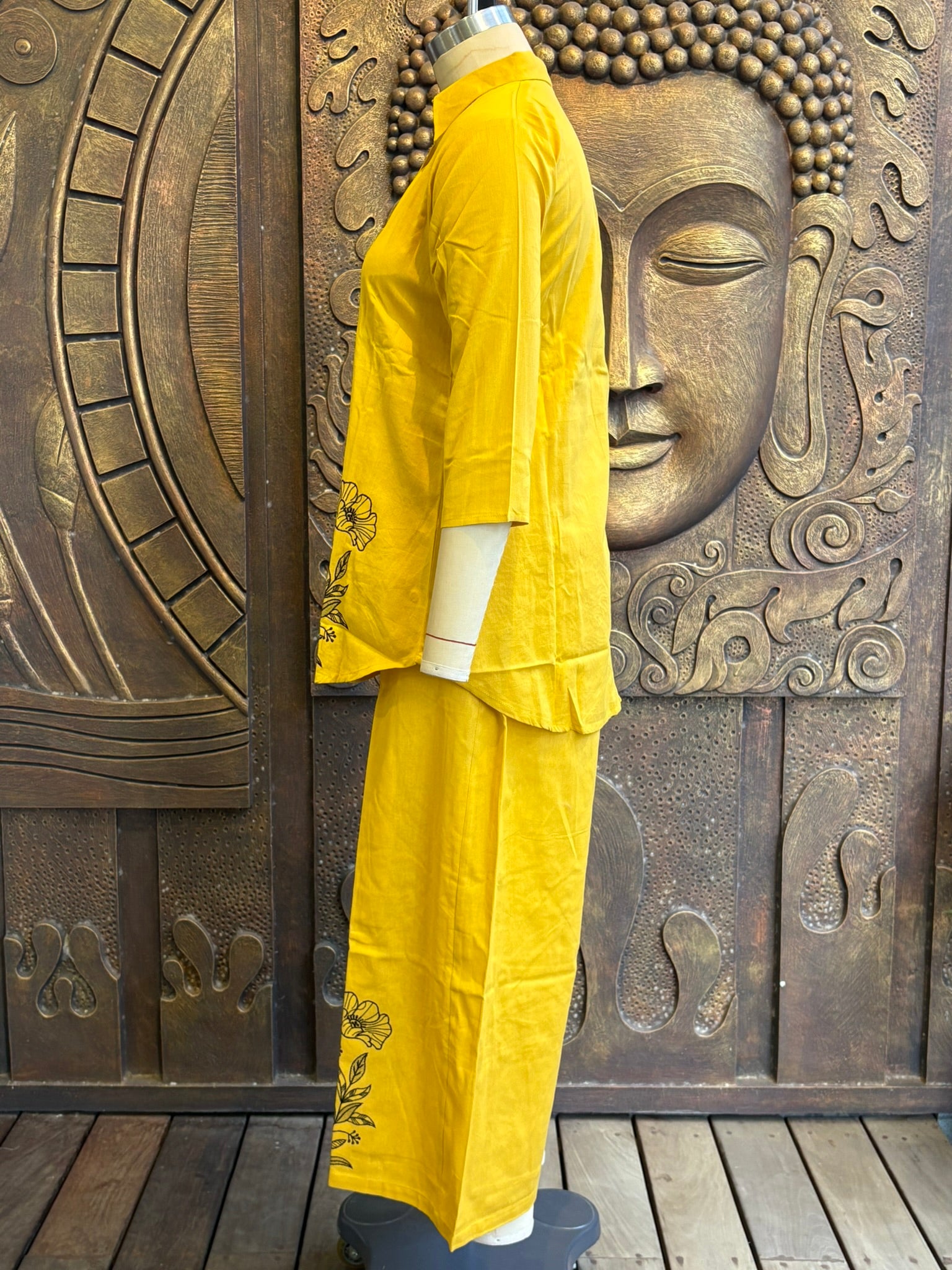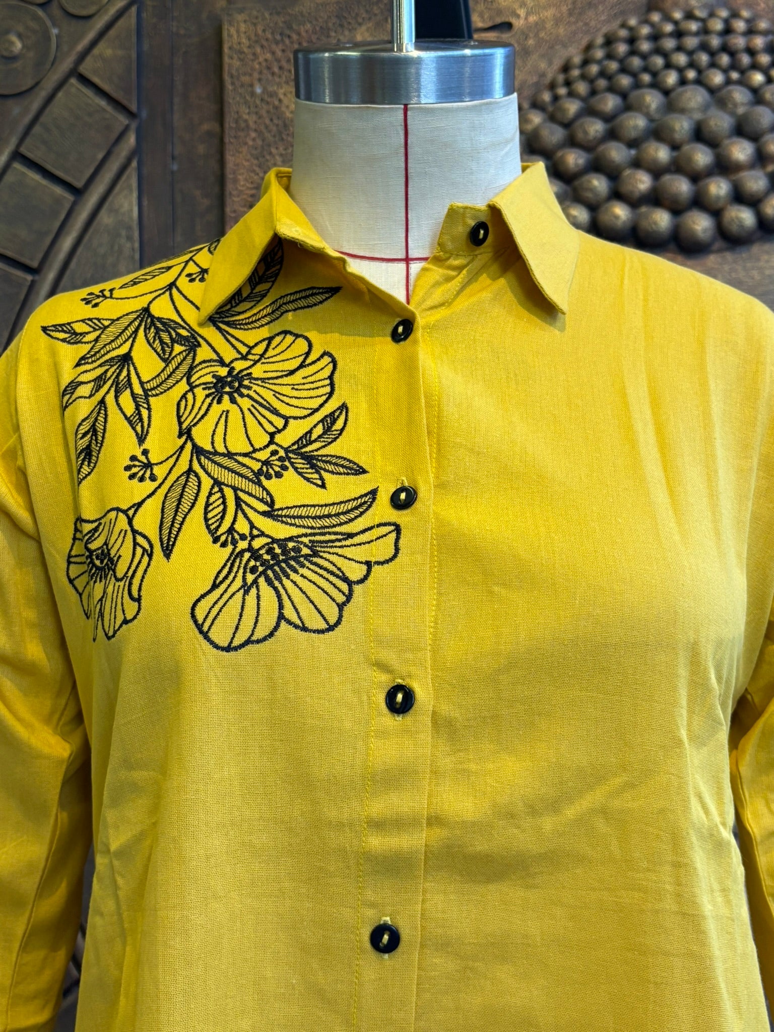 Radiate sunshine in our mustard yellow coord set, a modern statement piece adorned with elegant floral embroidery for effortless style.